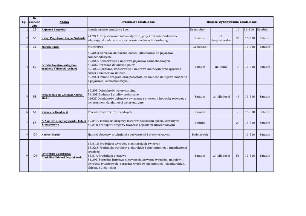 Lp. Nr ewidenc yjny Nazwa Przedmiot działalności 1 22 Rajmund