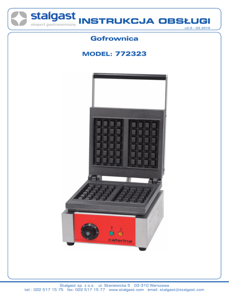 INSTRUKCJA OBSŁUGI v2.0 - 03.2010 Gofrownica MODEL: 772323 Stalgast sp. z o.o. ul. Staniewicka 5 03-310 Warszawa tel.: 022 517 15 75 fax: 022 517 15 77 www.stalgast.com email: [email protected] Dziękujemy Państwu za zakup naszego produktu. Przed pierwszym użyciem prosimy dokładnie zapoznać się z niniejszą instrukcją obsługi. Kopiowanie niniejszej instrukcji bez zgody producenta jest zabronione. Zdjęcia oraz rysunki mają charakter poglądowy i mogą różnić się od zakupionego urządzenia. UWAGA: Instrukcję należy przechowywać w bezpiecznym oraz dostępnym dla personelu miejscu. Producent zastrzega sobie prawo do zmiany parametrów technicznych urządzeń bez zapowiedzi. 1. Instrukcje bezpieczeństwa •• Nieprawidłowa obsługa i niewłaściwe użytkowanie może spowodować poważne uszkodzenie urządzenia lub zranienie osób. •• Urządzenie może być stosowane wyłącznie w celu, do którego zostało zaprojektowane. •• Producent nie ponosi żadnej odpowiedzialności za szkody spowodowane nieprawidłową obsługą i niewłaściwym użytkowaniem urządzenia. •• W czasie użytkowania zabezpiecz urządzenie i wtyczkę kabla zasilającego przed kontaktem z wodą lub innymi płynami. W przypadku, gdyby przez nieuwagę urządzenie wpadło do wody, należy natychmiast wyciągnąć wtyczkę z kontaktu, a następnie zlecić kontrolę urządzenia specjaliście. Nieprzestrzeganie tej instrukcji może spowodować zagrożenie życia. •• •• •• •• •• •• •• •• •• •• •• •• •• •• Nigdy nie otwieraj samodzielnie obudowy urządzenia. Nie wtykaj żadnych przedmiotów w obudowę urządzenia. Nie dotykaj wtyczki kabla zasilającego wilgotnymi rękami. Regularnie kontroluj stan wtyczki i kabla. W przypadku wykrycia uszkodzenia wtyczki lub kabla, zleć naprawę w wyspecjalizowanym punkcie naprawczym. W przypadku, gdy urządzenie spadnie lub ulegnie uszkodzeniu w inny sposób, przed dalszym użytkowaniem zawsze zleć przeprowadzenie kontroli i ewentualną naprawę w wyspecjalizowanym punkcie naprawczym. Nigdy nie naprawiaj urządzenia samodzielnie - może to spowodować zagrożenie życia. Chroń kabel zasilający przed kontaktem z ostrymi lub gorącymi przedmiotami i chroń go z dala od otwartego ognia. Jeżeli chcesz odłączyć urządzenie z kontaktu, zawsze chwytaj za wtyczkę, nigdy nie ciągnij za kabel. Zabezpiecz kabel (lub przedłużacz), aby nikt przez omyłkę nie wyciągnął go z kontaktu lub się o niego nie potknął. Kontroluj funkcjonowanie urządzenia w czasie użytkowania. Nie należy zezwalać na użytkowanie urządzenia przez osoby niepełnoletnie, osoby upośledzone fizycznie lub umysłowo oraz upośledzone pod względem zdolności ruchowej, a także osoby nieposiadające odpowiedniego doświadczenia i wiedzy dotyczącej właściwego użytkowania urządzenia. Wyżej wymienione osoby mogą obsługiwać urządzenie jedynie pod nadzorem osoby odpowiedzialnej za bezpieczeństwo. Jeżeli urządzenie nie jest w danej chwili użytkowane lub jest właśnie czyszczone, zawsze odłącz je od źródła zasilania, wyciągając wtyczkę z kontaktu. Uwaga : Jeżeli wtyczka kabla zasilającego jest podłączona do kontaktu, urządzenie cały czas pozostaje pod napięciem. Wyłącz urządzenie, zanim wyciągniesz wtyczkę z kontaktu. Nigdy nie ciągnij urządzenia za kabel zasilający. 2. dane techniczne Model Wymiary (mm) Moc (kW) Zasilanie (V) Częstotliwość (Hz) Waga (kg) 772323 310x420x230 1,9 230 50 21 3. Instalacja i ustawienie urządzenia •• Przed instalacją usunąć folię zabezpieczającą z wszystkich części urządzenia. •• Urządzenie należy ustawić na poziomej stabilnej i niepalnej powierzchni (np. kontuarze, stole roboczym itp.) •• Podłączyć urządzenie do gniazda sieciowego 230V z zabezpieczeniem różnicowo-prądowym. UWAGA: URZĄDZENIE MUSI BYĆ PODŁĄCZONE DO GNIAZDA Z UZIEMIENIEM. -2- 4. Używanie, obsługa i przeznaczenie urządzenia 4.1. Przeznaczenie urządzenia Urządzenie przeznaczone jest do pieczenia gofrów. 4.2. Panel 3 1. Pokrętło termostatu 2. Kontrolka zasilania 3. Kontrolka pracy elementów grzewczych 4.3. Obsługa UWAGA: Nie używać urządzenia w celach niezgodnych z przeznaczeniem. Urządzenie powinno być obsługiwane przez osoby, które zapoznały się z niniejszą instrukcją. •• •• •• •• •• •• •• •• •• •• Upewnić się że „0” na pokrętle termostatu (1) znajduje się w pozycji oznaczonej kropką na obudowie. Włożyć wtyczkę do gniazda sieciowego. Ustawić pokrętło termostatu na 250 - 300°C (zapali się pomarańczowa kontrolka). Odczekać aż pomarańczowa kontrolka zgaśnie (co oznacza osiągnięcie ustawionej temperatury). Kontrolka zapali się ponownie kiedy temperatura urządzenia spadnie o ok. 15°C i termostat ponownie włączy grzałki. Podnieść górną formę i rozpylić na dolnej trochę oleju roślinnego. Wlać do dolnej formy odpowiednie ciasto tak aby została całkowicie zakryta Zamknąć górną formę, gofry są gotowe po kilku minutach. W krótkich okresach przerwy nie należy całkowicie wyłączać urządzenia a tylko przestawić termostat na 50°C pozwoli to zaoszczędzić energię i czas. Po zakończeniu pracy należy przestawić termostat na 0°C i wyjąć wtyczkę z gniazda sieciowego. Przed rozpoczęciem innych czynności należy odczekać aż urządzenie ostygnie do temperatury pokojowej. Zaleca się używanie produktu w pomieszczeniu o temperaturze z zakresu od -5°C do +40°C i wilgotności do 65%. UWAGA! Temperatura form w czasie pracy osiąga 300°C należy otwierać i zamykać formy wyłącznie przy pomocy uchwytów. 5. Okresowa obsługa i czyszczenie (powinno być przeprowadzane przez użytkownika) Codziennie po zakończeniu pracy należy: •• ustawić termostat na 0, wyłącz urządzenia za pomocą wyłącznik (4) i wyjąć wtyczkę z gniazda sieciowego. •• czyszczenie n