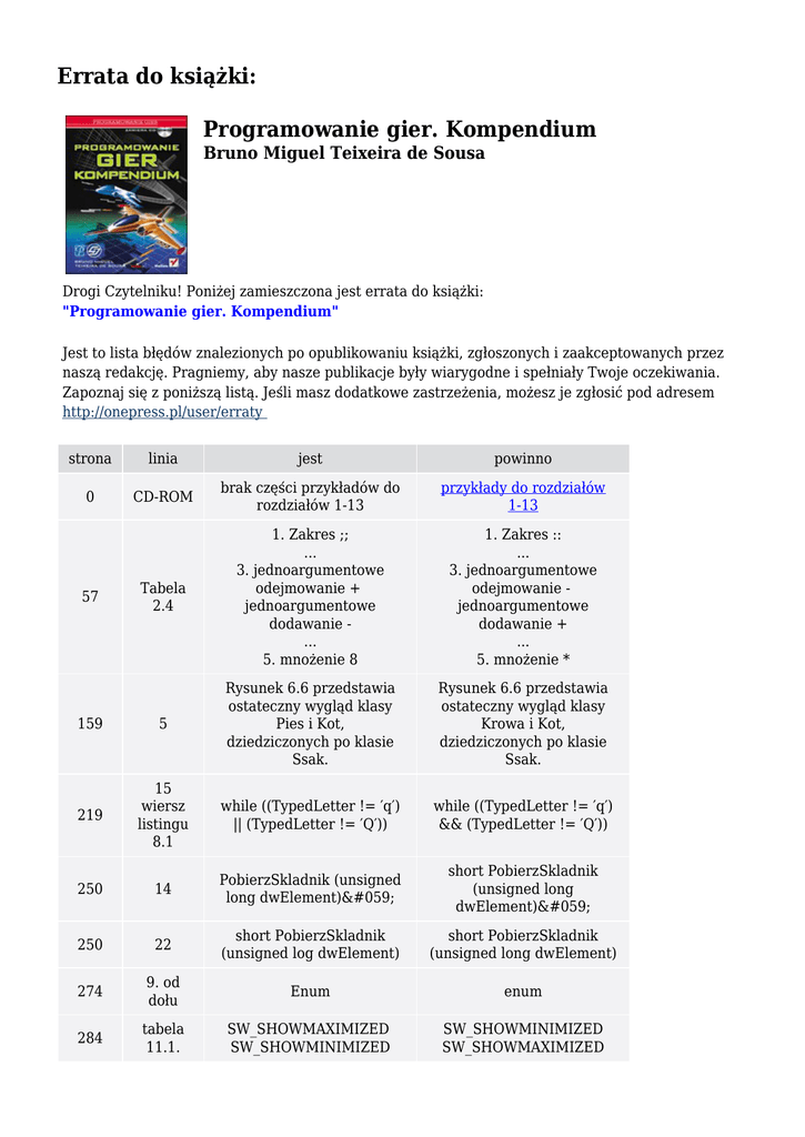 Errata do książki: Programowanie gier. Kompendium Bruno Miguel Teixeira de Sousa Drogi Czytelniku! Poniżej zamieszczona jest errata do książki: "Programowanie gier. Kompendium" Jest to lista błędów znalezionych po opublikowaniu książki, zgłoszonych i zaakceptowanych przez naszą redakcję. Pragniemy, aby nasze publikacje były wiarygodne i spełniały Twoje oczekiwania. Zapoznaj się z poniższą listą. Jeśli masz dodatkowe zastrzeżenia, możesz je zgłosić pod adresem http://onepress.pl/user/erraty strona linia jest powinno 0 CD-ROM brak części przykładów do rozdziałów 1-13 przykłady do rozdziałów 1-13 Tabela 2.4 1. Zakres ;; ... 3. jednoargumentowe odejmowanie + jednoargumentowe dodawanie ... 5. mnożenie 8 1. Zakres :: ... 3. jednoargumentowe odejmowanie jednoargumentowe dodawanie + ... 5. mnożenie * 159 5 Rysunek 6.6 przedstawia ostateczny wygląd klasy Pies i Kot, dziedziczonych po klasie Ssak. Rysunek 6.6 przedstawia ostateczny wygląd klasy Krowa i Kot, dziedziczonych po klasie Ssak. 219 15 wiersz listingu 8.1 while ((TypedLetter != ′q′) || (TypedLetter != ′Q′)) while ((TypedLetter != ′q′) && (TypedLetter != ′Q′)) 250 14 PobierzSkladnik (unsigned long dwElement); short PobierzSkladnik (unsigned long dwElement); 250 22 short PobierzSkladnik (unsigned log dwElement) short PobierzSkladnik (unsigned long dwElement) 274 9. od dołu Enum enum 284 tabela 11.1. SW_SHOWMAXIMIZED SW_SHOWMINIMIZED SW_SHOWMINIMIZED SW_SHOWMAXIMIZED 57 295 38 37: 37: }: 297 13. Aplikacja może mieć być uruchomiona Aplikacja może być uruchomiona 297 9. od dołu nie używamy już także nShowCmd z WimnMain nie używamy już także nShowCmd z WinMain 325 11. pozwala na wybrani pozwala na wybranie Poniżej znajduje się lista błędów znalezionych przez czytelników, ale jeszcze nie potwierdzonych przez Redakcję: strona linia jest powinno 46 5 std::in jest podobny do std::out, std::cin jest podobny do std::cout, 733 4 7. Wskaźnik wskazuje element piąty. 7. Wskaźnik wskazuje element szósty.