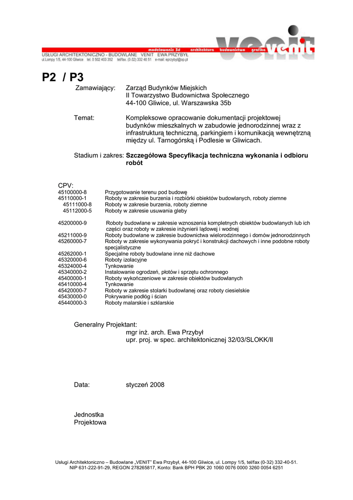 P2 / P3 Zamawiający: Zarząd Budynków Miejskich II Towarzystwo Budownictwa Społecznego 44-100 Gliwice, ul. Warszawska 35b Temat: Kompleksowe opracowanie dokumentacji projektowej budynków mieszkalnych w zabudowie jednorodzinnej wraz z infrastrukturą techniczną, parkingiem i komunikacją wewnętrzną między ul. Tarnogórską i Podlesie w Gliwicach. Stadium i zakres: Szczegółowa Specyfikacja techniczna wykonania i odbioru robót CPV: 45100000-8 45110000-1 45111000-8 45112000-5 Przygotowanie terenu pod budowę Roboty w zakresie burzenia i rozbiórki obiektów budowlanych, roboty ziemne Roboty w zakresie burzenia, roboty ziemne Roboty w zakresie usuwania gleby 45200000-9 Roboty budowlane w zakresie wznoszenia kompletnych obiektów budowlanych lub ich części oraz roboty w zakresie inżynierii lądowej i wodnej Roboty budowlane w zakresie budownictwa wielorodzinnego i domów jednorodzinnych Roboty w zakresie wykonywania pokryć i konstrukcji dachowych i inne podobne roboty specjalistyczne Specjalne roboty budowlane inne niż dachowe Roboty izolacyjne Tynkowanie Instalowanie ogrodzeń, płotów i sprzętu ochronnego Roboty wykończeniowe w zakresie obiektów budowlanych Tynkowanie Roboty w zakresie stolarki budowlanej oraz roboty ciesielskie Pokrywanie podłóg i ścian Roboty malarskie i szklarskie 45211000-9 45260000-7 45262000-1 45320000-6 45324000-4 45340000-2 45400000-1 45410000-4 45420000-7 45430000-0 45440000-3 Generalny Projektant: mgr inż. arch. Ewa Przybył upr. proj. w spec. architektonicznej 32/03/SLOKK/II Data: styczeń 2008 Jednostka Projektowa Usługi Architektoniczno – Budowlane „VENIT” Ewa Przybył, 44-100 Gliwice, ul. Lompy 1/5, tel/fax (0-32) 332-40-51. NIP 631-222-91-29, REGON 278265817, Konto: Bank BPH PBK 20 1060 0076 0000 3260 0054 6251 Kompleksowe opracowanie dokumentacji budynków mieszkalnych w zabudowie jednorodzinnej wraz z infrastrukturą techniczną, parkingiem, komunikacją wewnętrzną, między ul. Tarnogórską i Podlesie w Gliwicach Szczegółowa Specyfikacja techniczna wykonania i odbioru robót budowlanych SPIS SPECYFIKACJI P2/P3 P2/P3.01. Przygotowanie terenu P2/P3.02. Roboty ziemne P2/P3.03. Roboty betonowe i zbrojarskie P2/P3.04. Roboty izolacyjne P2/P3.05. Roboty murowe P2/P3.06. Konstrukcje stalowe P2/P3.07. Konstrukcje drewniane P2/P3.08. Stolarka okienna i drzwiowa P2/P3.09. Roboty tynkarskie P2/P3.10. Roboty posadzkarskie, glazura P2/P3.11. Roboty okładzinowe zewnętrzne, obudowa GK poddasza P2/P3.12. Roboty malarskie, powłoki ochronne P2/P3.13. Roboty dekarskie, pokrycie dachu, odwodnienie zewnętrzne P2/P3.14. Wentylacja Usługi Architektoniczno – Budowlane VENIT Ewa Przybył, ul. Lompy 1/5, 44-100 Gliwice Strona 1 z 1 Kompleksowe opracowanie dokumentacji budynków mieszkalnych w zabudowie jednorodzinnej wraz z infrastrukturą techniczną, parkingiem, komunikacją wewnętrzną, między ul. Tarnogórską i Podlesie w Gliwicach Szczegółowa Specyfikacja techniczna wykonania i odbioru robót budowlanych P2/P3.01 PRZYGOTOWANIE TERENU SPIS TREŚCI: 1. Przedmiot i zakres specyfikacji ................................................................................................... 2 1.1. Przedmiot specyfikacji ............................................................................................................. 2 1.2. Zakres stosowania specyfikacji................................................................................................ 2 1.3. Zakres robót objętych specyfikacją .......................................................................................... 2 1.4. Określenia podstawowe .......................................................................................................... 2 1.5. Ogólne wymagania dotyczące robót ........................................................................................ 2 1.6. Dokumentacja, którą należy przedstawić w trakcie budowy...................................................... 2 2. Materiały ....................................................................................................................................... 3 3. Sprzęt............................................................................................................................................ 3 3.1. Ogólne wymagania dotyczące sprzętu..................................................................................... 3 3.2. Sprzęt niezbędny do wykonania robót geodezyjnych ............................................................... 3 3.3. Sprzęt do zdjęcia humusu ....................................................................................................... 3 4. Transport ...................................................................................................................................... 3 5. Wykonanie robót .......................................................................................................................... 4 5.1. Wymagania ogólne.................................................................................................................. 4 5.2. Sprawdzenie zgodności warunków terenowych z projektowymi ............................................... 4 5.3. Roboty przygotowawcze .......................................................................................................... 4 5.4. Zdjęcie warstwy humusu ......................................................................................................... 5 6. Kontrola jakości robót.................................................................................................................. 5 6.1. Ogólne zasady kontroli jakości robót........................................................................................ 5 6.2. Kontrola usunięcia humusu ..................................................................................................... 6 6.3. Kontrola prac pomiarowych .........................................