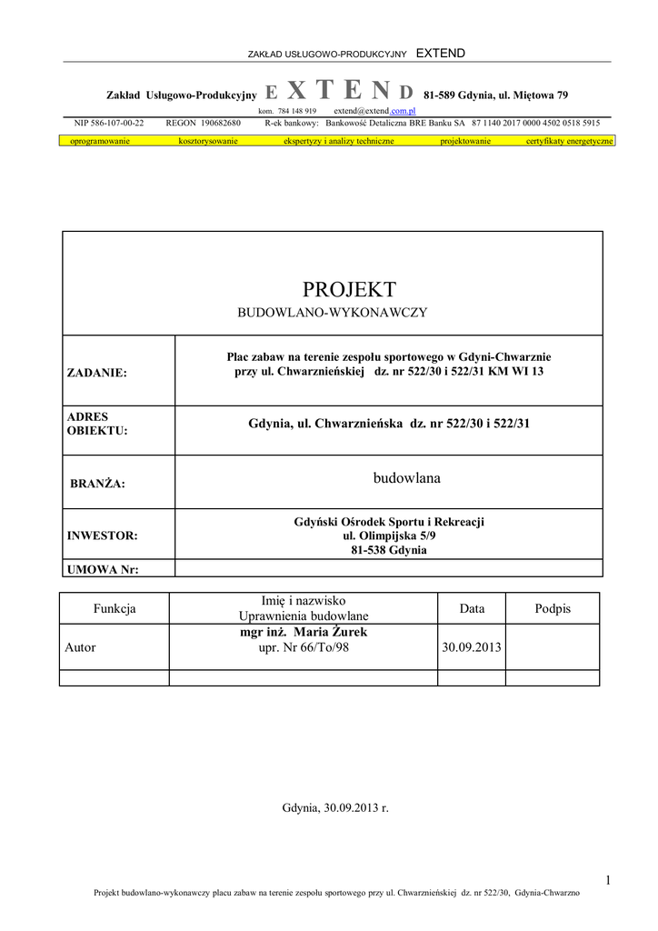 ZAKŁAD USŁUGOWO-PRODUKCYJNY Zakład Usługowo-Produkcyjny E XTEN D EXTEND 81-589 Gdynia, ul. Miętowa 79 [email protected] R-ek bankowy: Bankowość Detaliczna BRE Banku SA 87 1140 2017 0000 4502 0518 5915 kom. 784 148 919 NIP 586-107-00-22 oprogramowanie REGON 190682680 kosztorysowanie ekspertyzy i analizy techniczne projektowanie certyfikaty energetyczne PROJEKT BUDOWLANO-WYKONAWCZY ZADANIE: ADRES OBIEKTU: Plac zabaw na terenie zespołu sportowego w Gdyni-Chwarznie przy ul. Chwarznieńskiej dz. nr 522/30 i 522/31 KM WI 13 Gdynia, ul. Chwarznieńska dz. nr 522/30 i 522/31 budowlana BRANŻA: INWESTOR: Gdyński Ośrodek Sportu i Rekreacji ul. Olimpijska 5/9 81-538 Gdynia UMOWA Nr: Funkcja Autor Imię i nazwisko Uprawnienia budowlane mgr inż. Maria Żurek upr. Nr 66/To/98 Data Podpis 30.09.2013 Gdynia, 30.09.2013 r. 1 Projekt budowlano-wykonawczy placu zabaw na terenie zespołu sportowego przy ul. Chwarznieńskiej dz. nr 522/30, Gdynia-Chwarzno ZAKŁAD USŁUGOWO-PRODUKCYJNY EXTEND ZAWARTOŚĆ OPRACOWANIA 1. Akty formalno-prawne 2. Opis techniczny 3. Rysunki A-1 A-2 A-3 Plan zagospodarowania Rozmieszczenie urządzeń i wyposażenia Rzuty i przekroje stanowisk urządzeń skala skala skala 1:500 1:200 1:50 4. Zestawienie urządzeń – certyfikat huśtawki – karta techniczna huśtawki podwójnej – instrukcja montażu huśtawki podwójnej – certyfikat bujaka – karta techniczna bujaka – instrukcja montażu bujaka – certyfikat zjeżdżalni – karta techniczna zjeżdżalni – instrukcja montażu zjeżdżalni 2 Projekt budowlano-wykonawczy placu zabaw na terenie zespołu sportowego przy ul. Chwarznieńskiej dz. nr 522/30, Gdynia-Chwarzno ZAKŁAD USŁUGOWO-PRODUKCYJNY EXTEND OPIS TECHNICZNY do projektu budowlano-wykonawczego PLAC ZABAW NA TERENIE ZESPOŁU SPORTOWEGO w Gdyni-Chwarznie Gdynia, ul. Chwarznieńska dz. nr 522/30 i 522/31 KM WI 13 1. Podstawa opracowania. Zlecenie Inwestora – Gdyński Ośrodek Sportu i Rekreacji w Gdyni przy ul. Olimpijskiej 5/9 Mapa sytuacyjna Normy branżowe 2. Przedmiot i zakres opracowania. Przedmiotem opracowania jest projekt placu zabaw na terenie istniejącego zespołu sportowego w Gdyni-Chwarznie przy ul. Chwarznieńskiej dz. nr 522/30 KM WI 13. Celem opracowania jest urządzenie placu zabaw dla bardziej zróżnicowanej wiekowo grupy użytkowników, niż dotychczas oraz wyposażenie placu w zróżnicowane i atrakcyjne urządzenia do zabaw, jak również uzyskanie efektu miłego, kameralnego miejsca, chętnie odwiedzanego przez mieszkańców. 3. Podstawowe założenia projektowe Projektuje się wyposażenie placu zabaw w następujące urządzenia: - w I etapie huśtawka podwójna bujak sprężynowy przeniesienie stołu do ping-ponga w nowe miejsce - w II etapie – zjeżdżalnia - w dalszych etapach – urządzenia tzw. „ścieżki zdrowia” - przykładowe urządzenia podano w dalszej części projektu; ostatecznego wyboru i kolejności montażu dokona Inwestor Istniejące elementy wyposażenia placu należy wykorzystać w miarę możliwości przy urządzaniu nowego placu. Przewiduje się zachowanie trawiastej nawierzchni placu, z utwardzeniem stanowisk pod ławki i wykonaniem nawierzchni sypkiej pod stanowisko huśtawki. Bujak i zjeżdżalnia mogą mieć nawierzchnię trawiastą, gdyż maksymalna wysokość upadku z tych urządzeń nie przekracza 1 m. Dla podniesienia atrakcyjności i estetyki placu zabaw przewiduje się nasadzenia roślinności niskiej i średnio wysokiej. W dalszym etapie przewiduje się wykonanie, na koronie skarpy wzdłuż ulicy, kolejnych urządzeń o charakterze sprawnościowym dla nieco starszych dzieci, takich jak: równoważnia, zestaw do przewrotów, skałka wspinaczkowa, drabinka pozioma, zestaw „brzuch”, poręcze gimnastyczne itp. 3 Projekt budowlano-wykonawczy placu zabaw na terenie zespołu sportowego przy ul. Chwarznieńskiej dz. nr 522/30, Gdynia-Chwarzno ZAKŁAD USŁUGOWO-PRODUKCYJNY EXTEND Plac zabaw będzie mieć więc dwie strefy: – strefę typowo zabawową dla najmłodszych dzieci, wykonaną w I i II etapie, wyposażoną w huśtawkę dwuosobową i bujak sprężynowy, a w przyszłości w trzecie urządzenie, np. w zjeżdżalnię – strefę o charakterze sprawnościowym, dla nieco starszych dzieci, wyposażaną sukcesywnie w dalszych etapach w następne urządzenia /do wyboru przez Inwestora/. 4. Zagospodarowanie terenu. Urządzając zagospodarowanie placu zabaw, należy zachować wolny pas o szerokości min. 3,0 m od linii bocznej boiska do piłki nożnej. Teren placu zabaw należy wyrównać, ścinając wypukłości i zasypując wgłębienia. Fragmenty przewidywane do obsiana trawą uzupełnić ew. warstwą humusu /ziemi żyznej/, warstwą o średniej grubości 5-10 cm i obsiać na nowo trawą z domieszką kwiatów polnych, np. stokrotek, kaczeńców itp. Ławki należy rozmieścić przy projektowanym placu zabaw /4 ławki/ dwie ławki od strony wschodniej, z ekspozycją zachodnią dwie ławki od strony zachodniej, z ekspozycją wschodnią i na skarpie, przy boisku do siatkówki /2 ławki/ W obrębie placu zabaw przewiduje się nasadzenie roślinności niskiej w postaci żywopłotów o wys. 0,6 – 0,8 m z krzewów ozdobnych: od strony boiska do siatkówki od strony północnej, na skarpie ew. krótki żywopłot między stanowiskami huśtawki i przyszłościowo przewidywanej zjeżdżalni na skarpie od strony ulicy, na szerokości placu zabaw Przewiduje się nasadzenie, w rejonie ławek, niewysokich (2,0–3,0 m), ozdobnych drzew, które dadzą nieco cienia i zniwelują monotonię terenu. Na skarpie, przy placu zabaw, przewiduje się sukcesywne nasadzanie roślinności niskiej o ciekawych walorach zapachowych i kolorystycznych. Kolejny etap zagospodarowania terenu przewiduje wykonanie na skarpie, wzdłuż ogrodzenia przy ulicy, tzw. „ścieżki zdrowia”, wyposażonej w szereg urządzeń sprawnościowych, takich jak: równoważnia, zestaw do przewrotów, skałka wspinaczkowa, drabinka pozioma, zes