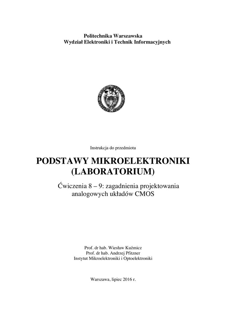 Politechnika Warszawska Wydział Elektroniki i Technik Informacyjnych Instrukcja do przedmiotu PODSTAWY MIKROELEKTRONIKI (LABORATORIUM) Ćwiczenia 8 – 9: zagadnienia projektowania analogowych układów CMOS Prof. dr hab. Wiesław Kuźmicz Prof. dr hab. Andrzej Pfitzner Instytut Mikroelektroniki i Optoelektroniki Warszawa, lipiec 2016 r. Spis treści 1 Wprowadzenie. Cel ćwiczeń 3 2 Rozrzuty produkcyjne w analogowych układach CMOS 4 2.1 Pochodzenie i wielkość rozrzutów 4 2.2 Symulacja statystyczna 4 3 Badany układ 5 4 Przebieg ćwiczeń 10 5 Uwagi końcowe 18 2 1 Wprowadzenie. Cel ćwiczeń Projektowanie analogowych układów scalonych dość znacznie różni się od projektowania układów cyfrowych. Projektowanie układów cyfrtowych często polega na składaniu układów z gotowych, zawczasu zaprojektowanych “klocków” – komórek standardowych. Pomagają w tym systemy automatyzujące projektowanie układów cyfrowych. Przy ich pomocy można w sposób automatyczny lub prawie automatyczny uzyskać projekt układu wychodząc z jego opisu fukcjonalnego w językach takich, jak Verilog lub VHDL. W przeciwieństwie do tego projektowanie układów analogowych nie poddaje się, jak dotąd, automatyzacji. Gdy potrzebny jest nowy układ analogowy, okazuje się zazwyczaj, że trzeba go zaprojektować od początku, czyli zaprojektować schemat układu, wykonać jego symulacje (i ewentualnie zrobić poprawki w projekcie), zaprojektować topografię układu (“layout”) – najczęsciej w stylu “full custom” oraz wykonać wszystkie końcowe weryfikacje i symulacje. Występują tu liczne problemy, na które nie napotyka projektant układów cyfrowych. Problemy te biorą się w dużej mierze stąd, że – w przeciwieństwie do typowych bramek cyfrowych CMOS – działanie i parametry układów analogowych silnie zależą od parametrów elementów. W szczególności, przy projektowaniu układów analogowych - bardzo duże znaczenie mają modele elementów używane w symulacji, - projekt topografii musi być bardzo przemyślany, - istotne są rozrzuty produkcyjne, - istotne mogą być efekty temperaturowe, - istotne mogą być parametry małosygnałowe, takie jak wzmocnienie, szerokość pasma, szumy itp. W ćwiczeniach 8 i 9 niektóre z tych zagadnień będą zilustrowane na przykładzie bardzo prostego wzmacniacza operacyjnego CMOS. Najpierw zbadany zostanie wzmacniacz o danym schemacie i topografii – jego charakterystyka przejściowa DC, wzmocnienie i pasmo przenoszenia oraz rozrzut produkcyjny charakterystyk. Następnie zadaniem będzie takie przeprojektowanie wzmacniacza, aby ten rozrzut został zmniejszony i zmieścił się w zadanym przedziale. Aby to było możliwe, zostanie przeprowadzona charakteryzacja statystyczna procesu produkcyjnego układu. Po przeprojektowaniu układ będzie ponownie przebadany, aby stwierdzić, czy cel został osiągnięty. W ćwiczeniach użyte będą następujące programy: edytor topografii UNCLE, ekstraktor EXCESS, symulator układów elektronicznych IMiOSpice, symulator procesów technologicznych SYPRUS wraz z programem pomocniczym StatIC oraz program RunSpice, który posłuży do symulacji charakterystyk badanego układu w obecności rozrzutów produkcyjnych. 3 2 Rozrzuty produkcyjne w analogowych układach CMOS 2.1 Pochodzenie i wielkość rozrzutów W naszych ćwiczeniach uprościmy nieco zagadnienie i będziemy brać pod uwagę tylko tranzystory MOS. Takie uproszczenie jest zresztą całkowicie dopuszczalne dla większości układów, w których nie występują inne elementy oprócz tranzystorów. Rozrzut produkcyjny parametrów tranzystorów omówimy na przykładzie napięcia progowego VT, które jest jednym z najważniejszych parametrów. Rozrzut napięcia progowego wywołany jest przede wszystkim losowym rozrzutem koncentracji domieszek w obszarze kanału tranzystora, a także rozrzutem grubości tlenku bramkowego, rozrzutem koncentracji stałego ładunku dodatniego w tlenku bramkowym i kilkoma innymi mniej istotnymi czynnikami. Układy scalone konstruuje się tak, aby były mało wrażliwe na rozrzut globalny, toteż interesować nas będzie przede wszystkim rozrzut lokalny, który ujawnia się w postaci różnicy parametrów pary identycznie zaprojektowanych i wykonanych w tym samym układzie tranzystorów. Ten rozrzut jest tym mniejszy, im większa jest powierzchnia kanału tranzystora (zależność zwana prawem Pelgorma). Rozrzut lokalny napięcia progowego można w przybliżeniu zapisać wzorem: ΔVT = AVT gdzie 1 WL (1) ΔVT jest wartością średnią rozrzutu lokalnego, AVT stałą charakteryzującą dany proces produkcyjny, a W i L są wymiarami kanału tranzystora. W przypadku często spotykanej w układach analogowych pary tranzystorów stanowiącej wzmacniacz różnicowy wartość ΔVT jest zbliżona do wartości średniej wejściowego napięcia niezrównoważenia (w rzeczywistości jest ono nieco większe, bo wpływają nań także inne rozrzuty). Jeżeli mamy zaprojektować wzmacniacz różnicowy o wejściowym napięciu niezrównoważenia nie przekraczającym pewnej zadanej wartości, to wzór (1) wyznacza w przybliżeniu minimalną powierzchnię kanałów WL pary tranzystorów w tym wzmacniaczu. Stałą AVT wyznaczyć można doświadczalnie. Odpowiednie dane dla tranzystorów n-kanałowych i p-kanałowych podają producenci układów. W ćwiczeniu posłużymy się jednak metodą symulacji statystycznej procesu produkcyjnego, dającą bardzo realistyczne, bliskie rzeczywistości wyniki. 2.2 Symulacja statystyczna Uwzględnienie rozrzutów produkcyjnych w projektowaniu układów scalonych umożliwia symulacja statystyczna metodą Monte Carlo. Polega ona na wielokrotnym powtarzaniu symulacji układu ze zmieniającymi się parametrami elementów. Zmiany te w najprostszym przypadku wprowadzane są przez generatory liczb losowych, dla których parametry (wartość średnia i odchylenie standardowe) określane są na podstawie o