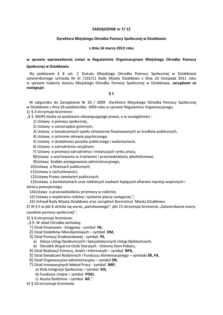 ZARZĄDZENIE nr 7/ 12 Dyrektora Miejskiego Ośrodka Pomocy Społecznej w Działdowie z dnia 16 marca 2012 roku w sprawie wprowadzenia zmian w Regulaminie Organizacyjnym Miejskiego Ośrodka Pomocy Społecznej w Działdowie. Na podstawie § 8 ust. 2 Statutu Miejskiego Ośrodka Pomocy Społecznej w Działdowie zatwierdzonego uchwałą Nr XI /101/11 Rady Miasta Działdowo z dnia 10 listopada 2011 roku w sprawie nadania statutu Miejskiego Ośrodka Pomocy Społecznej w Działdowie, zarządzam co następuje: §1 W załączniku do Zarządzenia Nr 20 / 2009 Dyrektora Miejskiego Ośrodka Pomocy Społecznej w Działdowie z dnia 26 października 2009 roku w sprawie Regulaminu Organizacyjnego, 1) § 3 otrzymuje brzmienie: „§ 3. MOPS działa na podstawie obowiązującego prawa, a w szczególności : 1) Ustawy o pomocy społecznej, 2) Ustawy o samorządzie gminnym, 3) Ustawy o świadczeniach opieki zdrowotnej finansowanych ze środków publicznych, 4) Ustawy o ochronie zdrowia psychicznego, 5) Ustawy o działalności pożytku publicznego i wolontariacie, 6) Ustawy o zatrudnieniu socjalnym, 7) Ustawy o promocji zatrudnienia i instytucjach rynku pracy, 8)Ustawy o wychowaniu w trzeźwości i przeciwdziałaniu alkoholizmowi, 9)Ustawy Kodeks postępowania administracyjnego, 10)Ustawy o finansach publicznych, 11)Ustawy o rachunkowości, 12)Ustawy Prawo zamówień publicznych, 13)Ustawy o kombatantach oraz niektórych osobach będących ofiarami represji wojennych i okresu powojennego, 14)Ustawy o przeciwdziałaniu przemocy w rodzinie, 15) Ustawy o wspieraniu rodziny i systemie pieczy zastępczej."; 16) Uchwał Rady Miasta Działdowo oraz zarządzeń Burmistrza Miasta Działdowo. 2) W § 5 w pkt 6 skreśla się wyraz „państwowego”, pkt 15 otrzymuje brzmienie „Zatwierdzanie oceny zasobów pomocy społecznej”, 3) § 9 otrzymuje brzmienie: „§ 9. W skład Ośrodka wchodzą: 1) Dział Finansowo - Księgowy - symbol FK, 2) Dział Dodatków Mieszkaniowych – symbol DM, 3) Dział Pomocy Środowiskowej - symbol PS, a) Sekcja Usług Opiekuńczych i Specjalistycznych Usług Opiekuńczych, b) Ośrodek Wsparcia Osób Starszych - Dzienny Dom Pobytu, 4) Dział Realizacji Pomocy, Analiz i Informatyki – symbol RPA, 5) Dział Świadczeń Rodzinnych i Funduszu Alimentacyjnego – symbole ŚR, FA, 6) Dział Organizacyjno-administracyjny – symbol OR, 7) Dział Innowacyjnych Metod Pracy - symbol IMP, a) Klub Integracji Społecznej – symbol KIS, b) Fundusze Unijne – symbol POKL c) Asysta Rodzinna – symbol AR,” 4) § 10 otrzymuje brzmienie: „§ 10. W Ośrodku tworzy się następujące kierownicze i samodzielne stanowiska pracy: 1) Z-ca Dyrektora, 2) Główna Księgowa, 3) Koordynator Działu Świadczeń Rodzinnych i Funduszu Alimentacyjnego, 4) Kierownik Działu Innowacyjnych Metod Pracy”, 5) § 15 otrzymuje brzmienie: „§ 15 Dział Pomocy Środowiskowej. 1. Do zadań Działu Pomocy Środowiskowej należy w szczególności: 1) Rozpoznawanie, diagnozowanie potrzeb i organizowanie pomocy stosownie do indywidualnych potrzeb i sytuacji osób i rodzin, 2) Przeprowadzanie wywiadów środowiskowych, kompletowanie dokumentów oraz podejmowanie innych niezbędnych czynności związanych ze świadczeniem różnorodnych form pomocy, 3) Udzielanie pełnych informacji osobom o przysługujących im świadczeniach i dostępnych formach pomocy oraz o podmiotach działających na rzecz jednostek i rodzin, 4) Prowadzenie działalności profilaktycznej mającej na celu zapobieganie stanom powodującym konieczność korzystania z pomocy społecznej – praca socjalna, 5) Pobudzanie aktywności społecznej klientów Ośrodka oraz ich rodzin, inspirowanie i wspieranie dążeń do osiągania samodzielności, 6) Zawieranie kontraktów socjalnych z osobami lub rodzinami znajdującymi się w trudnej sytuacji życiowej celem jej rozwiązania, 7) Inicjowanie nowych rozwiązań mających na celu zapobieganie niekorzystnym zjawiskom oraz poprawę sytuacji osób wymagających pomocy, 8) Podejmowanie interwencji kryzysowej, 9) Podejmowanie działań zmierzających do zwiększenia dostępności do usług poradnictwa dla poszczególnych grup społecznych, 10) Kierowanie osób do placówek udzielających wyspecjalizowanej pomocy, 11) Udzielanie informacji na podstawie wniosku o udostępnianie danych ze zbioru danych osobowych, zgodnie z przepisami w tym zakresie, 12) Współdziałanie z organami samorządu lokalnego, organizacjami pozarządowymi i innymi podmiotami realizującymi zadania z zakresu pomocy społecznej, 13) Przygotowanie danych do opracowania planów i sprawozdań finansowych i merytorycznych, 14) Przygotowywanie na zlecenie materiałów służących opracowywaniu diagnoz, programów i projektów w zakresie rozwiązywania problemów społecznych, 15) Realizacja strategii rozwiązywania problemów społecznych oraz opracowanych i wdrażanych w Ośrodku programów i projektów, 16) Współuczestniczenie we wdrożeniu i rozwijaniu regionalnych i lokalnych programów pomocy społecznej ukierunkowanych na podniesienie jakości życia, 2. W ramach Działu Pomocy Środowiskowej funkcjonuje Sekcja usług opiekuńczych i specjalistycznych usług opiekuńczych do zadań której należy: 1) zapewnienie opieki i pielęgnacji osobom samotnym, które z powodu wieku, choroby lub innych przyczyn wymagają pomocy innych osób, a są jej pozbawione, 2) zapewnienie opieki i pielęgnacji osobom, które wymagają pomocy innych osób, a rodzina nie może takiej pomocy zapewnić, 3) świadczenie usług pielęgnacyjnych, 4) świadczenie usług specjalistycznych dla osób z zaburzeniami psychicznymi, 5) współpraca z rodziną i najbliższym środowiskiem osób objętych pomocą, 6) współpraca z pracownikami socjalnymi i lekarzem rodzinnym. 3. W ramach Działu Pomocy Środowiskowej funkcjonuje: Dzienny Dom Pobytu. 1. Dom Dziennego Pobytu dla osób starszych, mieszkańców miasta w celu zapewnienia usług opiekuńczych, socjalnych, terapeutycz