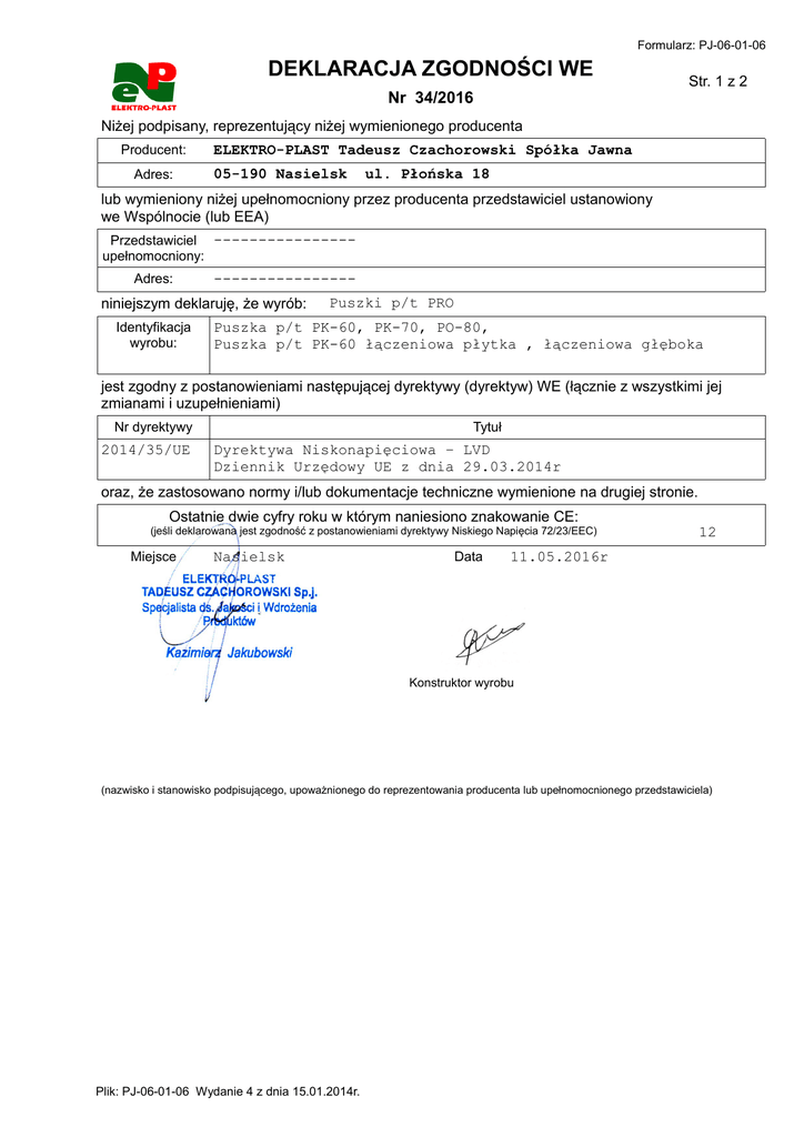 Formularz: PJ-06-01-06 DEKLARACJA ZGODNOŚCI WE Nr 34/2016 Str. 1 z 2 Niżej podpisany, reprezentujący niżej wymienionego producenta Producent: Adres: ELEKTRO-PLAST Tadeusz Czachorowski Spółka Jawna 05-190 Nasielsk ul. Płońska 18 lub wymieniony niżej upełnomocniony przez producenta przedstawiciel ustanowiony we Wspólnocie (lub EEA) Przedstawiciel ---------------upełnomocniony: Adres: ---------------- niniejszym deklaruję, że wyrób: Identyfikacja wyrobu: Puszki p/t PRO Puszka p/t PK-60, PK-70, PO-80, Puszka p/t PK-60 łączeniowa płytka , łączeniowa głęboka jest zgodny z postanowieniami następującej dyrektywy (dyrektyw) WE (łącznie z wszystkimi jej zmianami i uzupełnieniami) Nr dyrektywy 2014/35/UE Tytuł Dyrektywa Niskonapięciowa – LVD Dziennik Urzędowy UE z dnia 29.03.2014r oraz, że zastosowano normy i/lub dokumentacje techniczne wymienione na drugiej stronie. Ostatnie dwie cyfry roku w którym naniesiono znakowanie CE: (jeśli deklarowana jest zgodność z postanowieniami dyrektywy Niskiego Napięcia 72/23/EEC) Miejsce Nasielsk Data 12 11.05.2016r Konstruktor wyrobu (nazwisko i stanowisko podpisującego, upoważnionego do reprezentowania producenta lub upełnomocnionego przedstawiciela) Plik: PJ-06-01-06 Wydanie 4 z dnia 15.01.2014r. Formularz: PJ-06-01-06 DEKLARACJA ZGODNOŚCI WE Nr 34/2016 Str. 2 z 2 Normy i/lub dokumentacje techniczne lub ich części zastosowane do wyrobu, którego dotyczy niniejsza deklaracja zgodności: - normy zharmonizowane: Nr PN-EN 93208 Wydanie 1997 Tytuł Część*) Puszki instalacyjne - inne normy i/lub dokumentacje techniczne: Nr Wydanie Tytuł Część*) Inne dokumenty nie występują - inne rozwiązania techniczne, szczegóły, które zostały włączone do dokumentacji technicznej lub konstrukcyjnej: Puszka p/t PK-60 PRO nr.Kat. 0281-00 Puszka p/t PK-60 PRO z wkrętami nr.Kat. 0281-01 Puszka p/t PO-70 PRO nr.Kat. 0282-00 Puszka p/t PO-80 PRO nr.Kat. 0283-00 Puszka p/t PK-60 PRO łączeniowa płytka nr.Kat.0284-00 Puszka p/t PK-60 PRO łączeniowa płytka z wkrętami nr.Kat.0284-01 Puszka p/t PK-60 PRO łączeniowa głęboka nr.Kat.0285-00 Puszka p/t PK-60 PRO łączeniowa głęboka z wkrętami nr.Kat.0285-01 Puszka p/t PK-60 PRO zielona ONNLINE nr Kat. 0281-10 Puszka p/t PK-60 PRO z wkrętami zielona ONNLINE nr Kat. 0281-11 Puszka p/t PO-70 PRO zielona ONNLINE nr Kat. 0282-10 Puszka p/t PO-80 PRO zielona ONNLINE nr Kat. 0283-10 Puszka p/t PK-60 PRO łączeniowa płytka zielona ONNLINE nr Kat. 0284-10 Puszka p/t PK-60 PRO łączeniowa płytka z wkrętami zielona ONNLINE nr Kat. 0284-11 Puszka p/t PK-60 PRO łączeniowa głęboka zielona ONNLINE nr Kat. 0285-10 Puszka p/t PK-60 PRO łączeniowa głęboka z wkrętami zielona ONNLINE nr Kat. 0285-11 - inne dokumenty lub informacje wymagane właściwą dyrektywą (dyrektywami) WE: Inne dokumenty nie występują *) Należy wypełnić w przypadku powoływania się na części lub rozdziały normy lub dokumentacji technicznej Plik: PJ-06-01-06 Wydanie 4 z dnia 15.01.2014r.
