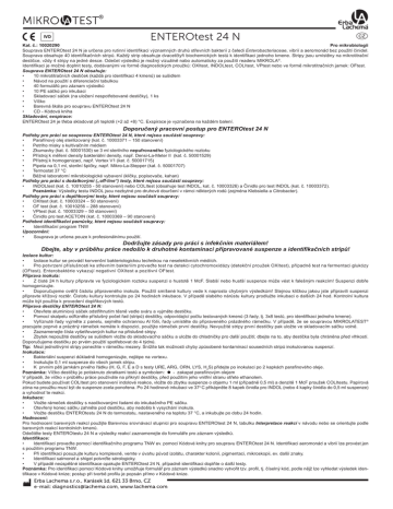 ENTEROtest 24 N Kat. č.: 10020290 Pro mikrobiologii Souprava ENTEROtest 24 N je určena pro rutinní identifikaci významných druhů střevních bakterií z čeledi Enterobacteriaceae, vibrií a aeromonád bez použití činidel. Souprava obsahuje 40 identifikačních stripů. Každý strip obsahuje dvacetčtyři biochemických testů k identifikaci jednoho kmene. Stripy jsou umístěny na mikrotitrační destičce, vždy 4 stripy na jedné desce. Odečet výsledků je možný vizuálně nabo automaticky za použití readeru MIKROLA®. Identifikaci je možné doplnit testy, dodávanými ve formě diagnostických proužků: OXItest, INDOLtest, COLItest, VPtest nebo ve formě mikrotitračních jamek: OFtest. Souprava ENTEROtest 24 N obsahuje: • 10 mikrotitračních destiček (každá pro identifikaci 4 kmenů) se sušidlem • Návod na použití s diferenciační tabulkou • 40 formulářů pro záznam výsledků • 10 PE sáčků pro inkubaci • Skladovací sáček (na uložení nespotřebované destičky), 1 ks • Víčko • Barevná škála pro soupravu ENTEROtest 24 N • CD - Kódová kniha Skladování, exspirace: ENTEROtest 24 je třeba skladovat při teplotě (+2 až +8) °C. Exspirace je vyznačena na každém balení. Doporučený pracovní postup pro ENTEROtest 24 N Potřeby pro práci se soupravou ENTEROtest 24 N, které nejsou součástí soupravy: • Parafínový olej sterilizovaný (kat. č. 10003371 – 150 stanovení) • Petriho misky s kultivačním médiem • Zkumavky (kat. č. 50001530) se 3 ml sterilního nepufrovaného fyziologického roztoku • Přístroj k měření density bakteriální density, např. Densi-La-Meter II (kat. č. 50001529) • Přístroj k homogenizaci, např. Vortex V1 (kat. č. 50001715) • Pipeta na 0,1 ml, sterilní špičky, např. Mikro-La-Stepper (kat. č. 50001707) • Termostat 37 °C • Běžné laboratorní mikrobiologické vybavení (kličky, popisovače, kahan) Potřeby pro práci s dodatkovými (,,off-line“) testy, které nejsou součástí soupravy: • INDOLtest (kat. č. 10010255 - 50 stanovení) nebo COLItest (obsahuje test INDOL, kat. č. 10003326) a Činidlo pro test INDOL (kat. č. 10003372). Poznámka: Výsledky testu INDOL jsou nezbytné pro druhové dourčení v rámci některých rodů (zejména Klebsiella a Citrobacter). Potřeby pro práci s doplňkovými testy, které nejsou součástí soupravy: • OXItest (kat. č. 10003324 – 50 stanovení) • OF test (kat. č. 10010256 – 288 stanovení) • VPtest (kat. č. 10003329 – 50 stanovení) • Činidlo pro test ACETOIN (kat. č. 10003369 – 90 stanovení) Potřebné identifikační pomůcky, které nejsou součástí soupravy: • Identifikační program TNW Upozornění: • Souprava je určena pouze k profesionálnímu použití. Dodržujte zásady pro práci s infekčním materiálem! Dbejte, aby v průběhu práce nedošlo k druhotné kontaminaci připravované suspenze a identifikačních stripů! Izolace kultur: • Izolace kultur se provádí konvenční bakteriologickou technikou na neselektivních médiích. • Pro potvrzení příslušnosti ke střevním bakteriím proveďte test na detekci cytochromoxidázy (detekční proužek OXItest), případně test na fermentaci glukózy (OFtest). Enterobaktérie vykazují negativní OXItest a pozitivní OFtest. Příprava inokula: • Z čisté 24 h kultury připravte ve fyziologickém roztoku suspenzi o hustotě 1 McF. Slabší nebo hustší suspenze může vést k falešným reakcím! Suspenzi dobře homogenizujte. • Doporučujeme ověřit čistotu připraveného inokula. Použití smíšené kultury vede k naprosto chybným výsledkům! Stejnou kličkou jakou jste připravili suspenzi připravte křížový roztěr. Čistotu kultury kontrolujte po 24 hodinách inkubace. V případě slabého nárůstu kultury prodlužte inkubaci o dalších 24 hod. Kontrolní kultura může být použita k provedení doplňkových testů. Příprava destičky ENTEROtest 24 N: • Otevřete aluminiový sáček odstřihnutím těsně vedle sváru a vyjměte destičku. • Pomocí skalpelu odřízněte příslušný počet řad (stripů) destičky, odpovídající počtu testovaných kmenů (3 řady, tj. 3x8 testů, pro identifikaci jednoho kmene). • Vyříznuté řady vyjměte z panelu, sejměte ochrannou Al fólii, řady umístěte do připraveného prázdného rámečku. V případě, že se soupravou MIKROLATEST® pracujete poprvé a prázdný rámeček nemáte k dispozici, použijte rámeček první destičky. Nevyužité stripy první destičky pak uložte ve skladovacím sáčku volně. • Zaznamenejte čísla vyšetřovaných kultur na příslušné stripy. • Zbytek nepoužité destičky se sušidlem vložte do skladovacího sáčku a uložte do chladničky pro další použití; dbejte na to, aby destička byla chráněna před vlhkostí. Doporučujeme destičku po prvém použití spotřebovat do 4 týdnů. Tip: Mezi jednotlivými stripy ponechte v rámečku mezery. Snížíte tak možnosti chyby způsobené kontaminací sousedních stripů inokulovanou suspenzí. Inokulace: •Bakteriální suspenzi důkladně homogenizujte, nejlépe na vortexu. • Inokulujte 0,1 ml suspenze do všech jamek stripu. • K prvním pěti jamkám prvého řádku (H, G, F, E a D s testy URE, ARG, ORN, LYS, H2S) přidejte po inokulaci po 2 kapkách parafinového oleje. Poznámka: Víčko destičky je potisknuto zkratkami testů a symbolem: - zakapat parafínovým olejem V případě, že víčko v průběhu práce používáte na přikrytí destičky, před použitím jeho vnitřní stranu otřete ethanolem. Pokud budete používat COLItest pro stanovení indolové reakce, vložte do zbytku suspenze o objemu 1 ml (případně 0,5 ml) a denzitě 1 McF proužek COLItestu. Papírová zóna na proužku musí být do suspenze zcela ponořena. Po 24 hodinové inkubaci ve 37o C přikápněte 8 kapek činidla pro INDOL (nebo