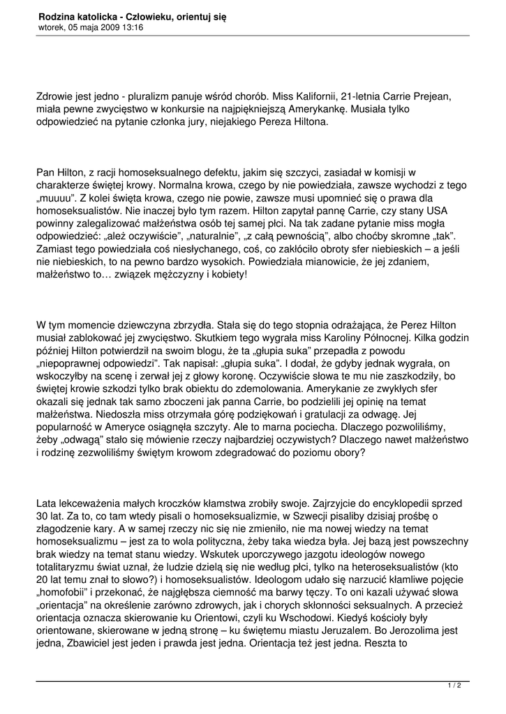 Rodzina katolicka - Człowieku, orientuj się wtorek, 05 maja 2009 13:16 Zdrowie jest jedno - pluralizm panuje wśród chorób. Miss Kalifornii, 21-letnia Carrie Prejean, miała pewne zwycięstwo w konkursie na najpiękniejszą Amerykankę. Musiała tylko odpowiedzieć na pytanie członka jury, niejakiego Pereza Hiltona. Pan Hilton, z racji homoseksualnego defektu, jakim się szczyci, zasiadał w komisji w charakterze świętej krowy. Normalna krowa, czego by nie powiedziała, zawsze wychodzi z tego „muuuu”. Z kolei święta krowa, czego nie powie, zawsze musi upomnieć się o prawa dla homoseksualistów. Nie inaczej było tym razem. Hilton zapytał pannę Carrie, czy stany USA powinny zalegalizować małżeństwa osób tej samej płci. Na tak zadane pytanie miss mogła odpowiedzieć: „ależ oczywiście”, „naturalnie”, „z całą pewnością”, albo choćby skromne „tak”. Zamiast tego powiedziała coś niesłychanego, coś, co zakłóciło obroty sfer niebieskich – a jeśli nie niebieskich, to na pewno bardzo wysokich. Powiedziała mianowicie, że jej zdaniem, małżeństwo to… związek mężczyzny i kobiety! W tym momencie dziewczyna zbrzydła. Stała się do tego stopnia odrażająca, że Perez Hilton musiał zablokować jej zwycięstwo. Skutkiem tego wygrała miss Karoliny Północnej. Kilka godzin później Hilton potwierdził na swoim blogu, że ta „głupia suka” przepadła z powodu „niepoprawnej odpowiedzi”. Tak napisał: „głupia suka”. I dodał, że gdyby jednak wygrała, on wskoczyłby na scenę i zerwał jej z głowy koronę. Oczywiście słowa te mu nie zaszkodziły, bo świętej krowie szkodzi tylko brak obiektu do zdemolowania. Amerykanie ze zwykłych sfer okazali się jednak tak samo zboczeni jak panna Carrie, bo podzielili jej opinię na temat małżeństwa. Niedoszła miss otrzymała górę podziękowań i gratulacji za odwagę. Jej popularność w Ameryce osiągnęła szczyty. Ale to marna pociecha. Dlaczego pozwoliliśmy, żeby „odwagą” stało się mówienie rzeczy najbardziej oczywistych? Dlaczego nawet małżeństwo i rodzinę zezwoliliśmy świętym krowom zdegradować do poziomu obory? Lata lekceważenia małych kroczków kłamstwa zrobiły swoje. Zajrzyjcie do encyklopedii sprzed 30 lat. Za to, co tam wtedy pisali o homoseksualizmie, w Szwecji pisaliby dzisiaj prośbę o złagodzenie kary. A w samej rzeczy nic się nie zmieniło, nie ma nowej wiedzy na temat homoseksualizmu – jest za to wola polityczna, żeby taka wiedza była. Jej bazą jest powszechny brak wiedzy na temat stanu wiedzy. Wskutek uporczywego jazgotu ideologów nowego totalitaryzmu świat uznał, że ludzie dzielą się nie według płci, tylko na heteroseksualistów (kto 20 lat temu znał to słowo?) i homoseksualistów. Ideologom udało się narzucić kłamliwe pojęcie „homofobii” i przekonać, że najgłębsza ciemność ma barwy tęczy. To oni kazali używać słowa „orientacja” na określenie zarówno zdrowych, jak i chorych skłonności seksualnych. A przecież orientacja oznacza skierowanie ku Orientowi, czyli ku Wschodowi. Kiedyś kościoły były orientowane, skierowane w jedną stronę – ku świętemu miastu Jeruzalem. Bo Jerozolima jest jedna, Zbawiciel jest jeden i prawda jest jedna. Orientacja też jest jedna. Reszta to 1/2 Rodzina katolicka - Człowieku, orientuj się wtorek, 05 maja 2009 13:16 dezorientacje. Maluchu, dowód! Skandal! W drogeriach sieci Rossmann nieletni nie mogli kupować prezerwatyw! Sprzedawcy domagali się od młodzieży okazania dowodu osobistego. „Gazeta Wyborcza” dowiedziała się, że praktyka ta była skutkiem apelu Ewy Sowińskiej, która dwa lata temu, jako Rzecznik Praw Dziecka, chciała chronić dzieci przed demoralizacją. Teraz już Rossmann się poprawi. Przyciśnięty przez „Wyborczą” rzecznik sieci Roman Lewandowski tłumaczy się, że to wynik złego zrozumienia apelu, bo „chodziło o to, by nie sprzedawać prezerwatyw kilkuletnim dzieciom, a nie nastolatkom”. Jaka ulga. Wiadomo przecież, że kilkulatki za niczym tak nie przepadają jak za prezerwatywami. Niechby taki przedszkolak zrobił sobie z kondomu balonik – toby dopiero była demoralizacja! Zmiany bez zmian Ministerstwo Edukacji Narodowej rzekomo wycofało się z pomysłu wprowadzenia obowiązkowej edukacji seksualnej. W rzeczywistości jednak od września na lekcje wychowania do życia w rodzinie mają chodzić wszyscy uczniowie, chyba że rodzice złożą deklarację, że sobie tego nie życzą. Łatwo przewidzieć, że następnym krokiem będzie wprowadzenie całkowitego obowiązku udziału w lekcjach. W kolejnym zaś ruchu dojdzie do zmiany programu, zgodnie z wymogami „nowoczesnej” seksedukacji. Odpowiednie działania podejmują już samozwańcze grupy edukatorów seksualnych, w praktyce zajmujące się deprawacją młodzieży. Serwis TVN 24 korzysta z ich „badań”, donosząc: „Z relacji młodzieży wynika jednak, że nauczyciele są kiepsko przygotowani do prowadzenia zajęć. Niektórzy na wszelki wypadek nie wymawiają słowa »seks«, inni straszą gejów piekłem, jeszcze inni lekcji po prostu nie prowadzą”. Skoro ta młodzież tak dobrze wie, jak powinna być uczona, to może niech sama uczy nauczycieli? Franciszek Kucharczak Źródło: Gość Niedzielny 2/2