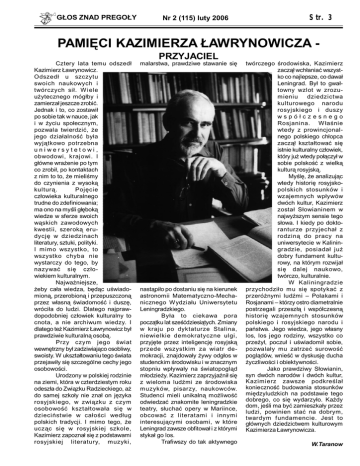GŁOS ZNAD PREGOŁY Nr 2 (115) luty 2006 Str. 3 PAMIĘCI KAZIMIERZA ŁAWRYNOWICZA PRZYJACIEL Cztery lata temu odszedł Kazimierz Ławrynowicz. Odszedł u szczytu swoich naukowych i twórczych sił. W iele użytecznego mógłby i zamierzał jeszcze zrobić. Jednak i to, co zostawił po sobie tak w nauce, jak i w życiu społecznym, pozwala twierdzić, że jego działalność była wyjątkowo potrzebna uniwersytetowi, obwodowi, krajowi. I główne wrażenie po tym co zrobił, po kontaktach z nim to to, że mieliśmy do czynienia z wysoką kulturą. Pojęcie człowieka kulturalnego trudne do zdefiniowania; ma ono na myśli głęboką wiedze w sferze swoich wąskich zawodowych kwestii, szeroką erudycję w dziedzinach literatury, sztuki, polityki. I mimo wszystko, to wszystko chyba nie wystarczy do tego, by nazywać się człowiekiem kulturalnym. Najważniejsze, żeby cała wiedza, będąc uświadomioną, przerobioną i przepuszczoną przez własną świadomość i duszę, wróciła do ludzi. Dlatego najprawdopodobniej człowiek kulturalny to cnota, a nie archiwum wiedzy. I dlatego też Kazimierz Ławrynowicz był prawdziwie kulturalną osobą. Przy czym jego świat wewnętrzny był zadziwiająco osobliwy, swoisty. W ukształtowaniu tego świata przejawiły się szczególne cechy jego osobowości. Urodzony w polskiej rodzinie na ziemi, która w czterdziestym roku odeszła do Związku Radzieckiego, aż do samej szkoły nie znał on języka rosyjskiego, w związku z czym osobowość kształtowała się w dzieciństwie w całości według polskich tradycji. I mimo tego, że ucząc się w rosyjskiej szkole, Kazimierz zapoznał się z podstawami rosyjskiej literatury, muzyki, malarstwa, prawdziwe stawanie się nastąpiło po dostaniu się na kierunek astronomii Matematyczno-Mechanicznego W ydziału Uniwersytetu Leningradzkiego. Była to ciekawa pora początku lat sześćdziesiątych. Zmiany w kraju po dyktaturze Stalina, niewielkie demokratyczne ulgi, przyjęte przez inteligencję rosyjską przede wszystkim za wiatr demokracji, znajdowały żywy odgłos w studenckim środowisku i w znacznym stopniu wpływały na światopogląd młodzieży. Kazimierz zaprzyjaźnił się z wieloma ludźmi ze środowiska muzyków, pisarzy, naukowców. Studenci mieli unikalną możliwość odwiedzać znakomite leningradzkie teatry, słuchać opery w Mariince, obcować z literatami i innymi interesującymi osobami, w które Leningrad zawsze obfitował i z którymi stykał go los. Trafiwszy do tak aktywnego twórczego środowiska, Kazimierz zaczął wchłaniać wszystko co najlepsze, co dawał Leningrad. Był to gwałtowny wzlot w zrozumieniu dziedzictwa kulturowego narodu rosyjskiego i duszy współczesnego Rosjanina. W łaśnie wtedy z prowincjonalnego polskiego chłopca zaczął kształtować się istnie kulturalny człowiek, który już wtedy połączył w sobie polskość z wielką kulturą rosyjską. Myślę, że analizując wtedy historię rosyjskopolskich stosunków i wzajemnych wpływów dwóch kultur, Kazimierz został Słowianinem w najwyższym sensie tego słowa. I kiedy po doktoranturze przyjechał z rodziną do pracy na uniwersytecie w Kaliningradzie, posiadał już dobry fundament kulturowy, na którym rozwijał się dalej naukowo, twórczo, kulturalnie. W Kaliningradzie przychodziło mu się spotykać z przeróżnymi ludźmi – Polakami i Rosjanami – którzy ostro diametralnie postrzegali przeszłą i współczesną historię wzajemnych stosunków polskiego i rosyjskiego narodu i państwa. Jego wiedza, jego własny los, los jego rodziny, wszystko co przeżył, poczuł i uświadomił sobie, pozwalały mu zatrzeć surowość poglądów, wnieść w dyskusję ducha życzliwości i obiektywności. Jako prawdziwy Słowianin, syn dwóch narodów i dwóch kultur, Kazimierz zawsze podkreślał konieczność budowania stosunków międzyludzkich na podstawie tego dobrego, co się wydarzyło. Każdy dom, jeśli ma być zamieszkały przez ludzi, powinien stać na dobrym, twardym f undamencie. Jest to głównych dziedzictwem kulturowym Kazimierza Ławrynowicza. W.Taranow