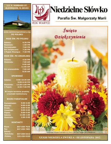 111 S. HUBBARD ST. ALGONQUIN, IL 60102 Niedzielne Słówko Parafia Św. Małgorzaty Marii www.saintmargaretmary.org PO POLSKU MSZE ŚW. PO POLSKU Sobota: Niedziela: Poniedziałek: Dni świąteczne: I Piątek Miesiąca: 6:30 1:00 7:00 7:30 7:30 Święto Dziękczynienia PM PM PM PM PM MSZE ŚW. PO ANGIELSKU Sobota: Niedziela: Dni powszednie: 4:30 7:00 9:00 11:00 7:00 8:30 PM AM AM AM AM AM SPOWIEDŹ Sobota: Niedziela: I Piątek: 9:00-10:30 AM 6:00-6:30 PM 12:30-1:00 PM 6:30-7:30 PM W innym terminie prosimy o kontakt telefoniczny BIURO PARAFIALNE Poniedziałek: Wtorek: Środa: Czwartek: Piątek: Sobota: Niedziela: 9:00-5:00 9:00-5:00 9:00-5:00 9:00-5:00 9:00-5:00 11:00-1:00 1:00-3:00 KONTAKTY Biuro Fax Szkoły: -Katolicka -Polska 847-658 7625 847-658 7882 847-658 5313 224-436 0320 XXXIII NIEDZIELA ZWYKŁA - 18 LISTOPADA 2012 Niedzielne Słówko Od Proboszcza „ A od drzewa figowego uczcie się przez podobieństwo” Drodzy Przyjaciele Znany austriacki psychiatra Zygmunt Freud napisał nowelę, w której przedstawia historię żeglarza, rozbitka, który trafił przypadkowo na jedną z wysp, na Południowym Pacyfiku. Plemię, które zamieszkiwało wyspę przyjęło go z wielką radością i owacjami. Na lektyce przynieśli go do swojej wioski i posadzili na złotym tronie. Okazało się , że plemię to miało w zwyczaju ustanawianie nowego przybysza, jako swojego króla na jeden rok czasu. Mieszkańcy wyspy w tym czasie spełniali wszystkie jego rozkazy. Żeglarz na początku bardzo się cieszył takim obrotem sprawy, ale w końcu zaczął się zastanawiać, co z nim będzie po upływie roku czasu. Dowiedział się, że po ukończonej kadencji, mieszkańcy wyspy odwożą byłego króla na bezludną wyspę i tam zostawiają go, jako ofiarę dla bogów. Kiedy żeglarz dowiedział się o tym, zaczął używać swojej królewskiej władzy, aby zabezpieczyć swoją przyszłość. Rozkazał zbudować flotę z małych statków, na których przewoził na bezludną wyspę użyteczne rośliny i zwierzęta domowe. Na koniec rozkazał również swoim poddanym wybudować dla siebie piękny dom. Kiedy więc jego królowanie się skończyło, na bezludnej wyspie znalazł przygotowane warunki, aby przetrwać. Już za tydzień będziemy przeżywać koniec roku kościelnego i dlatego Ewangelia przypomina nam także o końcu świata, powtórnym przyjściu Chrystusa i przemijaniu. Tak jak żeglarz z noweli Freuda, my również musimy wykorzystać czas, który został nam tutaj, aby przygotować się na ostateczne spotkanie z Bogiem. Tak jak słyszeliśmy w pierwszym czytaniu z Księgi Daniela na końcu świata „ wielu, co posnęli w prochu ziemi zbudzi się: jedni do życia wiecznego , drudzy ku hańbie, ku wiecznej odrazie. Mądrzy będą świecić jak blask sklepienia, a ci, którzy nauczyli wielu sprawiedliwości, jak gwiazdy przez wieki i na zawsze.” Ewangelia według św. Marka 13, 24– 32 Jezus powiedział do swoich uczniów: „W owe dni, po wielkim ucisku słońce się zaćmi i księżyc nie da swego blasku. Gwiazdy będą padać z nieba i moce na niebie zostaną wstrząśnięte. Wówczas ujrzą Syna Człowieczego, przychodzącego w obłokach z wielką mocą i chwałą. Wtedy pośle On aniołów i zbierze swoich wybranych z czterech stron świata, od krańca ziemi aż do szczytu nieba. A od drzewa figowego uczcie się przez podobieństwo. Kiedy już jego gałąź nabiera soków i wypuszcza liście, poznajecie, że blisko jest lato. Tak i wy, gdy ujrzycie, że to się dzieje, wiedzcie, że blisko jest, we drzwiach. Zaprawdę powiadam wam: Nie przeminie to pokolenie, aż się to wszystko stanie. Niebo i ziemia przeminą, ale moje słowa nie przeminą. Lecz o dniu owym lub godzinie nikt nie wie, ani aniołowie w niebie, ani Syn, tylko Ojciec”. Bóg każdego dnia daje nam wiele darów i okazji do przygotowywania sobie wiecznej przyszłości z Nim. Najważniejsze jest, abyśmy z wiarą i miłością służyli Bogu i bliźnim. Na końcu naszego życia staniemy przed Bogiem, i będziemy musieli zdać rachunek z tego, co tu na ziemi zdziałaliśmy. Hiszpański pisarz Lope de Vega na krótko przed śmiercią robił sobie rachunek sumienia i był bardzo smutny. Wtedy jego lekarz powiedział do niego: „ Może pan umierać szczęśliwy. Odniósł pan wiele sukcesów. Swoimi książkami oczarował pan ludzi.” Wtedy pisarz odpowiedział: „ Panie doktorze na łożu śmierci wszystko widzę inaczej. Przed Bogiem wielki jest tylko ten, kto ma dobre serce. Oddałbym dziś wszystkie oklaski, jakie w życiu otrzymałem, za to, bym mógł zrobić jeden dobry uczynek więcej.” Teraz właśnie mamy ten czas, aby robić dobre uczynki. Teraz jest czas na przygotowanie sobie miejsca w Niebie. Starajmy się więc dobrze wykorzystać te chwile, które nam pozostały. Módlmy się więc słowami psalmu: Pan moim dziedzictwem i przeznaczeniem, to On mój los zabezpiecza. Zawsze stawiam sobie Pana przed oczy. On jest po mojej prawicy, nic mną nie zachwieje. Dlatego cieszy się moje serce i dusza raduje, a ciało moje będzie spoczywać bezpiecznie, bo w kraju zmarłych duszy mej nie zostawisz i nie dopuścisz, bym pozostał w grobie. O. Piotr Sarnicki OFM Conv Niedzielne Słówko Ogłoszenia W poniedziałek 19-go listopada zapraszamy na Mszę św. i nabożeństwo wypominkowe o 7 wieczorem. Na naszej stronie parafialnej w j. polskim pojawiła się sekcja, gdzie każdy kto chce może poprosić o modlitwę i podać swoją intencję. Jeśli chcecie poprosić o modlitwę w jakiejś intencji, to można to uczynić. Jeśli ktoś z was chciałby się stać członkiem grupy modlitewnej i codziennie odmawiać koronkę do Bożego Miłosierdzia w intencjach podanych na stronie internetowej, to proszę zgłosić się do biura parafialnego, podając swoje imię, nazwisko i nr tel. Służba Liturgiczna Ołtarza W sobotę 24-go listopada odbędzie się zabawa andrzejkowa. Bilety można nabyć dzisiaj po Mszy Świętej. W czwartek 22