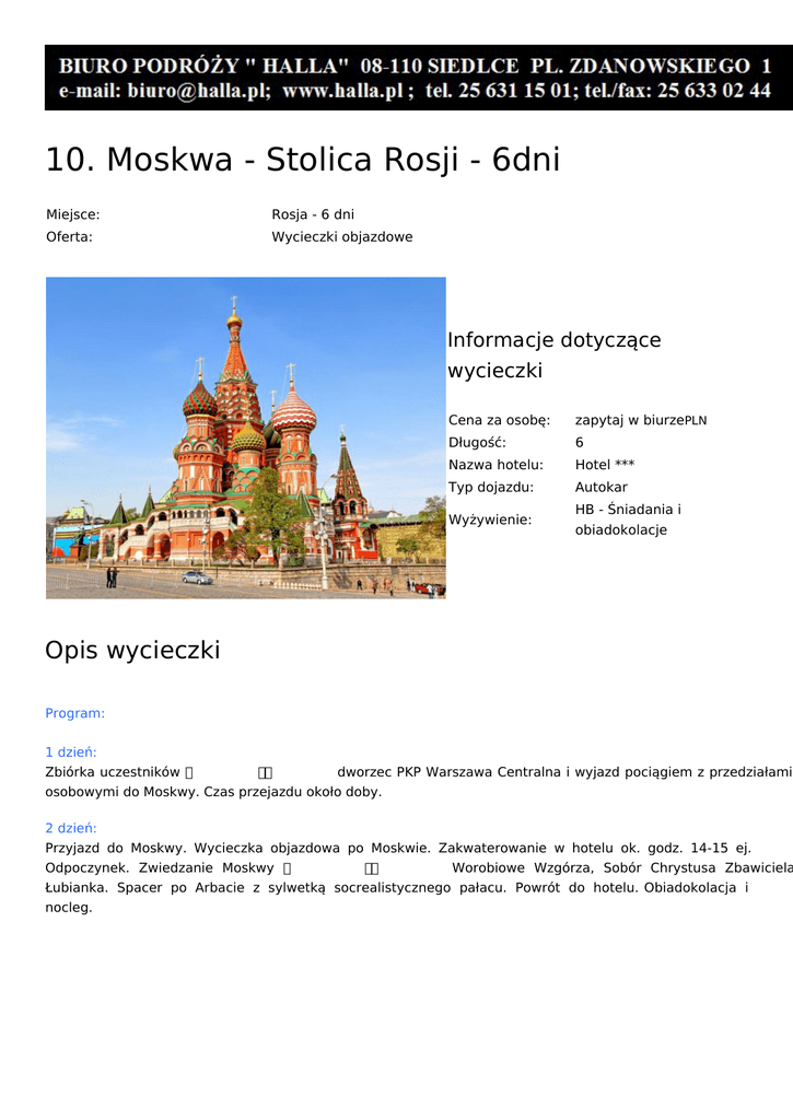 10. Moskwa - Stolica Rosji - 6dni Miejsce: Rosja - 6 dni Oferta: Wycieczki objazdowe Informacje dotyczące wycieczki Cena za osobę: zapytaj w biurzePLN Długość: 6 Nazwa hotelu: Hotel *** Typ dojazdu: Autokar Wyżywienie: HB - Śniadania i obiadokolacje Opis wycieczki Program: 1 dzień: Zbiórka uczestników ጀ dworzec PKP Warszawa Centralna i wyjazd pociągiem z przedziałami osobowymi do Moskwy. Czas przejazdu około doby. 2 dzień: Przyjazd do Moskwy. Wycieczka objazdowa po Moskwie. Zakwaterowanie w hotelu ok. godz. 14-15 ej. Odpoczynek. Zwiedzanie Moskwy ጀ Worobiowe Wzgórza, Sobór Chrystusa Zbawiciela Łubianka. Spacer po Arbacie z sylwetką socrealistycznego pałacu. Powrót do hotelu. Obiadokolacja i nocleg. 3 dzień: Śniadanie. Dalsze zwiedzanie Moskwy z przewodnikiem- Kreml z soborami, Kolekcja carskich koron i tronów, Armata Carska (car puszka) i największy na świecie car kołokoł. Plac Czerwony-Katedra Wasyla Błażennego, Mauzoleum Lenina, Sobór Kazański, Muzeum Historyczne, Główny Powszechny Dom Towarowy (GUM) o przedwojennej architekturze. Spacer moskiewskimi bulwarami ze zwiedzaniem Placu Teatralnego. Obiadokolacja i nocleg w Moskwie. 4 dzień: Śniadanie. Zwiedzanie Galerii Tretiakowskiej - najsłynniejszej galerii malarstwa rosyjskiego m.in. słynne ikony Rublowa ጀ malarz ikon. Rejs statecznikiem po rzece Moskwie, gdzie przed przewijają się kamienni świadkowie miasta. Podziemne pałace dla ludzi, czyli piękne stacje metra. Każda stacja ma niepowtarzalny wystrój. Są to podziemne galerie. Obiadokolacja i nocleg w Moskwie. 5 dzień: Śniadanie. Wykwaterowanie z hotelu. Transfer na dworzec i pozostawienie bagaży w przechowalni. Dalsze zwiedzanie we własnym zakresie. Czas wolny i godz.. popołudniowych wyjazd w drogę powrotną przez Białoruś. 6 dzień: Przyjazd do Siedlec, a następnie do Warszawy w godz. rannych. Cena obejmuje: Bilety kolejowe Warszawa - Moskwa i Moskwa - Warszawa, Transfery z dworca do hotelu i z hotelu na dworzec. Zakwaterowanie - 3 noclegi w Moskwie w hotelu 3*** (pokoje 2-os. Z łązinkami), Wyżywenie: 3 śniadania i 3 obiadokolacje, Opiekę pilota lokalnego przewodnika po Moskwie, Ubezpieczenie NNW i KL. Cena nie obejmuje: Kosztów wizy rosyjskiej ok. 360 zł oraz biletów wstępu do zwiedzanych obiektów, kosztów lokalnych przewodników, zestawu słuchawkowego Tour - Guide oraz biletów komunikacji miejskiej = ok. ........ EUR płatny obligatoryjnie pilotowi wycieczki Uwaga: Cena został skalkulwana przy 45 osobach płacących . O kalkulacje przy mniejszej grupie zapytaj w biurze. WIZY: 30 dni przed wyjazdem należy dostarczyć do BP HALLA dokumenty niezbędne do uzyskania wizy: prawidłowo wypełniony, wydrukowany i podpisany osobiście wniosek wizowy 1 zdjęcie o wymiarach 3,5 x 4,5 cm, biometryczne - twarz na wprost, kolorowe, na białym tle, nie starsze niż 6 miesięcy) paszport ważny minimum pół roku od zakończenia ważności wizy, posiadający minimum 2 wolne strony.