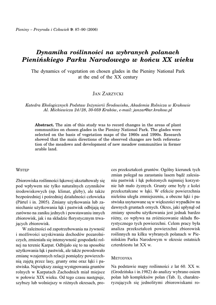 Pieniny – Przyroda i Człowiek 9: 87–90 (2006) Dynamika roślinności na wybranych polanach Pienińskiego Parku Narodowego w końcu XX wieku The dynamics of vegetation on chosen glades in the Pieniny National Park at the end of the XX century JAN ZARZYCKI Katedra Ekologicznych Podstaw Inżynierii Środowiska, Akademia Rolnicza w Krakowie Al. Mickiewicza 24/28, 30-059 Kraków, e-mail: [email protected] Abstract. The aim of this study was to record changes in the areas of plant communities on chosen glades in the Pieniny National Park. The glades were selected on the basis of vegetation maps of the 1960s and 1990s. Research showed that the main directions of the observed changes are both reforestation of the meadows and development of new meadow communities in former arable land. WSTĘP Zbiorowiska roślinności łąkowej ukształtowały się pod wpływem nie tylko naturalnych czynników środowiskowych (np. klimat, gleby), ale także bezpośredniej i pośredniej działalności człowieka (Pärtel i in. 2005). Zmiany użytkowania lub zaniechanie użytkowania łąk i pastwisk odbijają się zarówno na zaniku jednych i powstawaniu innych zbiorowisk, jak i na składzie florystycznym trwających zbiorowisk. W zależności od zapotrzebowania na żywność i możliwości uzyskiwania dochodów pozarolniczych, zmieniała się intensywność gospodarki rolnej na terenie Karpat. Odbijało się to na sposobie użytkowania łąk i pastwisk, ale także powodowało zmianę wzajemnych relacji pomiędzy powierzchnią zajętą przez lasy, grunty orne oraz łąki i pastwiska. Największy zasięg występowania gruntów rolnych w Karpatach Zachodnich miał miejsce w połowie XIX wieku. Od tego czasu następuje, szybszy lub wolniejszy w różnych okresach, pro- ces przekształceń gruntów. Ogólny kierunek tych zmian polegał na zarastaniu lasem bądź zalesianiu pastwisk i łąk położonych najmniej korzystnie lub mało żyznych. Grunty orne były z kolei przekształcane w łąki. W efekcie powierzchnia nieleśna uległa zmniejszeniu, a obecne łąki i pastwiska usytuowane są w większości wypadków na dawnych gruntach ornych. Okres, jaki upłynął od zmiany sposobu użytkowania jest jednak bardzo różny, co wpływa na zróżnicowanie składu florystycznego tych powierzchni. Celem pracy była analiza przekształceń powierzchni zbiorowisk roślinnych na kilku wybranych polanach w Pienińskim Parku Narodowym w okresie ostatnich czterdziestu lat XX w. METODYKA Na podstawie mapy roślinności z lat 60. XX w. (Grodzińska i in.1982) do analizy wybrano osiem polan lub kompleksów polan (Tab. I), charakteryzujących się jednolitymi zbiorowiskami ro- 88 J. Zarzycki – Dynamika roślinności na wybranych polanach PPN Tabela I. Polany i kompleksy polan wybrane do analizy. Glades and complexes of glades chosen for the analysis. 1 2 3 4 5 6 7 8 9 Stolarzówka, Doliny Niżnie i Wyżnie Wlk. Dolina, Wyrobek, Szopka, Głębiowa, Guszkiewiczówka Kurnikówka Pod Rabsztynem, Roplichta Na Koziej Górce, Suszyna, Miedza Za Groniem Lębork Macelak, Doliny, Forendówka Pieniny ślinnymi (niewiele powierzchni zaznaczonych jako mozaikowe). Polany te różniły się między sobą powierzchnią, położeniem w stosunku do gospodarstw oraz udziałem gruntów ornych i różnych zbiorowisk łąkowych. Granice wydzielonych polan odpowiadały granicom zbiorowisk nieleśnych, niewielki udział miały w nich jedynie kępy drzew. Polany te obejmowały łącznie powierzchnię 200 ha, co stanowiło nieco ponad 20% ówczesnej powierzchni nieleśnej Parku. Na mapę zbiorowisk z lat 60. nałożono aktualną mapę roślinności (Mapa... 2004). Dla zmniejszenia błędu wynikającego z zastosowania różnych podkładów kartograficznych, porównywano każdą polanę oddzielnie. Umożliwiło to określenie, w jakie zbiorowiska uległy przekształceniu zbiorowiska z lat 60. i z jakich zbiorowisk powstały zbiorowiska wydzielone w latach 90. na wybranych polanach. W pracy przedstawiono dane dla wszystkich polan łącznie. Analiza wyników pozwala na przedstawienie głównych kierunków przemian zbiorowisk zajmujących duże powierzchnie. Z uwagi na mniejszą dokładność podkładu kartograficznego z lat 60., tendencje przemian zbiorowisk drobnopowierzchniowych (np. Cirsietum rivularis czy ValerianoCaricetum flavae) są obarczone znacznym błędem. W pewnych przypadkach dodatkowym czynnikiem zmniejszającym dokładność porównań jest występowanie powierzchni kartowanych jako mozaika zbiorowisk, co uniemożliwia dokładną lokalizację poszczególnych płatów zbiorowisk. W związku z tym zbiorowiska z rzędu Nardetalia włączono do zbiorowiska Anthyllidi-Trifolietum montani, gdyż dużą liczbę płatów przedstawiono jako mozaikę tych zbiorowisk. WYNIKI I DYSKUSJA Najbardziej rzucające się w oczy zmiany nastąpiły w wielkości powierzchni zbiorowisk leśnych (Tab. II). Udział lasu zwiększył się z 4,04% do 42,16%. Odbyło się to kosztem zbiorowisk nieleśnych, a tylko w niewielkim stopniu las pojawił się na miejscu gruntów ornych. W latach 60. XX w. na polanach występowały zwykle niewielkie kępy zadrzewień śródłąkowych, które z czasem rozrosły się, przekształcając dużą polanę w kompleks wielu drobnych powierzchni nieleśnych. Proces ten był wynikiem głównie całkowitego zaprzestania koszenia, jak i niedokaszania powierzchni graniczących z lasem i zadrzewieniami, które charakteryzują się małą biomasą i niską przydatnością paszową. Umożliwiało to stopniowe wkraczanie roślinności drzewiastej. Drugą istotną różnicą jest zmniejszenie powierzchni pól ornych z 29,02% w latach 60. do 1,54% w latach 90. Spowodowane to było ograniczeniem produkcji rolnej z uwagi na jej niewielką opłacalność i ograniczeniu uprawy do pól położonych w pobliżu gospodarstw, poza Parkiem. Powierzchnia dominującego w latach 60. zbiorowiska Anthyllidi-Trifolietum montani uległa zmniejszeniu do 17,4% wcześ