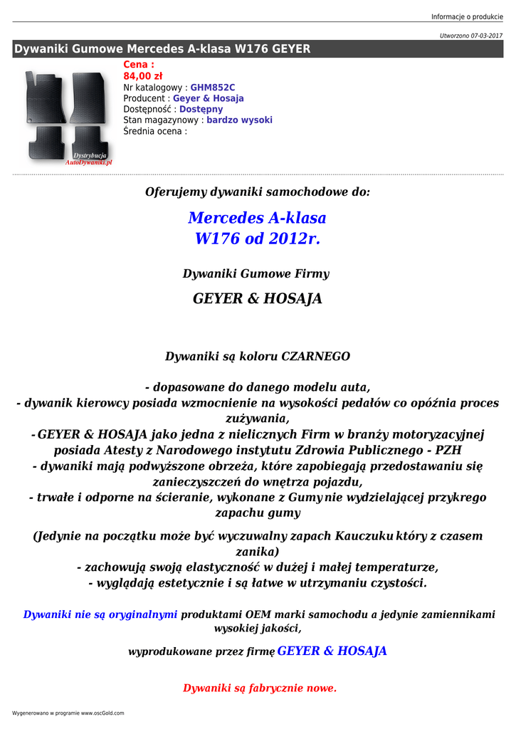 Informacje o produkcie Utworzono 07-03-2017 Dywaniki Gumowe Mercedes A-klasa W176 GEYER Cena : 84,00 zł Nr katalogowy : GHM852C Producent : Geyer & Hosaja Dostępność : Dostępny Stan magazynowy : bardzo wysoki Średnia ocena : Oferujemy dywaniki samochodowe do: Mercedes A-klasa W176 od 2012r. Dywaniki Gumowe Firmy GEYER & HOSAJA Dywaniki są koloru CZARNEGO - dopasowane do danego modelu auta, - dywanik kierowcy posiada wzmocnienie na wysokości pedałów co opóźnia proces zużywania, - GEYER & HOSAJA jako jedna z nielicznych Firm w branży motoryzacyjnej posiada Atesty z Narodowego instytutu Zdrowia Publicznego - PZH - dywaniki mają podwyższone obrzeża, które zapobiegają przedostawaniu się zanieczyszczeń do wnętrza pojazdu, - trwałe i odporne na ścieranie, wykonane z Gumy nie wydzielającej przykrego zapachu gumy (Jedynie na początku może być wyczuwalny zapach Kauczuku który z czasem zanika) - zachowują swoją elastyczność w dużej i małej temperaturze, - wyglądają estetycznie i są łatwe w utrzymaniu czystości. Dywaniki nie są oryginalnymi produktami OEM marki samochodu a jedynie zamiennikami wysokiej jakości, wyprodukowane przez firmę GEYER & HOSAJA Dywaniki są fabrycznie nowe. Wygenerowano w programie www.oscGold.com Uwaga: Odcień dywanika może odbiegać od tego co widać na monitorze gdyż odcień jaki państwo widzą zależy od ustawień monitora. Informacje o produkcie Wygenerowano w programie www.oscGold.com Klient ma prawo do zwrotu zakupionego towaru w ciągu 14 dni. Wystarczy oświadczenie odstąpienia od umowy, przed odesłaniem towaru prosimy o kontakt aby usprawnić procedurę zwrotu. Pobierz OŚWIADCZENIE O ODSTĄPIENIU OD UMOWY ZAWARTEJ NA ODLEGŁOŚĆ. KLIKNIJ TU Informacje o produkcie Wygenerowano w programie www.oscGold.com