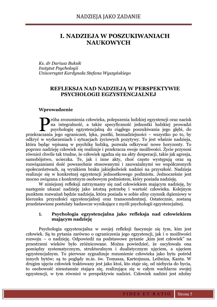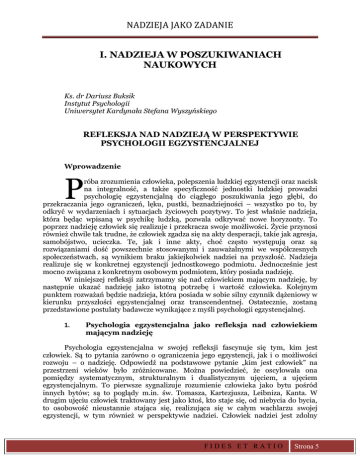 NADZIEJA JAKO ZADANIE I. NADZIEJA W POSZUKIWANIACH NAUKOWYCH Ks. dr Dariusz Buksik Instytut Psychologii Uniwersytet Kardynała Stefana Wyszyńskiego REFLEKSJA NAD NADZIEJĄ W PERSPEKTYWIE PSYCHOLOGII EGZYSTENCJALNEJ Wprowadzenie P róba zrozumienia człowieka, polepszenia ludzkiej egzystencji oraz nacisk na integralność, a także specyficzność jednostki ludzkiej prowadzi psychologię egzystencjalną do ciągłego poszukiwania jego głębi, do przekraczania jego ograniczeń, lęku, pustki, beznadziejności – wszystko po to, by odkryć w wydarzeniach i sytuacjach życiowych pozytywy. To jest właśnie nadzieja, która będąc wpisaną w psychikę ludzką, pozwala odkrywać nowe horyzonty. To poprzez nadzieję człowiek się realizuje i przekracza swoje możliwości. Życie przynosi również chwile tak trudne, że człowiek zgadza się na akty desperacji, takie jak agresja, samobójstwo, ucieczka. Te, jak i inne akty, choć często występują oraz są rozwiązaniami dość powszechnie stosowanymi i zauważalnymi we współczesnych społeczeństwach, są wynikiem braku jakiejkolwiek nadziei na przyszłość. Nadzieja realizuje się w konkretnej egzystencji jednostkowego podmiotu. Jednocześnie jest mocno związana z konkretnym osobowym podmiotem, który posiada nadzieję. W niniejszej refleksji zatrzymamy się nad człowiekiem mającym nadzieję, by następnie ukazać nadzieję jako istotną potrzebę i wartość człowieka. Kolejnym punktem rozważań będzie nadzieja, która posiada w sobie silny czynnik dążeniowy w kierunku przyszłości egzystencjalnej oraz transcendentnej. Ostatecznie, zostaną przedstawione postulaty badawcze wynikające z myśli psychologii egzystencjalnej. 1. Psychologia egzystencjalna jako refleksja nad człowiekiem mającym nadzieję Psychologia egzystencjalna w swojej refleksji fascynuje się tym, kim jest człowiek. Są to pytania zarówno o ograniczenia jego egzystencji, jak i o możliwości rozwoju – o nadzieję. Odpowiedź na podstawowe pytanie „kim jest człowiek” na przestrzeni wieków było zróżnicowane. Można powiedzieć, że oscylowała ona pomiędzy systematycznym, strukturalnym i dualistycznym ujęciem, a ujęciem egzystencjalnym. To pierwsze sygnalizuje rozumienie człowieka jako bytu pośród innych bytów; są to poglądy m.in. św. Tomasza, Kartezjusza, Leibniza, Kanta. W drugim ujęciu człowiek traktowany jest jako ktoś, kto staje się, od niebycia do bycia, to osobowość nieustannie stająca się, realizująca się w całym wachlarzu swojej egzystencji, w tym również w perspektywie nadziei. Człowiek nadziei jest zdolny FIDES ET RATIO Strona 5 przekraczać wszelkie granice ograniczoności. Egzystować oznacza nie tylko być sobą, ale także wziąć na siebie odpowiedzialność. Chodzi zatem o świadomy rozwój, a nie stagnację. Wyrażają to poglądy Kierkegaarda, Bubera, Jaspersa, Marcela, Tillicha1. Podłoże psychologii egzystencjalnej odnajdujemy w poglądach Martina Heideggera i Karla Jaspersa, którzy uznawani są za głównych przedstawicieli filozofii egzystencjalnej. Dla pełnego obrazu należy również zaznaczyć, że Martin Heidegger był fenomenologiem, a fenomenologia odegrała znaczącą rolę w psychologii. Jest ona opisem danych pochodzących z bezpośredniego doświadczenia. Podstawową ideą ontologii Heideggera jest rozumienie egzystencji jednostki jako „bycia-w-świecie” (dasein). „Dasein” nie jest właściwością czy atrybutem jednostki, ani też częścią jej bytu; jest to całość egzystencji ludzkiej. Jest to sposób bycia w świecie polegający na tym, że całość egzystencji jednostki, taka jaka ona jest i jaka ma być, może objawić się i stawać się obecna. Ludzie nie bytują poza światem, a świat nie istnieje jako odrębny od ludzi. Pojmowanie egzystencji jako „bycia-w-świecie” usuwa podział na podmiot i przedmiot i przywraca jedność pomiędzy ludźmi i światem. Człowiek może, jeśli tego pragnie, zrealizować w pełni możliwości swego bytu, w tym pragnienia zamknięte w pojęciu nadziei. Może żyć życiem autentycznym jedynie wtedy, gdy urzeczywistnia swoje możliwości, czyli również wtedy, gdy z nadzieją patrzy w przyszłość i akceptuje przeszłość. Jeśli ludzie ignorują lub ograniczają pełnię możliwości swojej egzystencji, albo też pozwalają się zdominować innym ludziom czy swojemu środowisku, ich egzystencja jest nieautentyczna. Człowiek zdominowany, ograniczony, to często człowiek bez nadziei. Życie autentyczne można osiągnąć, żyjąc w sposób zgodny ze swoim przeznaczeniem. W świetle powyższych rozważań, psychologię egzystencjalną określić można jako empiryczną naukę o egzystencji człowieka, posługującą się metodą analizy fenomenologicznej. Stara się ona raczej zrozumieć, niż wyjaśniać zjawiska. Psychologia egzystencjalna broni tezy głoszącej jedność bytu jednostki w świecie. Jednostka jest wolna i tylko ona sama jest odpowiedzialna za swoją egzystencję. Wolności nie można mieć, wolnym można tylko być. Człowiek, jeśli jest wolny, to jednocześnie i zarazem jest całkowicie odpowiedzialny za swoją egzystencję we wszystkich jej płaszczyznach. Realizowanie się jako byt ludzki jest trudnym zadaniem i tylko niewiele osób podejmuje ten trud2. To ciągłe stawanie się człowiekiem wymaga zatem nieustannej refleksji nad własną egzystencją. Można powiedzieć, iż w tym ciągłym stawaniu się, w głębokiej refleksji nad sobą, rodzi się człowiek nadziei. Pytania, stawiane przez psychologię egzystencjalną, to pytania o to, czym nadzieja w życiu człowieka nie jest lub też o to, co to znaczy mieć nadzieję. Z cała pewnością nadzieja nie jest pragnieniem posiadania coraz większej ilości różnych rzeczy materialnych, bo gdyby tak było, to ludźmi nadziei byliby ci wszyscy, którzy mają wiele dóbr. Życie jednak weryfikuje tę tezę, mówiąc, że to właśnie oni najczęściej