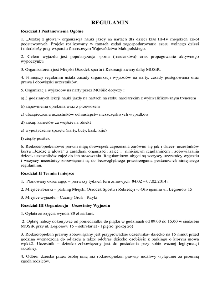 REGULAMIN Rozdział I Postanowienia Ogólne 1. „Jeżdżę z głową”- organizacja nauki jazdy na nartach dla dzieci klas III-IV miejskich szkół podstawowych. Projekt realizowany w ramach zadań zagospodarowania czasu wolnego dzieci i młodzieży przy wsparciu finansowym Województwa Małopolskiego. 2. Celem wyjazdu jest popularyzacja sportu (narciarstwa) oraz propagowanie aktywnego wypoczynku. 3. Organizatorem jest Miejski Ośrodek sportu i Rekreacji zwany dalej MOSiR. 4. Niniejszy regulamin ustala zasady organizacji wyjazdów na narty, zasady postępowania oraz prawa i obowiązki uczestników. 5. Organizacja wyjazdów na narty przez MOSiR dotyczy : a) 3 godzinnych lekcji nauki jazdy na nartach na stoku narciarskim z wykwalifikowanym trenerem b) zapewnieniu opiekuna wraz z przewozem c) ubezpieczeniu uczestników od następstw nieszczęśliwych wypadków d) zakup karnetów za wejście na obiekt e) wypożyczenie sprzętu (narty, buty, kask, kije) f) ciepły posiłek 6. Rodzice/opiekunowie prawni mają obowiązek zapoznania zarówno się jak i dzieci- uczestników kursu „Jeżdżę z głową” z zasadami organizacji zajęć i niniejszym regulaminem i zobowiązania dzieci- uczestników zajęć do ich stosowania. Regulaminem objęci są wszyscy uczestnicy wyjazdu i wszyscy uczestnicy zobowiązani są do bezwzględnego przestrzegania postanowień niniejszego regulaminu. Rozdział II Termin i miejsce 1. Planowany okres zajęć – pierwszy tydzień ferii zimowych 04.02 – 07.02.2014 r 2. Miejsce zbiórki – parking Miejski Ośrodek Sportu i Rekreacji w Oświęcimiu ul. Legionów 15 3. Miejsce wyjazdu – Czarny Groń - Rzyki Rozdział III Organizacja - Uczestnicy Wyjazdu 1. Opłata za zajęcia wynosi 80 zł za kurs. 2. Opłatę należy dokonywać od poniedziałku do piątku w godzinach od 09.00 do 15.00 w siedzibie MOSiR przy ul. Legionów 15 – sekretariat - I piętro (pokój 26) 3. Rodzic/opiekun prawny zobowiązany jest przyprowadzić uczestnika- dziecko na 15 minut przed godzina wyznaczoną do odjazdu a także odebrać dziecko osobiście z parkingu o którym mowa wpkt.2. Uczestnik – dziecko zobowiązany jest do posiadania przy sobie ważnej legitymacji szkolnej. 4. Odbiór dziecka przez osobę inną niż rodzic/opiekun prawny możliwy wyłącznie za pisemną zgodą rodziców. 5. Przed zaplanowanym odjazdem opiekun odczyta listę uczestników. 6. Uczestnik powinien stosować się do poleceń instruktora i opiekuna. 7. Każdy uczestnik wyjazdu zobowiązany jest do stosownego zachowywania się podczas jazdy środkiem transportu, przestrzegania niniejszego regulaminu oraz wszelkich regulaminów obowiązujących w danej stacji narciarskiej, w tym m.in.: jazdy na wyciągu narciarskim, zjazdów ze stoku. 8. W przypadku gdy uczestnik wyjazdu, wbrew złożonemu oświadczeniu, posiadał umiejętności jazdy na nartach, stwierdzone przez Instruktora narciarstwa, Organizator może odmówić dalszego udziału uczestnika w wyjazdach i odstąpić od zawartej umowy, bez prawa zwrotu uiszczonej opłaty. Rozdział IV Przepisy końcowe Wpisanie dziecka na organizowany przez MOSiR kurs „Jeżdżę z głową” jest równoznaczne z zapoznaniem się rodziców/opiekunów z niniejszym Regulaminem, akceptacją jego postanowień i zobowiązaniem się i dzieci przestrzegania ich .
