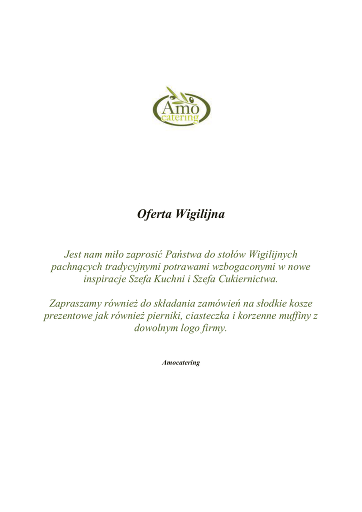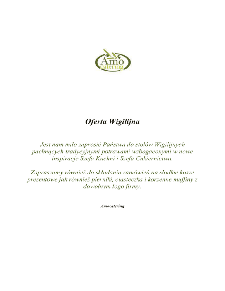 Oferta Wigilijna Jest nam miło zaprosić Państwa do stołów Wigilijnych pachnących tradycyjnymi potrawami wzbogaconymi w nowe inspiracje Szefa Kuchni i Szefa Cukiernictwa. Zapraszamy również do składania zamówień na słodkie kosze prezentowe jak również pierniki, ciasteczka i korzenne muffiny z dowolnym logo firmy. Amocatering Zestaw 1 barszcz czerwony czysty opiekane na złoto pierogi z kapustą i z grzybami paszteciki z grzybami z ciasta półfrancuskiego oprószone kminkiem ryba po grecku karp po żydowsku śledź na trzy sposoby sałatka jarzynowa kosz pieczywa piernik z rumem i konfiturą śliwkową w czekoladzie kutia jabłecznik z szarą renetą, cynamonem i cukrem pudrem aromatyczny kompot z suszu *Cena zestawu od 60 PLN netto. Cena zawiera realizację powyższego menu, transport, dekoracje stołów, zastawę porcelanową, obsługę kelnerską. Zestaw 2 barszcz rubinowy czysty opiekane na złoto pierogi z kapustą i z grzybami półkruche paszteciki z kapustą i grzybami oprószone kminkiem roladki z soli z marchewką i selerem w sosie limonkowym kapusta wigilijna duszona ze śliwką i wytrawnym winem śledzie pod pierzynką ze świeżym chilli roszpunka z buraczkami i chrupiącym boczkiem terrina z łososia na pieczywie razowym roladki z indyka pieczone z żurawiną sałatka z tuńczyka, salami i ryżu sałatka z gruszek, orzechów włoskich i sera aksamitnego kosz pieczywa makowiec lukrowany z nutą pomarańczy kutia sernik klasyczny piernik ze śliwką duszoną w brendy tarta gruszkowa wigilijny kompot z suszu *Cena zestawu od 75 PLN netto. Cena zawiera realizację powyższego menu, transport, dekoracje stołów, zastawę porcelanową, obsługę kelnerską. Zestaw 3 - zupa borowikowa aromatyzowana suszonymi grzybami - opiekane na złoto pierogi z kapustą i z grzybami - półkruche paszteciki z kapustą i grzybami oprószone kminkiem - sola duszona w porach i białym winie - ryba z salsą pomidorową i oliwkami - roladki śledziowe - ryba po żydowsku - karp w galarecie - pieczyste domowe aromatyzowane leśnymi grzybami, rodzynkami, żurawiną - sałatka z tuńczyka i świeżych pomidorów - śledź z pieprzem i czerwoną cebulką - warzywa z sosem pistacjowym; cykoria, koper włoski, ogórek, kalafior - foccacia z krążkami cebuli i oregano - kosz pieczywa - jabłecznik z aromatyzowany cynamonem, goździkami z szarej renety, posypany cukrem pudrem - pierniczki lukrowane - makowiec z nutą pomarańczy - keks - korzenna panna cotta z karmelizowaną pomarańczą - ciasto miodowe z kremem waniliowym - herbata aromatyzowana goździkami, imbirem i pomarańczą - kompot z suszu *Cena zestawu od 85 PLN netto. Cena zawiera realizację powyższego menu, transport, dekorację stołów, obsługę kelnerską. Przykładowe dania ciepłe do indywidualnego uzgodnienia: Żurek z grzybami Bulion z łososiem Krem leśny z grzankami Polenta aromatyzowana grzybami Pieczone ziemniaki z pieczarkami Gołąbki z grzybami Gołąbki z ryby w sosie cebulowo pomidorowym Linguine z grzybami i świeżymi ziołami Placek ziemniaczany zapiekany z grzybami Łosoś w miętowym sosie musztardowym Łosoś marynowany z koperkiem Dorsz z zimowymi warzywami Indyczka faszerowana jabłkami i rodzynkami Szynka pieczona z miodem i goździkami Wieprzowina z czerwoną kapustą, morelami i rodzynkami Cielęcina z koprem włoskim i kaparami Królik w ziołach ze śliwkami i żurawiną Eskalopki wieprzowe z szynką parmeńską i kremowym sosem grzybowym Pieczeń z tymiankiem Gęś w sosie różanym Oraz wiele innych propozycji przygotowanych specjalnie na życzenie naszych Klientów Zapraszamy do współpracy www.amocatering.pl Tel. 0048 602 579 565
