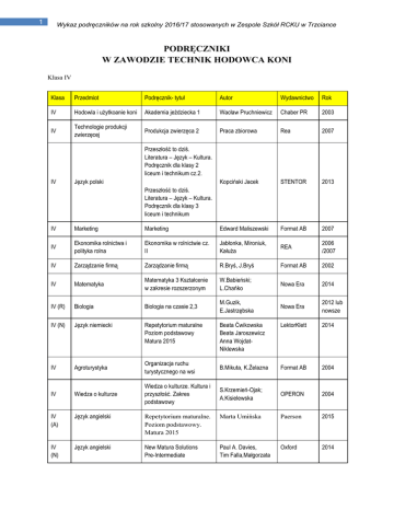 1 Wykaz podręczników na rok szkolny 2016/17 stosowanych w Zespole Szkół RCKU w Trzciance PODRĘCZNIKI W ZAWODZIE TECHNIK HODOWCA KONI Klasa IV Klasa Przedmiot Podręcznik- tytuł Autor Wydawnictwo Rok IV Hodowla i użytkoanie koni Akademia jeździecka 1 Wacław Pruchniewicz Chaber PR 2003 IV Technologie produkcji zwierzęcej Produkcja zwierzęca 2 Praca zbiorowa Rea 2007 Kopciński Jacek STENTOR 2013 Przeszłość to dziś. Literatura – Język – Kultura. Podręcznik dla klasy 2 liceum i technikum cz.2. IV Język polski Przeszłość to dziś. Literatura – Język – Kultura. Podręcznik dla klasy 3 liceum i technikum IV Marketing Marketing Edward Maliszewski Format AB 2007 IV Ekonomika rolnictwa i polityka rolna Ekonomika w rolnictwie cz. II Jabłonka, Mironiuk, Kałuża REA 2006 /2007 IV Zarządzanie firmą Zarządzanie firmą R.Bryś, J.Bryś Format AB 2002 IV Matematyka Matematyka 3 Kształcenie w zakresie rozszerzonym W.Babieński; L.Chańko Nowa Era 2014 IV (R) Biologia Biologia na czasie 2,3 M.Guzik, E.Jastrzębska Nowa Era 2012 lub nowsze IV (N) Język niemiecki Repetytorium maturalne Poziom podstawowy Matura 2015 Beata Ćwikowska Beata Jaroszewicz Anna WojdatNiklewska LektorKlett 2014 IV Agroturystyka Organizacja ruchu turystycznego na wsi B.Mikuta, K.Żelazna Format AB 2004 IV Wiedza o kulturze Wiedza o kulturze. Kultura i przyszłość. Zakres podstawowy S.Krzemień-Ojak; A.Kisielewska OPERON 2004 IV (A) Język angielski Repetytorium maturalne. Poziom podstawowy. Matura 2015 Marta Umińska Paerson 2015 IV (N) Język angielski New Matura Solutions Pre-Intermediate Paul A. Davies, Tim Falla,Małgorzata Oxford 2014 2 Wykaz podręczników na rok szkolny 2016/17 stosowanych w Zespole Szkół RCKU w Trzciance Wieruszewska IV Historia i społeczeństwo. Przedmiot uzupełniający. Podręcznik podam we wrześniu
