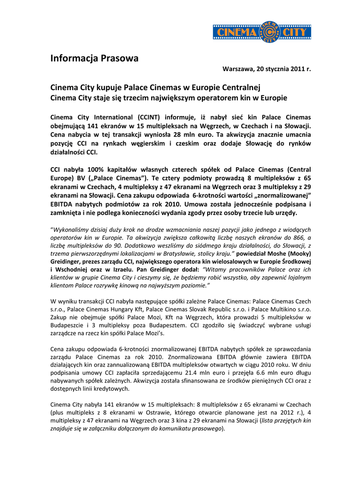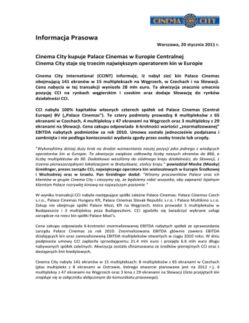 Informacja Prasowa Warszawa, 20 stycznia 2011 r. Cinema City kupuje Palace Cinemas w Europie Centralnej Cinema City staje się trzecim największym operatorem kin w Europie Cinema City International (CCINT) informuje, iż nabył sieć kin Palace Cinemas obejmującą 141 ekranów w 15 multipleksach na Węgrzech, w Czechach i na Słowacji. Cena nabycia w tej transakcji wyniosła 28 mln euro. Ta akwizycja znacznie umacnia pozycję CCI na rynkach węgierskim i czeskim oraz dodaje Słowację do rynków działalności CCI. CCI nabyła 100% kapitałów własnych czterech spółek od Palace Cinemas (Central Europe) BV („Palace Cinemas”). Te cztery podmioty prowadzą 8 multipleksów z 65 ekranami w Czechach, 4 multipleksy z 47 ekranami na Węgrzech oraz 3 multipleksy z 29 ekranami na Słowacji. Cena zakupu odpowiada 6-krotności wartości „znormalizowanej” EBITDA nabytych podmiotów za rok 2010. Umowa została jednocześnie podpisana i zamknięta i nie podlega konieczności wydania zgody przez osoby trzecie lub urzędy. “Wykonaliśmy dzisiaj duży krok na drodze wzmacniania naszej pozycji jako jednego z wiodących operatorów kin w Europie. Ta akwizycja zwiększa całkowitą liczbę naszych ekranów do 866, a liczbę multipleksów do 90. Dodatkowo weszliśmy do siódmego kraju działalności, do Słowacji, z trzema pierwszorzędnymi lokalizacjami w Bratysławie, stolicy kraju.” powiedział Moshe (Mooky) Greidinger, prezes zarządu CCI, największego operatora kin wielosalowych w Europie Środkowej i Wschodniej oraz w Izraelu. Pan Greidinger dodał: “Witamy pracowników Palace oraz ich klientów w grupie Cinema City i cieszymy się, że będziemy robić wszystko, aby zapewnić lojalnym klientom Palace rozrywkę kinową na najwyższym poziomie.” W wyniku transakcji CCI nabyła następujące spółki zależne Palace Cinemas: Palace Cinemas Czech s.r.o., Palace Cinemas Hungary Kft, Palace Cinemas Slovak Republic s.r.o. i Palace Multikino s.r.o. Zakup nie obejmuje spółki Palace Mozi, Kft na Węgrzech, która prowadzi 5 multipleksów w Budapeszcie i 3 multipleksy poza Budapesztem. CCI zgodziło się świadczyć wybrane usługi zarządcze na rzecz kin spółki Palace Mozi’s. Cena zakupu odpowiada 6-krotności znormalizowanej EBITDA nabytych spółek ze sprawozdania zarządu Palace Cinemas za rok 2010. Znormalizowana EBITDA głównie zawiera EBITDA działających kin oraz zannualizowaną EBITDA multipleksów otwartych w ciągu 2010 roku. W dniu podpisania umowy CCI zapłaciła sprzedającemu 21.4 mln euro i przejęła 6.6 mln euro długu nabywanych spółek zależnych. Akwizycja została sfinansowana ze środków pieniężnych CCI oraz z dostępnych linii kredytowych. Cinema City nabyła 141 ekranów w 15 multipleksach: 8 multipleksów z 65 ekranami w Czechach (plus multipleks z 8 ekranami w Ostrawie, którego otwarcie planowane jest na 2012 r.), 4 multipleksy z 47 ekranami na Węgrzech oraz 3 kina z 29 ekranami na Słowacji (lista przejętych kin znajduje się w załączniku dołączonym do komunikatu prasowego). Zagregowane wyniki Palace Cinemas Komentarz Moshe (Mooky) Greidinger: „W ciągu najbliższych dwóch lat planujemy inwestycje w nabyte kina aby podnosić ich standard oraz dodać wystarczającą liczbę projektorów cyfrowych aby sprostać oczekiwanemu popytowi na filmy 3D. W Czechach i na Węgrzech zamierzamy zintegrować nasze organizacje, wprowadzając nasz sprawdzony model biznesowy oraz narzędzia stosowane w zarządzaniu spółką, które, jak oczekujemy, dostarczą znaczącą wartość dodaną w całości naszej działalności na tych rynkach. Wierzymy, że ta integracja będzie także z korzyścią dla naszej reklamy kinowej”. Cinema City International jest największym operatorem kin wielosalowych w Europie Środkowej i Wschodniej oraz w Izraelu. Spółka prowadzi 90 multipleksy z 866 ekranami, w 7 krajach: Polska, Czechy, Węgry, Rumunia, Bułgaria, Słowacja i Izrael. Obecnie w budowie jest 35 multipleksów z około 360 nowymi ekranami. Dodatkowo, Cinema City prowadzi działalności związane z działalnością kinową: reklamę w kinach oraz dystrybucję filmów. W 2010 r. Cinema City sprzedała 30,5 mln biletów w 6 krajach (11,1% więcej niż w 2009 r.). Grupa Cinema City zatrudnia ponad 4,000 osób w 7 krajach. Palace Cinemas zostało założone przez Arthura Goldblatta i V.J Maury’ego przy wsparciu finansowym Argus Capital Partners L.P. (“ARGUS”). ARGUS jest jednym z największych I najbardziej doświadczonych niezależnych prywatnych funduszy inwestycyjnych skupiających się na regionie Europy Środkowej i Wschodniej. ARGUS jest wspierany przez wiodących inwestorów instytucjonalnych oraz firmy zarządzające majątkami rodzinnymi z Europy, Ameryki Północnej, Środkowego Wschodu i Japonii. Z łącznym zaangażowaniem w fundusze przekraczającycm 400 milionów euro ARGUS zainwestował w 16 spółek w regionie, w tym w wiele wiodących i znanych spółek. Poprzez ośmiu specjalistów od inwestycji pracujących w regionie (Polska, Czechy, Węgry, Rumunia i Wielka Brytania) ARGUS oferuje finansowanie wykupów oraz ekspansji sprzedającym spółki oraz zarządom, które chcą rozwijać swoje spółki. W celu uzyskania dodatkowych informacji prosimy o kontakt: Joanna Kotłowska Dyrektor Investor Relations tel. (+48) 22 566 69 60 / mobile: (+48) 510 024 028 [email protected] Piotr Wojtaszek NBS Communications tel. (+48) 22 826 74 18 / mobile (+48) 500 202 355 [email protected] Załącznik Lokalizacja Miasto Liczba ekranów Liczba miejsc 1. Park Hostivar Praga 8 1.730 2. Slovansky Dum Praga 10 1.839 3. Novy Smichov Praga 12 2.702 4. Letnany Praga 8 2.223 5. Olympia SC Brno 10 2.287 6. Velky Spalicek Brno 7 1.406 7. Forum Uście nad Łabą 5 664 8. Forum Liberec 5 868 9. Karolina Ostrawa 8 1.208* 65 +8 13,719 + 1,208 Czechy 1. MOM Park Budapeszt 9 2.467 2. West End SC Budapeszt 14 3.039 3. Campona SC Budapeszt 11 2.391 4. Mammut 1 & 2 Budapeszt 13 2.291