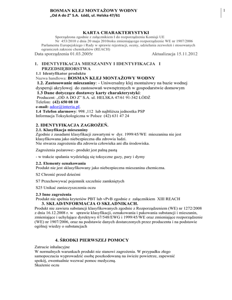 1 BOSMAN KLEJ MONTAŻOWY WODNY „Od A do Z” S.A. Łódź, ul. Helska 47/61 KARTA CHARAKTERYSTYKI Sporządzona zgodnie z załącznikiem I do rozporządzenia Komisji UE Nr 453/2010 z dnia 20 maja 2010roku zmieniającego rozporządzenie WE nr 1907/2006 Parlamentu Europejskiego i Rady w sprawie rejestracji, oceny, udzielania zezwoleń i stosowanych ograniczeń zakresie chemikaliów (REACH) Data sporządzenia 01.03.2005r Aktualizacja 15.11.2012 1. IDENTYFIKACJA MIESZANINY I IDENTYFIKACJA I PRZEDSIĘBIORSTWA 1.1 Identyfikator produktu Nazwa handlowa: BOSMAN KLEJ MONTAŻOWY WODNY 1.2. Zastosowanie mieszaniny: - Uniwersalny klej montażowy na bazie wodnej dyspersji akrylowej do zastosowań wewnętrznych w gospodarstwie domowym 1.3 Dane dotyczące dostawcy karty charakterystyki: Producent: „OD A DO Z” S.A. ul. HELSKA 47/61 91-342 ŁÓDŹ Telefon: (42) 650 08 10 e-mail: [email protected]. 1.4 Telefon alarmowy: 998 ,112 lub najbliższa jednostka PSP Informacja Toksykologiczna w Polsce (42) 631 47 24 2. IDENTYFIKACJA ZAGROŻEŃ. 2.1. Klasyfikacja mieszaniny Zgodnie z zasadami klasyfikacji zawartymi w dyr. 1999/45/WE mieszanina nie jest klasyfikowana jako niebezpieczna dla zdrowia ludzi. Nie stwarza zagrożenia dla zdrowia człowieka ani dla środowiska. Zagrożenia pożarowe:- produkt jest palną pastą - w trakcie spalania wydzielają się toksyczne gazy, pary i dymy 2.2. Elementy oznakowania Produkt nie jest sklasyfikowany jako niebezpieczna mieszanina chemiczna. S2 Chronić przed dziećmi S7 Przechowywać pojemnik szczelnie zamkniętych S25 Unikać zanieczyszczenia oczu 2.3 Inne zagrożenia Produkt nie spełnia kryteriów PBT lub vPvB zgodnie z załącznikiem XIII REACH 3. SKŁAD/INFORMACJA O SKŁADNIKACH. Produkt nie zawiera substancji klasyfikowanych zgodnie z Rozporządzeniem (WE) nr 1272/2008 z dnia 16.12.2008 r. w sprawie klasyfikacji, oznakowania i pakowania substancji i mieszanin, zmieniające i uchylające dyrektywy 67/548/EWG i 1999/45/WE oraz zmieniające rozporządzenie (WE) nr 1907/2006, oraz na podstawie danych dostarczonych przez producenta i na podstawie ogólnej wiedzy o substancjach 4. ŚRODKI PIERWSZEJ POMOCY Zatrucie inhalacyjne W normalnych warunkach produkt nie stanowi zagrożenia. W przypadku złego samopoczucia wyprowadzić osobę poszkodowaną na świeże powietrze, zapewnić spokój, ewentualnie wezwać pomoc medyczną. Skażenie oczu BOSMAN KLEJ MONTAŻOWY WODNY „Od A do Z” S.A. Łódź, ul. Helska 47/61 Usunąć szkła kontaktowe, przemyć oczy dużą ilością wody przez ok. 15 minut. Podczas płukania trzymać powieki szeroko otwarte i poruszać gałką oczną (unikać silnego strumienia wody ze względu na ryzyko uszkodzenia rogówki) Zwrócić się o pomoc do lekarza okulisty. Skażenie skóry Zdjąć zanieczyszczoną odzież, skażoną skórę zmyć dokładnie dużą ilością wody, najlepiej bieżącej(nie gorącej). W przypadku utrzymywania się podrażnienia, posmarować skórę kremem i skonsultować się z lekarzem. Spożycie W przypadku połknięcia natychmiast zapewnić pomoc lekarską 5. POSTĘPOWANIE W PRZYPADKU POŻARU Produkt jest palną pastą. Środki gaśnicze właściwe dla palącego się w otoczeniu materiału. Uwaga: Produkt po odparowaniu z niego wody, tworzy masę polimeru, która może ulec zapaleniu. Palne są również odpady skoagulowanej emulsji. 5.1 Środki gaśnicze : dwutlenek węgla, (gaśnica śniegowa), proszek gaśniczy, prądy wodne rozproszone, piana gaśnicza odporna na działanie alkoholu nie stosować zwartych strumieni wodnych. proszki gaśnicze, piany, rozproszone prądy wodne Nieodpowiednie środki gaśnicze nie stosować zwartych strumieni wody . 5.2 Szczególne zagrożenia związane z substancją lub mieszaniną Zalecenia ogólne: Zawiadomić otoczenie o pożarze. Usunąć z obszaru zagrożenia wszystkie osoby postronne. W razie potrzeby wezwać Straż Pożarną i Policję. Zbiorniki narażone na działanie ognia lub wysokiej temperatury chłodzić wodą z bezpiecznej odległości, a jeżeli to możliwe usunąć je z obszaru zagrożenia. Podczas spalania preparatu powstają dymy zawierające niebezpieczne dla zdrowia substancje chemiczne, m.in. tlenki węgla. 5.3 Informacje dla straży pożarnej -odzież ochronna gazoszczelna, aparat izolujący drogi oddechowe 6. POSTĘPOWANIE W PRZYPADKU NIEZAMIERZONEGO UWOLNIENIA DO ŚRODOWISKA Zalecenia ogólne: Zawiadomić otoczenie o awarii, usunąć z obszaru zagrożenia wszystkie osoby nie biorące udziału w likwidowaniu awarii – w razie potrzeby wezwać ekipy ratownicze – Straż Pożarną i Policję. 6.1 Indywidualne środki ostrożności, wyposażenie ochronne: Ubrania robocze ze zwartej tkaniny, rękawice z tworzywa odpornego na działanie węglowodorów, buty z tworzywa nitrylowego, okulary ochronne w szczelnej obudowie. 6.2 Środki ostrożności w zakresie ochrony środowiska: Nie dopuścić do przedostania się do kanalizacji i cieków wodnych. Zabezpieczyć studzienki ściekowe. Nie dopuszczać do zanieczyszczenia wód powierzchniowych i gruntowych lub niżej położonych terenów, jeśli to możliwe, zlikwidować wyciek (np. zamknąć wypływ produktu, uszczelnić uszkodzone opakowanie)Zabezpieczyć studzienki ściekowe. W przypadku skażenia wód powiadomić odpowiednie władze. 6.3 Metody i materiały zapobiegające rozprzestrzenianiu się skażenia: 2 BOSMAN KLEJ MONTAŻOWY WODNY „Od A do Z” S.A. Łódź, ul. Helska 47/61 Zabezpieczyć uszkodzone opakowania, zebraną przy pomocy piasku, trocin, ziemi okrzemkowej ze środowiska ciecz umieścić w opakowaniu zastępczym i skierować do zniszczenia. 7. POSTĘPOWANIE Z MIESZANINAMI ORAZ ICH MAGAZYNOWANIE 7.1 Środki ostrożności dotyczące bezpiecznego postępowania Chronić oczy, skórę i odzież przed kontaktem z produktem. Nie wdychać oparów. Nie jeść, nie pić podczas stosowania preparatu. Nosić odpowiednią odzież ochronną. Pracować w dobrze wentylowanych pomieszczeniach. Przestrzegać podstaw