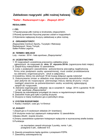 Zakładowe rozgrywki piłki nożnej halowej "Saller - Radwansport Liga - Zbąszyń 2014" REGULAMIN: I. CEL 1.Popularyzacja piłki nożnej w środowisku zbąszyńskim. 2.Rozwój sprawności fizycznej poprzez udział w rozgrywkach. 2.Wyłonienie najlepszej drużyny zakładowej w piłce nożnej. II. ORGANIZATORZY: Zbąszyńskie Centrum Sportu, Turystyki i Rekreacji. Radwansport Nowy Tomyśl, Saller-Polska Legnica. III. TERMIN I MIEJSCE Luty - marzec 2014 - hala sportowa „Zbąszynianka”. IV. UCZESTNICTWO 1. W rozgrywkach uczestniczą pracownicy zakładów pracy zgłoszonych do rozgrywek do dnia 31 stycznia 2014r. (ograniczona ilość miejsc) 2. Zespół liczy maksymalnie 12 zawodników. 3. Lista z podpisami zawodników potwierdzona pieczątką nagłówkową firmy oraz podpisem osoby upoważnionej, musi zostać przedstawiona na zebraniu organizacyjnym. (druk w załączniku) 4.Uczestnicy, którzy nie ukończyli 18 lat muszą dołączyć zgodę rodziców! 5. Dokonywanie zmian w składzie oraz dopisywanie zawodników możliwe jest jedynie do rozpoczęcia pierwszego meczu danej drużyny i musi nastąpić pisemnie za potwierdzeniem osoby wcześniej zgłaszającej zespół do rozgrywek. 6. Zebranie organizacyjne odbędzie się w czwartek 6 lutego 2014 o godzinie 18.30 w hali sportowej „Zbąszynianka”. 7.Zespoły są zobowiązane przystąpić do meczu w regulaminowym składzie. 8. Zawodnik może grać tylko w jednej drużynie. 9. Drużyna w miarę możliwości gra w jednolitym stroju. V. SYSTEM ROZGRYWEK 1. Każdy z każdym, czas gry 1x15minut VI .ZASADY 1.Zespół gra w 5-osobowym składzie (4+ bramkarz). 2.W drużynie może być zapisanych maksymalnie 12 zawodników. 3.Boisko 20x40 ; bramki 2mx3m. 4.Zmiany zawodników systemem hokejowym wyłącznie w wyznaczonej strefie boiska 5.Punktacja: - za zwycięstwo zespół otrzymuje 3 punkty, remis 1 pkt., przegrana 0 pkt., walkower 5:0. 6. Zawody prowadzone będą zgodnie z przepisami PZPN. 7. Zawodnicy zobowiązania są: przestrzegać przepisów gry w piłkę nożną przestrzegać zasady fair- play Sędziowie mają prawo do upomnienia (żółta kartka) lub wykluczenia zawodnika (kartka czerwona). Otrzymanie żółtej kartki równoznaczne jest z karą 2 minut dla zawodnika. W przypadku utraty bramki przez zespół zdekompletowany za zgodą sędziego może uzupełnić skład przed upływem 2 minut kary. W przypadku gdy żółtą kartkę otrzymują zawodnicy obydwu drużyn, w wyniku czego ich składy są osłabione równą liczba zawodników, nie ma możliwości uzupełnienia zespołu po utracie bramki. Zawodnik wykluczony z gry (czerwona kartka) nie ma prawa powrócić na boisko ani zajmować miejsca na ławce rezerwowych. Drużyna, która jest zdekompletowana na skutek czerwonej kartki przez 2min, po tym czasie może wejść na boisko zawodnik który nie był ukarany czerwonym kartonikiem Zawodnik ukarany czerwonym kartonikiem pauzuje w następnym meczu swojej drużyny W rozgrywkach ligi obowiązuje zasada „Fauli Akumulowanych” – 5, 7,9,11 itd. faul drużyny, karany jest rzutem karnym przedłużonym ( 9 metr). Gra „wślizgiem” traktowana jest jako faul z wyjątkiem gdy „wślizg” wykonany został co najmniej 1,5 metra od przeciwnika, nie powodował z nim kontaktu lub utrudnienia gry. Zagranie przez zawodnika ręką zaliczane jest jako faul. Gra w parterze jest zabroniona. Czas może być zatrzymywany tylko na żądanie sędziego. Rzut rożny wykonywany jest z narożnika pola gry wyznaczonego trójkątem o bokach 30x30 cm i podstawie 42 cm. Aut wykonywany jest z linii bocznej. Piłka stojąca podana może zostać tylko nogą. Zawodnik drużyny przeciwnej musi się znajdować przynajmniej 2 metry od wprowadzającego piłkę do gry. Specjalne przeszkadzanie w wykonywaniu autu będzie karane upomnieniem. Jeżeli piłka uderzy w konstrukcje dachową to gra zostaje przerwana przez sędziego. Wznowienia dokonuje drużyna przeciwna z miejsca w którym linia boczna boiska łączy się z linią błędu. Po każdym faulu dyktowany jest rzut wolny bezpośredni. Jeżeli faul nastąpił w polu karnym dyktowany jest rzut karny, wykonywany z 7 metra. Na wprowadzenie piłki z autu, drużyna ma maksymalnie 4 sekundy od momentu ustawienia piłki na linii. Sędzia decyduje czy rzut wolny ma być wykonywany na gwizdek. Zespoły rozegrają mecze systemem „każdy z każdym”. W przypadku rażąco niesportowego zachowania w trakcie pobytu na boisku jak i na widowni organizatorzy mają prawo do ukarania zawodników lub całej drużyny przez odsunięcie z rozgrywek. Za czynną napaść na sędziego, innego zawodnika lub współpartnera zawodnikowi grozi dożywotnia dyskwalifikacja. VII. Klasyfikacja 1.Za zwycięstwo zespół otrzymuje 3 punkty, remis 1 pkt., przegrana 0 pkt., walkower 5:0. 2.O kolejności zajętych miejsc decyduje: większa liczba dużych pkt., bezpośredni mecz, lepszy stosunek bramek, większa ilość strzelonych bramek, mniejsza ilość straconych bramek. 3. W przypadku wycofania się któreś z drużyn z ligi przed zakończeniem rozgrywek wszystkie wyniki meczów z udziałem tej drużyny traktuje się jako walkowery (5:0). VII. NAGRODY I WYRÓŻNIENIA 1.Za miejsca I-III drużyny otrzymają puchary ufundowane przez ZCSTiR, SallerPolska i Radwansport. 2. Za zajęcie I miejsca drużyna otrzymuje komplet strojów ufundowanych przez organizatorów. 3. Za zajęcie I miejsca każdy zawodnik otrzymuje torbę sportową ufundowaną przez organizatorów. 4. Za zajęcie II miejsca każdy zawodnik otrzymuje torbę sportową ufundowaną przez organizatorów. 5. Za zajęcie III miejsca każdy zawodnik otrzymuje torbę sportową ufundowaną przez organizatorów. 6.Wszystkie pozostałe drużyny otrzymają dyplomy. 7.Król strzelców i bramkarz oraz MVP otrzymuje bony towarowe o wartości 300 zł. każdy, na zakup dowolnego towaru marki SALLER w sklepie Piłkarskim Radwansport w Nowym Tomyślu . VIII SPRAWY RÓŻNE W przypadku wątpliwości czy zawodnik