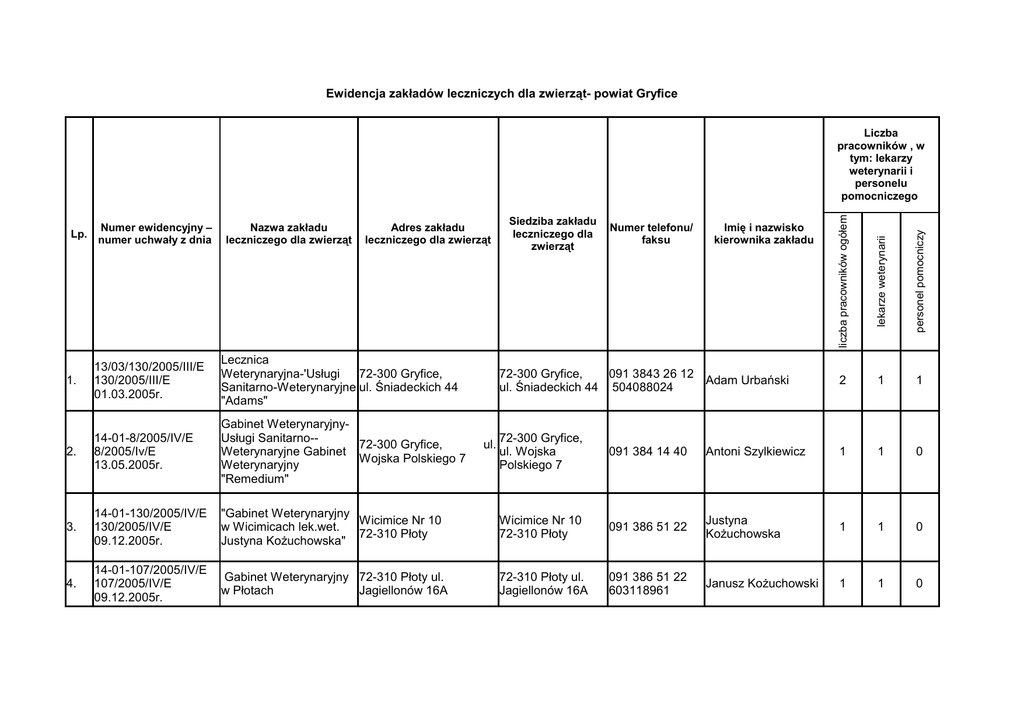 Ewidencja zakładów leczniczych dla zwierząt- powiat Gryfice personel pomocniczy Numer ewidencyjny – numer uchwały z dnia lekarze weterynarii Lp. liczba pracowników ogółem Liczba pracowników , w tym: lekarzy weterynarii i personelu pomocniczego 72-300 Gryfice, 091 3843 26 12 Adam Urbański ul. Śniadeckich 44 504088024 2 1 1 72-300 Gryfice, ul. Wojska Polskiego 7 091 384 14 40 Antoni Szylkiewicz 1 1 0 "Gabinet Weterynaryjny Wicimice Nr 10 w Wicimicach lek.wet. 72-310 Płoty Justyna Kożuchowska" Wicimice Nr 10 72-310 Płoty 091 386 51 22 Justyna Kożuchowska 1 1 0 Gabinet Weterynaryjny 72-310 Płoty ul. w Płotach Jagiellonów 16A 72-310 Płoty ul. Jagiellonów 16A 091 386 51 22 603118961 Janusz Kożuchowski 1 1 0 Nazwa zakładu leczniczego dla zwierząt Adres zakładu leczniczego dla zwierząt 1. 13/03/130/2005/III/E 130/2005/III/E 01.03.2005r. Lecznica Weterynaryjna-'Usługi 72-300 Gryfice, Sanitarno-Weterynaryjne ul. Śniadeckich 44 "Adams" 2. 14-01-8/2005/IV/E 8/2005/Iv/E 13.05.2005r. Gabinet WeterynaryjnyUsługi Sanitarno-72-300 Gryfice, Weterynaryjne Gabinet Wojska Polskiego 7 Weterynaryjny "Remedium" 3. 14-01-130/2005/IV/E 130/2005/IV/E 09.12.2005r. 4. 14-01-107/2005/IV/E 107/2005/IV/E 09.12.2005r. ul. Siedziba zakładu leczniczego dla zwierząt Numer telefonu/ faksu Imię i nazwisko kierownika zakładu 5. 6. 14-02-123/2005/IV/E 123/2005/IV/E 09.12.2005r. 14-01-116/2005/IV/E 116/2005/IV/E 09.12.2005r. 14-01-182/2005/IV/E 182/IV/2005/E 21.12.2005r. 14-01-185/2005/IV/E 185/2005/IV/E 21.12.2005r. "Przychodnia WeterynaryjnaWaldemar Romanczukiewicz" 72-320 Trzebiatów, ul. II-Go Pułku Ułanów 18A "Gabinet Weterynaryjny 72-304 Brojce, Bronisław Czerewaty Parkowa 10/2 lek.wet." 72-320 Trzebiatów, ul. II-Go Pułku 091 387 21 44 Ułanów 18A ul. 72-304 Brojce, ul. Parkowa 10/2 091 386 11 24 Waldemar Romańczukiewicz 1 1 0 Broniosław Czerewaty 1 1 0 Gabinet Weterynaryjny 72-300 Gryfice, ul. Słowiańska 25 72-300 Gryfice, ul. 091 384 64 14 Słowiańska 25 603706763 Jolanta Gliwa 1 1 0 Gabinet Weterynaryjny 72-343 Karnice, ul. Szkolna 17 72-343 Karnice, ul. 091 386 82 13 Szkolna 17 Waldemar Choina 1 1 0 14-01-164/2005/IV/E 164/2005/Iv/E 21.12.22005r. Gabinet Weterynaryjny-"Usługi Sanitarno-Weterynaryjne Gabinet Weterynaryjny Antoszuk" 72-300 GRYFICE ul. Śniadeckich 44 72-300 GRYFICE 091 384 83 14 ul. Śniadeckich 44 Tadeusz Antoszuk 1 1 0 14-01-155/2005/IV/E 10. 155/2005/IV/E 21.12.2005r. Gabinet Weterynaryjny 72-320 Trzebiatow, ul. Rzemieślnicza 19 72-320 Trzebiatow, 091 3873224 ul. Rzemieślnicza 696458112 19 Wacław Łuniewski 1 1 0 14-01-145/2005/IV/E 11. 145/2005.IV/E 21.12.2005r. Gabinet Weterynaryjny-"Usługi Weterynaryjne Lech Januszewski" 72-320 Trzebiatow, Nowielice 21 72-320 Trzebiatow, 091 3876088 Nowielice 21 601739675 Lech Januszewski 1 1 0 14-02-170/2005/IV/E 12. 170/2005/Iv/E 21.12.2005r. Przychodnia Weterynaryjna-Usługi Sanitarno-Weterynryjne 72-410 Golczewo, ul. s.c. Mruk T. i Kamieńska 10 Nadskakulski H. 72-410 Golczewo, ul. Kamieńska 10" 72-300 Gryfice, ul. 913 845 840 Mickiewicza 1 Tomasz Mruk 3 2 1 14-01-418/2007/IV/E 13. 419/2007/IV/E 23.11.2007r. Gabinet Weterynaryjny Marek Groblewicz 72-320 Trzebiatów, 512 129 349 ul. Nowielice 21 Marek Groblewicz 1 1 0 7. 8. 9. 72-320 Trzebiatów, ul. Nowielice 21