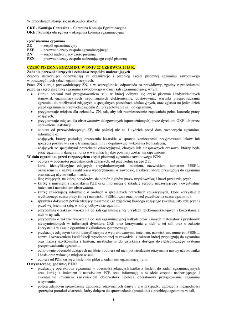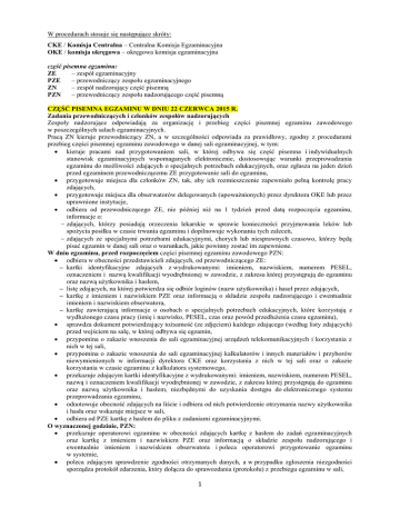W procedurach stosuje się następujące skróty: CKE / Komisja Centralna – Centralna Komisja Egzaminacyjna OKE / komisja okręgowa – okręgowa komisja egzaminacyjna część pisemna egzaminu: ZE – zespół egzaminacyjny PZE – przewodniczący zespołu egzaminacyjnego ZN – zespół nadzorujący część pisemną PZN – przewodniczący zespołu nadzorującego część pisemną CZĘŚĆ PISEMNA EGZAMINU W DNIU 22 CZERWCA 2015 R. Zadania przewodniczących i członków zespołów nadzorujących Zespoły nadzorujące odpowiadają za organizację i przebieg części pisemnej egzaminu zawodowego w poszczególnych salach egzaminacyjnych. Pracą ZN kieruje przewodniczący ZN, a w szczególności odpowiada za prawidłowy, zgodny z procedurami przebieg części pisemnej egzaminu zawodowego w danej sali egzaminacyjnej, w tym: kieruje pracami nad przygotowaniem sali, w której odbywa się część pisemna i indywidualnych stanowisk egzaminacyjnych wspomaganych elektronicznie, dostosowując warunki przeprowadzania egzaminu do możliwości zdających o specjalnych potrzebach edukacyjnych, oraz zgłasza na jeden dzień przed egzaminem przewodniczącemu ZE przygotowanie sali do egzaminu, przygotowuje miejsca dla członków ZN, tak, aby ich rozmieszczenie zapewniało pełną kontrolę pracy zdających, przygotowuje miejsca dla obserwatorów delegowanych (upoważnionych) przez dyrektora OKE lub przez uprawnione instytucje, odbiera od przewodniczącego ZE, nie później niż na 1 tydzień przed datą rozpoczęcia egzaminu, informacje o: zdających, którzy posiadają orzeczenia lekarskie w sprawie konieczności przyjmowania leków lub spożycia posiłku w czasie trwania egzaminu i dopilnowuje wykonania tych zaleceń, zdających ze specjalnymi potrzebami edukacyjnymi, chorych lub niesprawnych czasowo, którzy będą pisać egzamin w danej sali oraz o warunkach, jakie powinny zostać im zapewnione. W dniu egzaminu, przed rozpoczęciem części pisemnej egzaminu zawodowego PZN: odbiera w obecności przedstawicieli zdających, od przewodniczącego ZE: – kartki identyfikacyjne zdających z wydrukowanymi: imieniem, nazwiskiem, numerem PESEL, oznaczeniem i nazwą kwalifikacji wyodrębnionej w zawodzie, z zakresu której przystępują do egzaminu oraz nazwą użytkownika i hasłem, – listę zdających, na której potwierdza się odbiór loginów (nazw użytkownika) i haseł przez zdających, – kartkę z imieniem i nazwiskiem PZE oraz informacją o składzie zespołu nadzorującego i ewentualnie imieniem i nazwiskiem obserwatora, – kartkę zawierającą informacje o osobach o specjalnych potrzebach edukacyjnych, które korzystają z wydłużonego czasu pracy (imię i nazwisko, PESEL, czas oraz powód przedłużenia czasu egzaminu), sprawdza dokument potwierdzający tożsamość (ze zdjęciem) każdego zdającego (według listy zdających) przed wejściem na salę, w której odbywa się egzamin, przypomina o zakazie wnoszenia do sali egzaminacyjnej urządzeń telekomunikacyjnych i korzystania z nich w tej sali, przypomina o zakazie wnoszenia do sali egzaminacyjnej kalkulatorów i innych materiałów i przyborów niewymienionych w informacji dyrektora CKE oraz korzystania z nich w tej sali oraz o zakazie korzystania w czasie egzaminu z kalkulatora systemowego, przekazuje zdającym kartki identyfikacyjne z wydrukowanymi: imieniem, nazwiskiem, numerem PESEL, nazwą i oznaczeniem kwalifikacji wyodrębnionej w zawodzie, z zakresu której przystępują do egzaminu oraz nazwą użytkownika i hasłem, niezbędnymi do uzyskania dostępu do elektronicznego systemu przeprowadzania egzaminu, odnotowuje obecność zdających na liście i odbiera od nich potwierdzenie otrzymania nazwy użytkownika i hasła oraz wskazuje miejsce w sali, odbiera od PZE kartkę z hasłem do pliku z zadaniami egzaminacyjnymi. O wyznaczonej godzinie, PZN: przekazuje operatorowi egzaminu w obecności zdających kartkę z hasłem do zadań egzaminacyjnych oraz kartkę z imieniem i nazwiskiem PZE oraz informacją o składzie zespołu nadzorującego i ewentualnie imieniem i nazwiskiem obserwatora i poleca operatorowi przygotowanie egzaminu w systemie, poleca zdającym sprawdzenie zgodności otrzymanych danych, a w przypadku zgłoszenia niezgodności sporządza protokół zdarzenia, który dołącza do sprawozdania (protokołu) z przebiegu egzaminu w sali, 1 poleca zdającym zapoznanie się z udostępnioną w systemie lub wydrukowaną Instrukcją dla zdających poleca operatorowi odblokowanie możliwości logowania się zdających do systemu, poleca zdającym zalogowanie się do systemu i nadzoruje ten proces i sprawdza, po zalogowaniu się zdających do elektronicznego systemu, poprawność wyboru przez zdającego egzaminu, przekazuje operatorowi egzaminu kartkę zawierającą informacje o osobach o specjalnych potrzebach edukacyjnych, które korzystają z wydłużonego czasu pracy (imię i nazwisko, PESEL, czas oraz powód przedłużenia czasu egzaminu) i poleca przedłużyć im czas w systemie zgodnie z przekazanymi informacjami, w przypadku błędnego wyboru egzaminu przez zdającego, zgłoszenia przez zdającego nieprawidłowości w funkcjonowaniu indywidualnego stanowiska egzaminacyjnego lub niezgodności w oznaczeniach testu pisemnego udostępnionego w systemie, powiadamia o tym fakcie przewodniczącego ZE, poleca operatorowi egzaminu zamieszczenie w systemie w Edycji egzaminu – uwagi, informacji o stwierdzonych nieprawidłowościach oraz o podjętych działaniach lub w sytuacji awaryjnej zamieszcza w protokole przebiegu części pisemnej egzaminu zawodowego informację o stwierdzonych nieprawidłowościach oraz o podjętych działaniach; protokół podpisuje czytelnie zdający, który zgłosił nieprawidłowości, W czasie trwania egzaminu PZN: w uzasadnionych przypadkach zezwala zdającemu, po wylogowaniu się z systemu, na opuszczenie sali egzaminacyjnej, po zapewnieniu warunków wykluczających możliwość kontaktowania się 