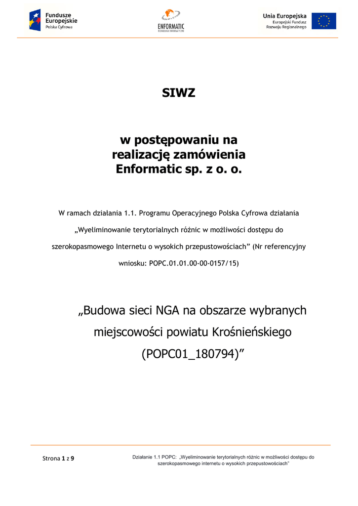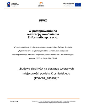 SIWZ w postępowaniu na realizację zamówienia Enformatic sp. z o. o. W ramach działania 1.1. Programu Operacyjnego Polska Cyfrowa działania „Wyeliminowanie terytorialnych różnic w możliwości dostępu do szerokopasmowego Internetu o wysokich przepustowościach” (Nr referencyjny wniosku: POPC.01.01.00-00-0157/15) „Budowa sieci NGA na obszarze wybranych miejscowości powiatu Krośnieńskiego (POPC01_180794)” Strona 1 z 9 Działanie 1.1 POPC: „Wyeliminowanie terytorialnych różnic w możliwości dostępu do szerokopasmowego internetu o wysokich przepustowościach” I. Zamawiający ENFORMATIC sp. z o.o. ul. Mieszka I 73A 35-303 Rzeszów NIP 8133297173 REGON: 691695432 www.enformatic.pl; [email protected] tel. +48 17 717 5000 fax +48 17 717 5008 II. Tryb udzielenia zamówienia 1 Postępowanie prowadzone jest z zachowaniem zasady równego traktowania, uczciwej konkurencji i przejrzystości. 2 Do zapytania mają zastosowanie przepisy Kodeksu Cywilnego (Dz.U. 1964r Nr 16 poz. 93 z późniejszymi zmianami). 3 Dokumentację SIWZ można uzyskać w formie elektronicznej, po uprzednim zgłoszeniu zapotrzebowania na adres [email protected] 4 Dokumentacja jest dostępna na stronie: www.enformatic.pl III. Informacje ogólne Zamówienie jest realizowane w ramach projektu: „: Budowa sieci NGA na obszarze wybranych miejscowości powiatu Krośnieńskiego (POPC01_180794).” w ramach działania 1.1. Programu Operacyjnego Polska Cyfrowa działania „Wyeliminowanie terytorialnych różnic w możliwości dostępu do szerokopasmowego Internetu o wysokich przepustowościach” (Nr referencyjny wniosku: POPC.01.01.00-00-0157/15). IV. Opis przedmiotu zamówienia 1. Przedmiotem zamówienia jest wykonanie kompleksowych prac budowlano-montażowych dla sieci szerokopasmowej składającej się z części światłowodowej: węzłów internetowych, Strona 2 z 9 Działanie 1.1 POPC: „Wyeliminowanie terytorialnych różnic w możliwości dostępu do szerokopasmowego internetu o wysokich przepustowościach” infrastruktury FTTH (napowietrznej, ziemnej, budynkowej), szkieletu. Sieć szerokopasmowa funkcjonować będzie w województwie podkarpackim na obszarze powiatu krośnieńskiego miejscowości sklasyfikowanych jako „białe plamy” na mapie informatycznej: Powiat Krośnieński Gmina Dukla Miejscowość Dukla, Cergowa, Jasionka, Iwla, Teodorówka, Chyrowa, Mszana, Tylawa, Lipowica Krośnieński Iwonicz-Zdrój Lubatowa, Lubatówka Krośnieński Jaśliska Jaśliska Węzły internetowe wyposażone m.in. w przełącznik FTTH oraz siłownię telekomunikacyjną zlokalizowane zostaną w miejscowości Dukla oraz Lubatowa. 2. Poglądowy schemat koncepcji sieci umieszczono w załączniku nr 2 do niniejszego zapytania. 3. Prace objęte niniejszym postępowaniem obejmują: 3.1. Przeprowadzenie niezbędnych wizji technicznych oraz inwentaryzacji technicznej na terenie realizowanej inwestycji. 3.2. Opracowanie koncepcji przebiegu sieci światłowodowej FTTH. 3.3. Wykonanie uzgodnień ZUDP oraz projektów budowlano-wykonawczych sieci szkieletowej i rozdzielczej (prace obejmują pozyskanie wszystkich niezbędnych zgód do wykonania inwestycji). 3.4. Wykonanie projektów branżowych (PGE, ORANGE, PKP, RZGW itd.) 3.5. Wykonanie projektów organizacji ruchu. 3.6. Wykonanie dokumentacji powykonawczej oraz inwentaryzacji geodezyjnej powykonawczej oraz uzgodnień we właściwym ośrodku geodezyjnym 3.7. Zakup materiałów i montaż infrastruktury magistralnej sieci światłowodowej FTTH zgodnie z ofertą sporządzoną wg formularza stanowiącego załącznik nr 1 do niniejszego zapytania. 3.8. Zakup urządzeń aktywnych sieci – urządzenia OLT, szafy, siłownie telekomunikacyjne oraz inny niezbędny osprzęt do funkcjonowania sieci. 3.9. Montaż punktów węzłowych sieci, konfiguracja urządzeń aktywnych. Wykonanie zasilania szaf. 3.10. Montaż sieci magistralnej (budowa sieci doziemnej, napowietrznej – słupowej, podwieszanie kabli na istniejącej infrastrukturze, zaciąg kabli do nowych oraz dzierżawionych kanalizacji teletechnicznych). 3.11. Wykonanie spawania światłowodów na wykonanej infrastrukturze 3.12. Wykonanie niezbędnych uzgodnień i uzyskanie pozwoleń na wykonywane prace. Strona 3 z 9 Działanie 1.1 POPC: „Wyeliminowanie terytorialnych różnic w możliwości dostępu do szerokopasmowego internetu o wysokich przepustowościach” V. Ramowy harmonogram realizacji: Zgodnie z harmonogramem stanowiącym załącznik nr 4 do umowy. Jeżeli oferent zdecyduje się na krótszy termin realizacji zadania jest zobowiązany do aktualizacji harmonogramu realizacji i przedłożenia go wraz z ofertą pod rygorem odrzucenia oferty. VI. Warunki udziału w postępowaniu O zamówienie mogą ubiegać się Wykonawcy, którzy potwierdzą spełnienie poniższych warunków: 1. Nie podlegają wykluczeniu z postępowania na podstawie art. 24 ustawy Prawo zamówień publicznych, 2. Posiadają uprawnienia do wykonywania określonej działalności lub czynności, jeżeli obowiązujące prawo nakłada obowiązek posiadania takich uprawnień, 3. Prowadzą nieprzerwanie działalność w zakresie instalacji teleinformatycznych minimum 4 lata oraz posiadają doświadczenie w zakresie współpracy z operatorem telekomunikacyjnym w zakresie instalacji lub obsługi infrastruktury telekomunikacyjnej. 4. Posiadają niezbędną wiedzę i doświadczenie oraz dysponują potencjałem technicznym, ekonomicznym i osobami zdolnymi do wykonania niniejszego zamówienia i w tym zakresie: a) wykażą i udokumentują, że w okresie ostatnich 4 lat wykonali: - Co najmniej 2 zamówienia o wartości nie mniejszej niż 2 000 000 PLN brutto każde, w ramach którego była budowa sieci informatycznej wraz z dostawą infrastruktury IT realizowanych przy wsparciu środków unijnych - Co najmniej 1 zamówienie o wartości nie mniejszej niż 3 600 000 PLN brutto, w ramach którego była budowa sieci informatycznej tj. wykonanie okablowania sieci struktur
