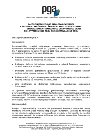 Polska Grupa Audytorska spółka z ograniczoną odpowiedzialnością sp. k. RAPORT NIEZALEŻNEGO BIEGŁEGO REWIDENTA Z PRZEGLĄDU SKRÓCONEGO ŚRÓDROCZNEGO JEDNOSTKOWEGO SPRAWOZDANIA FINANSOWEGO OBEJMUJĄCEGO OKRES OD 1 STYCZNIA 2016 ROKU DO 30 CZERWCA 2016 ROKU Dla Akcjonariuszy Hubstyle S.A. Wprowadzenie Przeprowadziliśmy przegląd załączonego skróconego śródrocznego jednostkowego sprawozdania finansowego Hubstyle S.A. („Spółka”), z siedzibą w Warszawie, ul. Stawki 8 lok. 4 sporządzonego na dzień 30 czerwca 2016 roku („skrócone śródroczne jednostkowe sprawozdanie finansowe”), na które składają się: • śródroczne skrócone jednostkowe sprawozdanie z całkowitych dochodów za okres sześciu miesięcy kończący się 30 czerwca 2016 roku, • śródroczne skrócone jednostkowe sprawozdanie z sytuacji finansowej sporządzone na dzień 30 czerwca 2016 roku, • śródroczne skrócone jednostkowe sprawozdanie ze zmian za okres sześciu miesięcy kończący się 30 czerwca 2016 roku, • śródroczne skrócone jednostkowe sprawozdanie z przepływów pieniężnych za okres sześciu miesięcy kończący się 30 czerwca 2016 roku, oraz • dane objaśniające finansowego. do skróconego śródrocznego w kapitale jednostkowego własnym sprawozdania Za zgodność skróconego śródrocznego jednostkowego sprawozdania finansowego z wymogami Międzynarodowego Standardu Rachunkowości 34 Śródroczna sprawozdawczość finansowa („MSR 34”) w kształcie zatwierdzonym przez Unię Europejską („MSR 34”) i innymi obowiązującymi przepisami odpowiedzialny jest Zarząd i Rada Nadzorcza Jednostki Dominującej. Naszym zadaniem było przeprowadzenie przeglądu tego sprawozdania. Zakres przeglądu Przegląd przeprowadziliśmy stosownie do postanowień krajowych standardów rewizji finansowej wydanych przez Krajową Radę Biegłych Rewidentów. Standardy te nakładają na nas obowiązek zaplanowania i przeprowadzenia przeglądu w taki sposób, aby uzyskać umiarkowaną pewność, że skrócone śródroczne jednostkowe sprawozdanie finansowe nie zawiera istotnych nieprawidłowości. 1 Polska Grupa Audytorska spółka z ograniczoną odpowiedzialnością sp.k. z siedzibą w Warszawie (00-764), ul. Jana III Sobieskiego 104, lok. 49, tel. + 48 22 115 66 96 Sąd Rejonowy dla m.st. Warszawy, XIII Wydział Gospodarczy Krajowego Rejestru Sądowego KRS 0000484251, REGON 146949930, NIP 9512373424 Polska Grupa Audytorska spółka z ograniczoną odpowiedzialnością sp. k. Przegląd przeprowadziliśmy głównie drogą analizy danych skróconego śródrocznego jednostkowego sprawozdania finansowego, wglądu w księgi rachunkowe, a także wykorzystania informacji uzyskanych od kierownictwa oraz osób odpowiedzialnych za finanse i rachunkowość Spółki. Zakres i metoda przeglądu skróconego śródrocznego jednostkowego sprawozdania finansowego istotnie różni się od badań leżących u podstaw opinii wyrażanej o zgodności z wymagającymi zastosowania zasadami (polityką) rachunkowości rocznego jednostkowego sprawozdania finansowego oraz o jego rzetelności i jasności, dlatego nie możemy wydać takiej opinii o załączonym sprawozdaniu. Wniosek Przeprowadzony przez nas przegląd nie wykazał niczego, co pozwalałoby sądzić, iż załączone skrócone śródroczne jednostkowe sprawozdanie finansowe Hubstyle S.A. na dzień 30 czerwca 2016 roku nie zostało sporządzone, we wszystkich istotnych aspektach, zgodnie z wymogami MSR 34 Śródroczna sprawozdawczość finansowa, w kształcie zatwierdzonym przez Unię Europejską. W imieniu Polskiej Grupy Audytorskiej Spółki z ograniczoną odpowiedzialnością sp. k. Nr ewidencyjny 3887 Ul. Jana III Sobieskiego 104, lok. 49 00-764 Warszawa ..................................................... Bartłomiej Kurylak Kluczowy biegły rewident Nr ewidencyjny 12534 Członek Zarządu Komplementariusza .................................................... Maciej Kozysa Członek Zarządu Komplementariusza 30 sierpnia 2016 r. 2 Polska Grupa Audytorska spółka z ograniczoną odpowiedzialnością sp.k. z siedzibą w Warszawie (00-764), ul. Jana III Sobieskiego 104, lok. 49, tel. + 48 22 115 66 96 Sąd Rejonowy dla m.st. Warszawy, XIII Wydział Gospodarczy Krajowego Rejestru Sądowego KRS 0000484251, REGON 146949930, NIP 9512373424