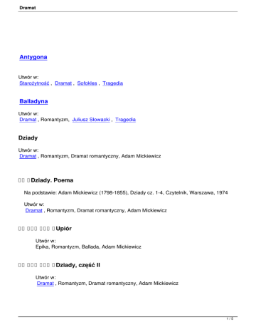Dramat Antygona Utwór w: Starożytność , Dramat , Sofokles , Tragedia Balladyna Utwór w: Dramat , Romantyzm, Juliusz Słowacki , Tragedia Dziady Utwór w: Dramat , Romantyzm, Dramat romantyczny, Adam Mickiewicz Dziady. Poema Na podstawie: Adam Mickiewicz (1798-1855), Dziady cz. 1-4, Czytelnik, Warszawa, 1974 Utwór w: Dramat , Romantyzm, Dramat romantyczny, Adam Mickiewicz Upiór Utwór w: Epika, Romantyzm, Ballada, Adam Mickiewicz Dziady, część II Utwór w: Dramat , Romantyzm, Dramat romantyczny, Adam Mickiewicz 1/5 Dramat Dziady, część IV Utwór w: Dramat , Romantyzm, Dramat romantyczny, Adam Mickiewicz Dziady, część III Utwór w: Dramat , Romantyzm, Dramat romantyczny, Adam Mickiewicz Dziady. Widowisko, część I Utwór w: Dramat , Romantyzm, Dramat romantyczny, Adam Mickiewicz Dziadów części III Ustęp Na podstawie: Adam Mickiewicz (1798-1855), Dziady cz. 1-4, Czytelnik, Warszawa, 1974 Utwór w: Epika, Romantyzm, Adam Mickiewicz, Poemat Droga do Rosji Utwór w: Epika, Romantyzm, Adam Mickiewicz, Poemat Przedmieścia stolicy Utwór w: Epika, Romantyzm, Adam Mickiewicz, Poemat Petersburg Utwór w: Epika, Romantyzm, Adam Mickiewicz, Poemat 2/5 Dramat Pomnik Piotra Wielkiego Utwór w: Epika, Romantyzm, Adam Mickiewicz, Poemat Przegląd wojska Utwór w: Epika, Romantyzm, Adam Mickiewicz, Poemat Oleszkiewicz Utwór w: Epika, Romantyzm, Adam Mickiewicz, Poemat Do przyjaciół Moskali Utwór w: Liryka, Romantyzm, Adam Mickiewicz, Wiersz Hamlet Utwór w: Renesans , Dramat , William Shakespeare , Tragedia Kordian Utwór w: Dramat , Romantyzm, Dramat romantyczny, Juliusz Słowacki Król Edyp Utwór w: Starożytność , Dramat , Sofokles , Tragedia Moralność pani Dulskiej 3/5 Dramat Utwór w: Dramat , Modernizm, Komedia , Gabriela Zapolska Na Wzgórzu Śmierci Utwór w: Dramat , Modernizm, Dramat niesceniczny, Jan Kasprowicz Nie-Boska komedia Utwór w: Dramat , Romantyzm, Dramat romantyczny, Zygmunt Krasiński Odprawa posłów greckich Utwór w: Dramat , Renesans , Jan Kochanowski , Tragedia Romeo i Julia Utwór w: Renesans , Dramat , William Shakespeare , Tragedia Świętoszek Utwór w: Dramat , Barok, Komedia , Molière Wesele Utwór w: Dramat , Modernizm, Dramat poetycki, Stanisław Wyspiański Zemsta Utwór w: Dramat , Romantyzm, Aleksander Fredro , Komedia 4/5 Dramat 5/5