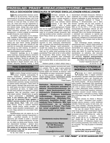 PRZEGLĄD PRASY KREACJONISTYCZNEJ Marta Cuberbiller ROLA ODCHODÓW DINOZAURA W SPORZE EWOLUCJONIZM-KREACJONIZM W skamieniałych odchodach dinozaurów. Odchody te znajdowały się w pobliŜu szczątków tytanozaura, dinozaura naleŜącego do grupy zauropodów, czyli duŜych dinozaurów roślinnych (V. Prasad, C. Strömberg, H. Alimohammadian, and A. Sahni, Dinosaur coprolites and the early evolution of grasses and graziers, "Science" 18 November 2005, vol. 310, No. 5751, s. 1177-1180). Jest to dla ewolucjonistów zdumiewające odkrycie: jak dinozaury mogły Ŝywić się czymś, co jeszcze nie wyewoluowało? Było to tym bardziej zdumiewające, Ŝe w odchodach tych znaleziono co najmniej pięć rodzajów traw, czyli mówiąc z perspektywy ewolucjonistycznej, nastąpiła juŜ ich ewolucyjna dywersyfikacja. Niektóre z tych rodzajów trawy są takie jak istniejące dzisiaj. Autor omawianego artykułu konkluduje, Ŝe wielomilionowe epoki, o których mówią ewolucjoniści, istnieją tylko w ich wyobraźni. Fakt, iŜ pewnych skamieniałości nie znajduje się w niektórych warstwach, nie znaczy, Ŝe zwierzęta czy rośliny nie istniały obok siebie. Po prostu albo jeszcze tych skamieniałości nie odkryliśmy, albo wzburzone wody Potopu spowodowały, Ŝe nie ma ich w niektórych warstwach. Argument ewolucjonistyczny okazał się mniej warty niŜ odchody dinozaura. (Tas Walker, Dino dung overturn objection, "Creation" September-November 2007, vol. 29, No. 4, s. 35) edług ewolucjonistów dinozaury wymarły ok. 65 mln lat temu. Trawa zaś miała wyewoluować ok. 55 milionów lat temu, czyli 10 mln lat po wymarciu dinozaurów. Kreacjoniści twierdzą natomiast, Ŝe świat jest młody, Ŝe zarówno dinozaury, jak i trawa (oraz inne typy organizmów Ŝywych) zostały stworzone w ciągu pierwszego tygodnia istnienia świata. Istnieje więc prosty sposób sprawdzenia, która z tych koncepcji jest słuszna. Trzeba mianowicie sprawdzić, czy w warstwach geologicznych, w których znajdują się skamieniałe szczątki dinozaurów, są teŜ ślady traw. Jak wiadomo, zapis kopalny nie ma chaotycznego charakteru. Skamieniałości pewnych organizmów znajdują się tylko w niektórych warstwach, a w innych ich nie ma. Ewolucjoniści zapis kopalny traktują jako zapis historii: warstwy geologiczne miały powstawać w ciągu wielu milionów lat, więc obecność lub nieobecność sfosylizowanych szczątków zwierząt czy roślin świadczy, ich zdaniem, o istnieniu bądź nieistnieniu tych organizmów w epokach odpowiadających owym warstwom. Kreacjoniści, zgadzając się co do wyglądu zapisu kopalnego, przyjmują odmienny mechanizm powstawania zapisu kopalnego (ściślej: duŜej części zapisu kopalnego). Głoszą tzw. geologię Potopu. Według niej warstwy geologiczne nie powstawały stopniowo w długich okresach czasu, ale są skutkiem olbrzymiej katastrofy wodnej, o której informacje zachowały się w mitach wielu ludów na całym świecie, a przede wszystkim w Księdze Rodzaju. Olbrzymie ilości wody sortowały materiał osadowy, w tym takŜe ciała zwierząt i roślin, w postaci warstw geologicznych. Powstały więc one we względnie krótkim czasie. To dlatego, mówią kreacjoniści, szczątki ssaków znajdują się wyŜej niŜ na przykład szczątki dinozaurów, gdyŜ ssaki były bardziej ruchliwe i potrafiły w pierwszych fazach Potopu chronić się na wyŜej połoŜone tereny. Brak traw w warstwach, w których znajdowano skamieniałości dinozaurów, stanowił jednak mocny argument na rzecz ewolucyjnej wielomilionowej skali, a przeciwko wizji kreacjonistycznej opartej na geologii Potopu. Dlaczego - pytali ewolucjoniści szczątki traw znajduje się w warstwach wyŜszych niŜ te, w których są dinozaury? PrzecieŜ trawy nie miały nóg, by uciekać przed podnoszącą się falą powodziową? Przez wiele lat był to trudny problem dla kreacjonistów. Biblia bowiem opisuje Potop Noego, ale bez szczegółów, które umoŜliwiłyby udzielenie odpowiedzi na wszystkie pytania. Ostatecznie przecieŜ Biblia nie jest podręcznikiem geologii. Niedawno jednak w Indiach odkryto trawę w PANU DAWKINSOWI DZIĘKUJEMY ZA SZCZEROŚĆ odgórne rządowe programy nauczania teorii ewoluPRZYRODA POTRZEBUJE cji w szkołach. Póki co, sądy (i opinia publiczna) tkwią w błogiej nieświadomości. Gdy jednak abp INGERENCJI CZŁOWIEKA śyciński będzie nam wmawiał, Ŝe ewolucja i wiara bracając się w latach osiemdziesiątych chrześcijańska nie stoją w sprzeczności, powołamy ubiegłego wieku w kręgach przewodnisię na Pana przykład i świadectwo: „W moich oczach ewolucja usuwa najwaŜniejsze powody ków tatrzańskich, słyszałem wielokrotnie narzekania na „wyprowadzenie” owiec z gór. Oczywiście pańwiary w Boga.” Dziękujemy, Panie Dawkins! Paweł Chojecki stwowa decyzja o zakazie wypasu została podjęta w imię ochrony przyrody… Oto jak ją komentuje dzisiejszy Dyrektor Tatrzańskiego Parku Narodowego: Nakładem Wydawnictwa Megas „Wycofanie pasterstwa w latach 1960-1980 powodoukazała się niezwykle potrzebna w wało coraz to szybsze zarastanie śródleśnych podebacie kreacjonizm/ewolucja po- lan, a zatem niekorzystne zmiany krajobrazowe i zycja - „Spór ewolucjonizmu z kre- florystyczne. PrzecieŜ dzięki wypasaniu, wykaszaniu acjonizmem. Podstawowe pojęcia i i nawoŜeniu nawozem owczym mieliśmy masowo zakwitające polany z krokusami na wiosnę i bogatą poglądy” - Profesora Kazimierza florę w przeciągu całego lata.” Dr Paweł Skawiński, Jodkowskiego. Rozpoczyna ona W Górach. serię wydawniczą: „Biblioteka FiloPodobna sytuacja ma miejsce w Bieszczazoficznych Aspektów Gnozy” pod dach. Tak znane i zachwalane przez turystów i redakcją Pana Profesora. Miło nam ekologów połoniny powstały w wyniku działalności poinformować, Ŝe w dodatku człowieka. Dzisiaj bez wypasu nie tylko owiec, ale i „Kreacjonizm w Polsce” Pan Profe- krów, znowu zarastają i zaburzają ekosyste