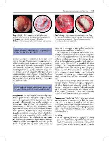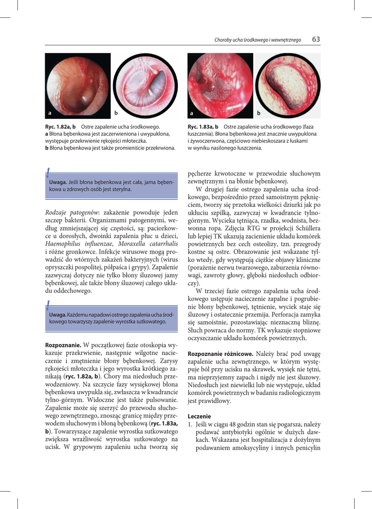 Choroby ucha środkowego i wewnętrznego Ryc. 1.82a, b Ostre zapalenie ucha środkowego. a Błona bębenkowa jest zaczerwieniona i uwypuklona, występuje przekrwienie rękojeści młoteczka. b Błona bębenkowa jest także promieniście przekrwiona. ! Uwaga. Jeśli błona bębenkowa jest cała, jama bębenkowa u zdrowych osób jest sterylna. Rodzaje patogenów: zakażenie powoduje jeden szczep bakterii. Organizmami patogennymi, według zmniejszającej się częstości, są: paciorkowce u dorosłych, dwoinki zapalenia płuc u dzieci, Haemophilus influenzae, Moraxella catarrhalis i różne gronkowce. Infekcje wirusowe mogą prowadzić do wtórnych zakażeń bakteryjnych (wirus opryszczki pospolitej, półpaśca i grypy). Zapalenie zazwyczaj dotyczy nie tylko błony śluzowej jamy bębenkowej, ale także błony śluzowej całego układu oddechowego. ! Uwaga. Każdemu napadowi ostrego zapalenia ucha środkowego towarzyszy zapalenie wyrostka sutkowatego. Rozpoznanie. W początkowej fazie otoskopia wykazuje przekrwienie, następnie wilgotne nacieczenie i zmętnienie błony bębenkowej. Zarysy rękojeści młoteczka i jego wyrostka krótkiego zanikają (ryc. 1.82a, b). Chory ma niedosłuch przewodzeniowy. Na szczycie fazy wysiękowej błona bębenkowa uwypukla się, zwłaszcza w kwadrancie tylno-górnym. Widoczne jest także pulsowanie. Zapalenie może się szerzyć do przewodu słuchowego zewnętrznego, znosząc granicę między przewodem słuchowym i błoną bębenkową (ryc. 1.83a, b). Towarzyszące zapalenie wyrostka sutkowatego zwiększa wrażliwość wyrostka sutkowatego na ucisk. W grypowym zapaleniu ucha tworzą się 63 Ryc. 1.83a, b Ostre zapalenie ucha środkowego (faza łuszczenia). Błona bębenkowa jest znacznie uwypuklona i żywoczerwona, częściowo niebieskoszara z łuskami w wyniku nasilonego łuszczenia. pęcherze krwotoczne w przewodzie słuchowym zewnętrznym i na błonie bębenkowej. W drugiej fazie ostrego zapalenia ucha środkowego, bezpośrednio przed samoistnym pęknięciem, tworzy się przetoka wielkości dziurki jak po ukłuciu szpilką, zazwyczaj w kwadrancie tylnogórnym. Wycieka tętniąca, rzadka, wodnista, bezwonna ropa. Zdjęcia RTG w projekcji Schüllera lub lepiej TK ukazują zacienienie układu komórek powietrznych bez cech osteolizy, tzn. przegrody kostne są ostre. Obrazowanie jest wskazane tylko wtedy, gdy występują ciężkie objawy kliniczne (porażenie nerwu twarzowego, zaburzenia równowagi, zawroty głowy, głęboki niedosłuch odbiorczy). W trzeciej fazie ostrego zapalenia ucha środkowego ustępuje nacieczenie zapalne i pogrubienie błony bębenkowej, tętnienie, wyciek staje się śluzowy i ostatecznie przemija. Perforacja zamyka się samoistnie, pozostawiając nieznaczną bliznę. Słuch powraca do normy. TK wykazuje stopniowe oczyszczanie układu komórek powietrznych. Rozpoznanie różnicowe. Należy brać pod uwagę zapalenie ucha zewnętrznego, w którym występuje ból przy ucisku na skrawek, wysięk nie tętni, ma nieprzyjemny zapach i nigdy nie jest śluzowy. Niedosłuch jest niewielki lub nie występuje, układ komórek powietrznych w badaniu radiologicznym jest prawidłowy. Leczenie 1. Jeśli w ciągu 48 godzin stan się pogarsza, należy podawać antybiotyki ogólnie w dużych dawkach. Wskazana jest hospitalizacja z dożylnym podawaniem amoksycyliny i innych penicylin