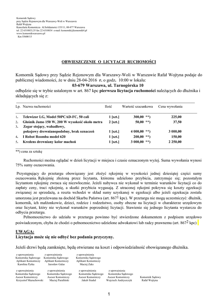 Komornik Sądowy przy Sądzie Rejonowym dla Warszawy-Woli w Warszawie Rafał Wojtyna Kancelaria Komornicza Al.Solidarności 155/11, 00-877 Warszawa tel. 22 6310833,35 fax 22 6310834 e-mail: [email protected] www.komornikwarszawa.pl Km 55600/15 OBWIESZCZENIE O LICYTACJI RUCHOMOŚCI Komornik Sądowy przy Sądzie Rejonowym dla Warszawy-Woli w Warszawie Rafał Wojtyna podaje do publicznej wiadomości, że w dniu 28-04-2016 r. o godz. 10:00 w lokalu: 03-679 Warszawa, ul. Tarnogórska 10 odbędzie się w trybie ustalonym w art. 867 kpc pierwsza licytacja ruchomości należących do dłużnika i składających się z: _______________________________________________________________________________________________________________________ Lp. Nazwa ruchomości Ilość Wartość szacunkowa Cena wywołania _________________________________________________________________________________________________________________________ 1. 2. 3. 4. 5. Telewizor LG, Model 50PCAD-FC, 50 cali Głośnik Jamo 150 W, 200 W wysokość około metra Zegar stojący, wahadłowy, pokojowy drewnianopodobny, brak oznaczeń I Robot Roomba model 620 Kredens drewniany kolor machoń 1 [szt.] 2 [szt.] 300,00 **) 50,00 **) 225,00 37,50 1 [szt.] 1 [szt.] 1 [szt.] 4 000,00 **) 200,00 **) 3 000,00 **) 3 000,00 150,00 2 250,00 _______________________________________________________________________________________________________________________ **) cena za sztukę Ruchomości można oglądać w dzień licytacji w miejscu i czasie oznaczonym wyżej. Suma wywołania wynosi 75% sumy oszacowania. Przystępujący do przetargu obowiązany jest złożyć rękojmię w wysokości jednej dziesiątej części sumy oszacowania. Rękojmię złożoną przez licytanta, któremu udzielono przybicia, zatrzymuje się; pozostałym licytantom rękojmię zwraca się niezwłocznie. Jeżeli nabywca nie wykonał w terminie warunków licytacji co do zapłaty ceny, traci rękojmię, a skutki przybicia wygasają. Z utraconej rękojmi pokrywa się koszty egzekucji związanej ze sprzedażą, a reszta wchodzi w skład sumy uzyskanej w egzekucji albo jeżeli egzekucja została umorzona jest przelewana na dochód Skarbu Państwa (art. 8671 kpc). W przetargu nie mogą uczestniczyć: dłużnik, komornik, ich małżonkowie, dzieci, rodzice i rodzeństwo, osoby obecne na licytacji w charakterze urzędowym oraz licytant, który nie wykonał warunków poprzedniej licytacji. Stawienie się jednego licytanta wystarcza do odbycia przetargu. Pełnomocnictwo do udziału w przetargu powinno być stwierdzone dokumentem z podpisem urzędowo poświadczonym, chyba że chodzi o pełnomocnictwo udzielone adwokatowi lub radcy prawnemu (art. 8672 kpc) UWAGA: Licytacja może się nie odbyć bez podania przyczyny. Jeżeli drzwi będą zamknięte, będą otwierane na koszt i odpowiedzialność obowiązanego dłużnika. z upowaznienia Komornika Sądowego Aplikant Komorniczy Karolina Pyrka z upoważnienia Komornika Sądowego Asesor Komorniczy Krzysztof Mazuchowski z upoważnienia Komornika Sądowego Aplikant Komorniczy Jarosław Galas z upoważnienia Komornika Sądowego Asesor Komorniczy Maciej Parafiński z upoważnienia Komornika Sądowego Aplikant Komorniczy Maciej Zaks z upoważnienia z upoważnienia Komornika Sądowego Komornika Sądowego Asesor Komorniczy Asesor Komorniczy Jakub Siadul Wojciech Andryszczyk 1 Komornik Sądowy Rafał Wojtyna