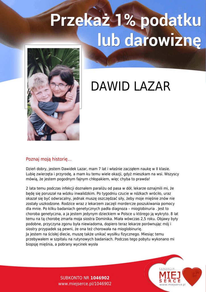 DAWID LAZAR Poznaj moją historię… Dzień dobry, jestem Dawidek Lazar, mam 7 lat i właśnie zacząłem naukę w II klasie. Lubię zwierzęta i przyrodę, a mam ku temu wiele okazji, gdyż mieszkam na wsi. Wszyscy mówią, że jestem pogodnym fajnym chłopakiem, więc chyba to prawda! 2 lata temu podczas infekcji doznałem paraliżu od pasa w dół, lekarze oznajmili mi, że będę się poruszał na wózku inwalidzkim. Po tygodniu czucie w nóżkach wróciło, uraz okazał się być odwracalny, jednak muszę oszczędzać siły, żeby moje mięśnie znów nie zostały uszkodzone. Rodzice wraz z lekarzem zaczęli mordercze poszukiwania pomocy dla mnie. Po kilku badaniach genetycznych padła diagnoza – mioglobinuria . Jest to choroba genetyczna, a ja jestem jedynym dzieckiem w Polsce u którego ją wykryto. 8 lat temu na tą chorobę zmarła moja siostra Dominika. Miała wówczas 2,5 roku. Objawy były podobne, przyczyna zgonu była niewiadoma, dopiero teraz lekarze porównując mój i siostry przypadek są pewni, że ona też chorowała na mioglobinurię. Ja jestem na ścisłej diecie, muszę także unikać wysiłku fizycznego. Miesiąc temu przebywałem w szpitalu na rutynowych badaniach. Podczas tego pobytu wykonano mi biopsję mięśnia, a pobrany wycinek wysła SUBKONTO NR 1046902 www.miejserce.pl/1046902