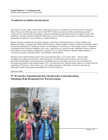 Zespół Szkół nr 1 w Łodygowicach Szkolne Koło Krajoznawczo - Turystyczne Uczniowie na szlaku turystycznym Nasi uczniowie, jak co roku, wzięli udział w odbywającym się po raz siedemnasty na Żywiecczyźnie Jesiennym Zlocie Turystyczno–Ekologicznym „Czyste Góry 2015”. Podczas tej edycji na szlaki, pod opieką nauczycieli i wychowawców szkół powiatu żywieckiego, wyruszyło kilkadziesiąt grup turystycznych zrzeszających około 900 miłośników ekologii i górskich wędrówek. Wśród nich nasza 18 osobowa grupa uczniów ze szkoły podstawowej i gimnazjum pod opieką p. Lucyny Zuziak i p. Eweliny Okrzesik Młodzi ekolodzy porządkowali szlak górski biegnący od Przełęczy Salmopolskiej przez Jaskinię Malinowską i Malinowską Skałę, a następnie przez Halę Skałki do Ostrego. Zebrane odpady w postaci plastikowych butelek i śmieci dostarczyli punktualnie po 5 godzinach marszu do Gimnazjum w Twardorzeczce. Nasza grupa uczniów w konkursie na największą ilość zebranych odpadów, jak co roku, uplasowała się w pierwszej trójce zajmując II miejsce. Podczas zlotu odbyły się także konkursy ekologiczne i krajoznawcze. Uczennica Gabriela Czarnecka zajęła II miejsce, a wyróżnienia uzyskały Aleksandra Słaby, Anna Jakubiec i Dorota Bożek. Głównym celem XVII Jesiennego Zlotu Turystyczno Ekologicznego „Czyste Góry 2015” – było nie tylko porządkowanie szlaków turystycznych, ochrona przyrody, ale także promowanie walorów turystycznych i przyrodniczych Beskidów, turystyki górskiej i kwalifikowanej oraz rozwijanie sprawności fizycznej młodzieży. Poczynania uczestników zlotu śledziły kamery TVP i Telewizji Katowice. Relacje można zobaczyć na stronie telewizji regionalnej TV Katowice- Góry śmieci z gór, czyli wielkie sprzątanie w Beskidach Uczniowie zmęczeni ale zadowoleni i pełni wrażeń późnym popołudniem wrócili do Łodygowic. Opiekunki SKKT IV Wycieczka Tajemnicami Jury Krakowsko-Częstochowskiej Szkolnego Koła Krajoznawczo-Turystycznego strona 1 / 6 Zespół Szkół nr 1 w Łodygowicach Szkolne Koło Krajoznawczo - Turystyczne 18 października 2014r. w sobotę, niewielka, ale wytrwała i dzielna grupa uczniów ze Szkoły Podstawowej nr 1 w Łodygowicach, wyruszyła na drugą zaplanowaną wyprawę SKKT. We wczesnych godzinach rannych wyruszyliśmy z parkingu marketu NETTO w kierunku Bielska-Białej i dalej na Jurę Krakowsko-Częstochowską. Pogoda dopisywała, humory również, z niecierpliwością oczekiwaliśmy momentu wyruszenia na piękny szlak wiodący przez południową część rezerwatu Sokole Góry. Nie zawiedliśmy się. Widoki okazały się wspaniałe, szczęśliwi posiadacze młotków i innych drobnych narzędzi mogli spróbować swoich sił w kruszeniu skał i poszukiwaniu cennych kruszców, reszta towarzystwa dzielnie kibicowała poszukiwaczom i czekała na łupy. Zdobyczy jednak nie było, ale zabawy, emocji i radości mnóstwo. Podczas wędrówki zobaczyliśmy kapliczkę i źródełko św. Idziego, który według legendy w trakcie zarazy, przebrany za pustelnika, wskazał ludziom źródło, którego woda zapobiegała chorobie. Podobno miała też i ma nadal właściwości pomagające w różnych innych dolegliwościach. Podziwiając Kamieniołom Kielniki, przeszliśmy ścieżką geologów do skał wspinaczkowych noszących ciekawe nazwy: Dziewica, Szafa, Biblioteka. W trakcie wycieczki zwiedziliśmy również piękny zamek w Bobolicach, Lelów oraz Wzgórza Trzebniowskie. Znajdowała się tam Góra Leszczyny, a w niej Jaskinia Ludminowska. Aby dostrzec szczegóły geologiczne i podziwiać piękno jej wnętrza, musieliśmy mieć latarki. Było to wielką atrakcją dla naszych młodych uczestników. W drodze powrotnej przejeżdżaliśmy przez Złoty Potok, Ostrężnik, Żarki i Myszków. Podziwialiśmy widoki i słuchaliśmy opowieści naszego pilota - pana Andrzeja Szewczyka. Podsumowując, grupa uczestniczek w składzie: Aleksandra Słaby, Karolina Suchanek, Katarzyna Morys, Anna Jeziorowska, Dalila Czarnecka, Nikola Górna, Joanna Hańderek, oceniły wyprawę jako bardzo udaną, interesującą i pouczającą. Najlepszym dowodem na to są wypowiedzi niektórych z nich: Bardzo mi się podobała wycieczka, ponieważ zwiedziliśmy zamki, kościoły, podziwialiśmy ogromne skały, piękne widoki, a pan przewodnik opowiedział nam historie mrożące krew w żyłach, które zapadły nam w pamięci. Chciałabym jeszcze raz tam pojechać. Wycieczka na Jurę Krakowsko-Częstochowską była super! Widoki pięknych zamków zapierały dech w piersiach, a wizyta w jaskini zapewniła nam moc niesamowitych wrażeń. Wszyscy świetnie się bawiliśmy i nie możemy doczekać się następnego wyjazdu… Wycieczka na Jurę Krakowsko- Częstochowską bardzo mi się podobała, a najbardziej widoki malowniczych zamków. Galeria zdjęć Opiekunka SKKT: Lucyna Zuziak PS Szczegółowe informacje na temat planowanych imprez krajoznawczo-turystycznych znajdziecie na gazetce ściennej SKKT (korytarz przy sklepiku szkolnym) lub u opiekunki szkolnego koła p. Lucyny Zuziak. Artykuły i zdjęcia z wycieczek publikowane są na ww. gazetce i stronie internetowej. Wycieczka szkolnego koła turystycznego – Szlakiem zabytków techniki województwa śląskiego 4 października 2014 roku w sobotę, grupa uczniów z klas czwartych i piątych: Katarzyna Morys, Marta Mrowiec, Agata Michalik, Nikola Górna, Anna Jeziorowska, Joanna Hańderek, Szymon Pitera, Emilia Tarnawa i Aurelia Więcek wzięła udział w wycieczce krajoznawczo-turystycznej „Szlakiem zabytków techniki województwa śląskiego”. Wycieczka ta była jedną z imprez zaplanowanych na tegoroczną jesień przez Szkolne Koło Krajoznawczo-Turystyczne. Trasę Łodygowice–Katowice pokonaliśmy autobusem w niespełna 2 godziny. Pierwszym punktem naszej wyprawy było Muzeum Organów Śląskich, mające swą siedzibę w Akademii Muzycznej im. Kornela Szymanowskiego w Katowicach. Celem 