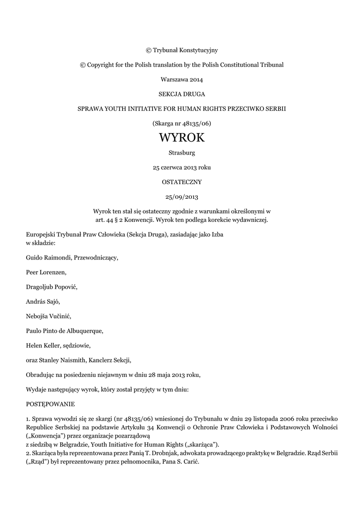 © Trybunał Konstytucyjny © Copyright for the Polish translation by the Polish Constitutional Tribunal Warszawa 2014 SEKCJA DRUGA SPRAWA YOUTH INITIATIVE FOR HUMAN RIGHTS PRZECIWKO SERBII (Skarga nr 48135/06) WYROK Strasburg 25 czerwca 2013 roku OSTATECZNY 25/09/2013 Wyrok ten stał się ostateczny zgodnie z warunkami określonymi w art. 44 § 2 Konwencji. Wyrok ten podlega korekcie wydawniczej. Europejski Trybunał Praw Człowieka (Sekcja Druga), zasiadając jako Izba w składzie: Guido Raimondi, Przewodniczący, Peer Lorenzen, Dragoljub Popović, András Sajó, Nebojša Vučinić, Paulo Pinto de Albuquerque, Helen Keller, sędziowie, oraz Stanley Naismith, Kanclerz Sekcji, Obradując na posiedzeniu niejawnym w dniu 28 maja 2013 roku, Wydaje następujący wyrok, który został przyjęty w tym dniu: POSTĘPOWANIE 1. Sprawa wywodzi się ze skargi (nr 48135/06) wniesionej do Trybunału w dniu 29 listopada 2006 roku przeciwko Republice Serbskiej na podstawie Artykułu 34 Konwencji o Ochronie Praw Człowieka i Podstawowych Wolności („Konwencja”) przez organizacje pozarządową z siedzibą w Belgradzie, Youth Initiative for Human Rights („skarżąca”). 2. Skarżąca była reprezentowana przez Panią T. Drobnjak, adwokata prowadzącego praktykę w Belgradzie. Rząd Serbii („Rząd") był reprezentowany przez pełnomocnika, Pana S. Carić. 3. Skarżąca, powołując się na Artykuły 6 i 10 Konwencji zarzuciła, że agencja wywiadu Serbii odmówiła jej dostępu do pewnych informacji dotyczących inwigilacji elektronicznej pomimo prawomocnej decyzji Komisarza ds. Informacji wydanej na korzyść skarżącej. 4. W dniu 15 września 2010 roku skarga została zakomunikowana Rządowi. Wydano także decyzję o łącznym rozpoznaniu skargi co do meritum i dopuszczalności (Artykuł 29 § 1). STAN FAKTYCZNY I. OKOLICZNOŚCI SPRAWY 5. Skarżąca jest organizacją pozarządową założoną w 2003 roku i ma siedzibę w Belgradzie. Zadaniem jej jest monitorowanie wdrażania prawa przejściowego w celu poszanowania praw człowieka, demokracji i praworządności. 6. W dniu 31 października 2005 roku skarżąca zwróciła się do agencji wywiadu w Serbii (Bezbednosno-informativna agencija), żeby poinformowała skarżącą, ile osób zostało poddanych inwigilacji elektronicznej przez agencję w 2005 roku. 7. W dniu 4 listopada 2005 roku agencja odmówiła, powołując się na art. 9 ust. 5 Ustawy o dostępie do informacji publicznej z 2004 roku. 8. W dniu 17 listopada 2005 roku skarżąca wniosła zażalenie do Komisarza ds. Informacji (Poverenik za informacije od javnog značaja i zaštitu podataka о ličnosti – „Komisarz”), organu krajowego utworzonego na podstawie Ustawy o dostępie do informacji publicznej z 2004 roku, którego zadaniem jest zapewnienie przestrzegania tej ustawy. 9. W dniu 22 grudnia 2005 roku Komisarz stwierdził, że agencja wywiadu naruszyła prawo i nakazał, aby żądana informacja została udostępniona skarżącej w ciągu trzech dni. Agencja odwołała się, ale w dniu 19 kwietnia 2006 roku Sąd Najwyższy Serbii uznał, że nie ma ona legitymacji procesowej i oddalił odwołanie. 10. W dniu 23 września 2008 roku agencja wywiadu powiadomiła skarżącą, że nie posiada żądanej informacji. II. WŁAŚCIWE PRAWO KRAJOWE 11. Ustawa o dostępie do informacji publicznej z 2004 roku (Zakon o slobodnom pristupu informacijama od javnog značaja, opublikowana w Official Gazette Serbii nr 120/04 z poprawkami opublikowanymi w Official Gazette nr 54/07, 104/09 i 36/10) obowiązuje od 13 listopada 2004 roku. Istotne przepisy tej ustawy stanowią: Artykuł 5 ust. 2 „Każdy ma prawo dostępu do informacji wagi publicznej poprzez możliwość zapoznania się z dokumentem zawierającym taką informację, sporządzenia kopii dokumentu oraz na wniosek otrzymania kopii tego dokumentu drogą pocztową, faksem, drogą elektroniczną lub w inny sposób”. Artykuł 8 „Prawa określone niniejszą ustawą można ograniczyć w wyjątkowych okolicznościach wymienionych w tej ustawie, w zakresie niezbędnym w demokratycznym społeczeństwie celem zapobieżenia poważnym naruszeniom ważniejszego interesu wynikającego z Konstytucji lub innych praw. Wykładnia ustawy nie może prowadzić do naruszenia albo ograniczenia jakiegokolwiek prawa w niej wymienionego w większym zakresie niż przewidziany w akapicie 1 powyżej.” Artykuł 9 „Dostępu do informacji wagi publicznej można odmówić w następujących przypadkach: […] (5) Jeżeli ujawnienie informacji lub dokumentu formalnie zakwalifikowanego jako tajemnica państwowa, oficjalna lub handlowa, albo do której dostęp ma ograniczona grupa mogłoby naruszyć uzasadniony interes mający pierwszeństwo nad swobodnym dostępem do informacji.” 12. Zgodnie z Artykułem 22 ust. 1 ustawy powód może wnieść skargę do Komisarza jeżeli organ publiczny odmówi dostępu do informacji. Decyzje Komisarza są ostateczne i wiążące (zob. Artykuł 28 ust. 1 ustawy). III. ISTOTNE AKTY PRAWA MIEDZYNARODOWEGO 13. Międzynarodowy Pakt Praw Obywatelskich i Politycznych przyjęty pod patronatem Narodów Zjednoczonych w dniu 16 grudnia 1966 roku wszedł w życie w Serbii w dniu 12 marca 2001 r. Artykuł 19 paktu gwarantuje wolność wyrażania opinii w brzmieniu podobnym do Artykułu 10 Konwencji. W lipcu 2011 roku Komitet Praw Człowieka, organ składający się z niezależnych ekspertów ustanowiony celem monitorowania realizacji postanowień paktu stwierdził w Uwadze ogólnej nr 34, że Artykuł 19 paktu obejmuje prawo dostępu do informacji będących w posiadaniu instytucji publicznych (dokument CCPR/C/GC/34 z dnia 12 września 2011 roku, § 18). Komitet Praw Człowieka stwierdził ponadto, że do takich informacji należą dane zawarte w rejestrach przechowywanych przez organy publiczne niezależnie od postaci w jakiej są przechowywane, ich źródła lub daty utworzenia (ibid.). Wreszcie Komitet Praw Człowieka podkreślił, że w 