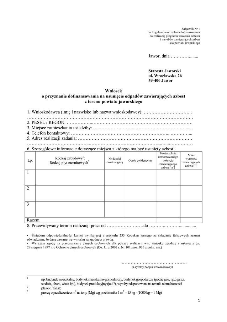Załącznik Nr 1 do Regulaminu udzielania dofinansowania na realizację programu usuwania azbestu i wyrobów zawierających azbest dla powiatu jaworskiego Jawor, dnia …………........ Starosta Jaworski ul. Wrocławska 26 59-400 Jawor Wniosek o przyznanie dofinansowania na usunięcie odpadów zawierających azbest z terenu powiatu jaworskiego 1. Wnioskodawca (imię i nazwisko lub nazwa wnioskodawcy): ………………………….. ………………………………………………………………………………………………. 2. PESEL / REGON: ……………..………………………………………………………… 3. Miejsce zamieszkania / siedziby: …..…………………...……………………………...... 4. Telefon kontaktowy: ………………………………………………………...…………... 5. Adres realizacji zadania: ………………………………………………………………… …………………………………...………………………………………..…....…………… 6. Szczegółowe informacje dotyczące miejsca z którego ma być usunięty azbest: 1 Lp. Rodzaj zabudowy : Rodzaj płyt eternitowych2: Nr działki ewidencyjnej Obręb ewidencyjny Powierzchnia demontowanego pokrycia zawierającego azbest [m2] Masa wyrobów zawierających azbest [t]3 1 2 3 Razem 8. Przewidywany termin realizacji prac: od ……………………do ………..………............... • Świadom odpowiedzialności karnej wynikającej z artykułu 233 Kodeksu karnego za składanie fałszywych zeznań oświadczam, że dane zawarte we wniosku są zgodne z prawdą. • Wyrażam zgodę na przetwarzanie danych osobowych dla potrzeb realizacji ww. wniosku zgodnie z ustawą z dn. 29 sierpnia 1997 r. o Ochronie danych osobowych (Dz. U. z 2002 r. Nr 101, poz. 926 z późn. zm.) ……………………………………. (Czytelny podpis wnioskodawcy) 1 2 3 np. budynek mieszkalny, budynek mieszkalno-gospodarczy, budynek gospodarczy (podać jaki, np.: garaż, stodoła, obora, wiata itp.), budynek produkcyjny (jaki?), wyroby zdeponowane na terenie nieruchomości płaskie / faliste proszę o przeliczenie z m2 na tony (Mg) wg przelicznika 1 m2 – 15 kg - (1000 kg = 1 Mg) 1 Załączniki: 1. Kserokopię dokumentu potwierdzającego, że wnioskodawca jest właścicielem nieruchomości lub dysponuje nieruchomością na podstawie zawartej z właścicielem umowy. 2. W przypadku budynków będących przedmiotem współwłasności – zgoda wszystkich współwłaścicieli na wykonanie prac związanych z usuwaniem odpadów niebezpiecznych zawierających azbest, oraz upoważnienie dla wnioskodawcy do występowania w imieniu wszystkich współwłaścicieli. 3. W przypadku posiadania innego tytułu prawnego do nieruchomości, niż własność, należy dołączyć zgodę właściciela nieruchomości. 4. Pozwolenie na budowę (rozbiórkę) lub potwierdzenie przyjęcia zgłoszenia przez właściwy organ administracji architektoniczno-budowlanej (starostę). 5. Ocena stanu i możliwości bezpiecznego użytkowania wyrobów zawierających azbest zgodnie z rozporządzeniem Ministra Gospodarki, Pracy i Polityki Społecznej z dnia 2 kwietnia 2004 r. w sprawie sposobów i warunków bezpiecznego użytkowania i usuwania wyrobów zawierających azbest (Dz. U. Nr 71, poz. 649 z późn. zm.). 6. Informacja o wyrobach zawierających azbest zgodnie z rozporządzeniem Ministra Gospodarki z dnia 13 grudnia 2010 r. w sprawie wymagań w zakresie wykorzystywania wyrobów zawierających azbest oraz wykorzystywania i oczyszczania instalacji lub urządzeń, w których były lub są wykorzystywane wyroby zawierające azbest (Dz. U. z 2011 r. Nr 8, poz. 31). 2