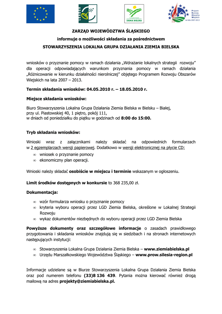 ZARZĄD WOJEWÓDZTWA ŚLĄSKIEGO informuje o możliwości składania za pośrednictwem STOWARZYSZENIA LOKALNA GRUPA DZIAŁANIA ZIEMIA BIELSKA wniosków o przyznanie pomocy w ramach działania „Wdrażanie lokalnych strategii rozwoju” dla operacji odpowiadających warunkom przyznania pomocy w ramach działania „Różnicowanie w kierunku działalności nierolniczej” objętego Programem Rozwoju Obszarów Wiejskich na lata 2007 – 2013. Termin składania wniosków: 04.05.2010 r. – 18.05.2010 r. Miejsce składania wniosków: Biuro Stowarzyszenia Lokalna Grupa Działania Ziemia Bielska w Bielsku – Białej, przy ul. Piastowskiej 40, 1 piętro, pokój 111, w dniach od poniedziałku do piątku w godzinach od 8:00 do 15:00. Tryb składania wniosków: Wnioski wraz z załącznikami należy składać na odpowiednich formularzach w 2 egzemplarzach wersji papierowej. Dodatkowo w wersji elektronicznej na płycie CD: • • wniosek o przyznanie pomocy ekonomiczny plan operacji. Wnioski należy składać osobiście w miejscu i terminie wskazanym w ogłoszeniu. Limit środków dostępnych w konkursie to 368 235,00 zł. Dokumentacja: • • • wzór formularza wniosku o przyznanie pomocy kryteria wyboru operacji przez LGD Ziemia Bielska, określone w Lokalnej Strategii Rozwoju wykaz dokumentów niezbędnych do wyboru operacji przez LGD Ziemia Bielska Powyższe dokumenty oraz szczegółowe informacje o zasadach prawidłowego przygotowania i składania wniosków znajdują się w siedzibach i na stronach internetowych następujących instytucji: • • Stowarzyszenia Lokalna Grupa Działania Ziemia Bielska – www.ziemiabielska.pl Urzędu Marszałkowskiego Województwa Śląskiego – www.prow.silesia-region.pl Informacje udzielane są w Biurze Stowarzyszenia Lokalna Grupa Działania Ziemia Bielska oraz pod numerem telefonu (33)8 136 439. Pytania można kierować również drogą mailową na adres [email protected].
