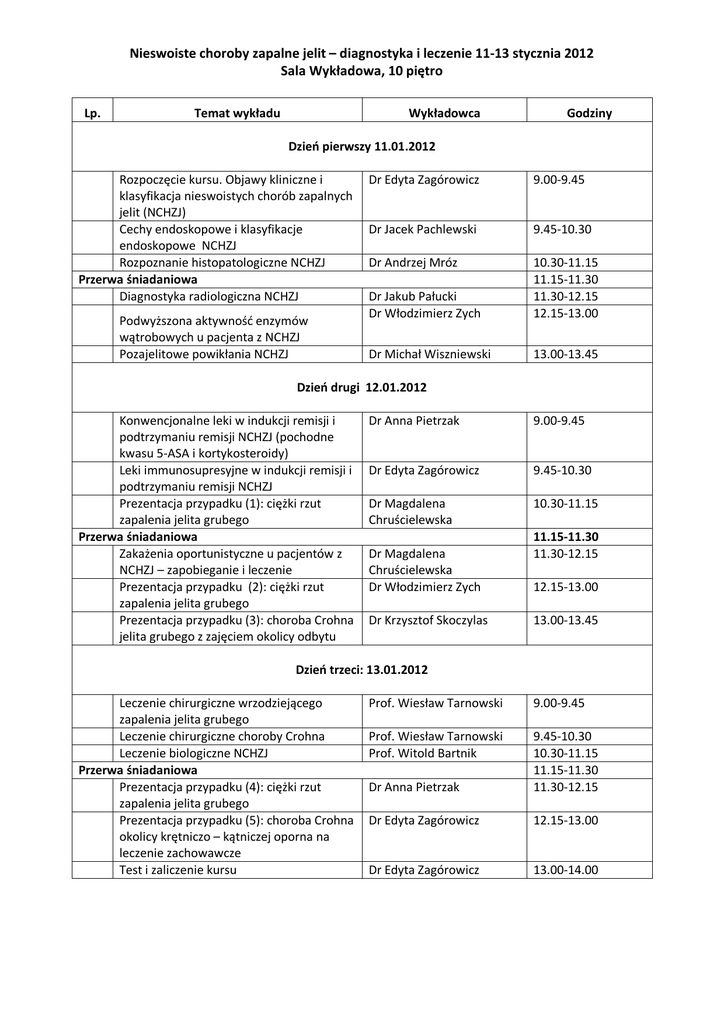 Nieswoiste choroby zapalne jelit – diagnostyka i leczenie 11-13 stycznia 2012 Sala Wykładowa, 10 piętro Lp. Temat wykładu Wykładowca Godziny Dzień pierwszy 11.01.2012 Rozpoczęcie kursu. Objawy kliniczne i klasyfikacja nieswoistych chorób zapalnych jelit (NCHZJ) Cechy endoskopowe i klasyfikacje endoskopowe NCHZJ Rozpoznanie histopatologiczne NCHZJ Przerwa śniadaniowa Diagnostyka radiologiczna NCHZJ Podwyższona aktywność enzymów wątrobowych u pacjenta z NCHZJ Pozajelitowe powikłania NCHZJ Dr Edyta Zagórowicz 9.00-9.45 Dr Jacek Pachlewski 9.45-10.30 Dr Andrzej Mróz Dr Jakub Pałucki Dr Włodzimierz Zych 10.30-11.15 11.15-11.30 11.30-12.15 12.15-13.00 Dr Michał Wiszniewski 13.00-13.45 Dzień drugi 12.01.2012 Konwencjonalne leki w indukcji remisji i podtrzymaniu remisji NCHZJ (pochodne kwasu 5-ASA i kortykosteroidy) Leki immunosupresyjne w indukcji remisji i podtrzymaniu remisji NCHZJ Prezentacja przypadku (1): ciężki rzut zapalenia jelita grubego Przerwa śniadaniowa Zakażenia oportunistyczne u pacjentów z NCHZJ – zapobieganie i leczenie Prezentacja przypadku (2): ciężki rzut zapalenia jelita grubego Prezentacja przypadku (3): choroba Crohna jelita grubego z zajęciem okolicy odbytu Dr Anna Pietrzak 9.00-9.45 Dr Edyta Zagórowicz 9.45-10.30 Dr Magdalena Chruścielewska 10.30-11.15 Dr Magdalena Chruścielewska Dr Włodzimierz Zych Dr Krzysztof Skoczylas 11.15-11.30 11.30-12.15 12.15-13.00 13.00-13.45 Dzień trzeci: 13.01.2012 Leczenie chirurgiczne wrzodziejącego zapalenia jelita grubego Leczenie chirurgiczne choroby Crohna Leczenie biologiczne NCHZJ Przerwa śniadaniowa Prezentacja przypadku (4): ciężki rzut zapalenia jelita grubego Prezentacja przypadku (5): choroba Crohna okolicy krętniczo – kątniczej oporna na leczenie zachowawcze Test i zaliczenie kursu Prof. Wiesław Tarnowski 9.00-9.45 Prof. Wiesław Tarnowski Prof. Witold Bartnik Dr Anna Pietrzak 9.45-10.30 10.30-11.15 11.15-11.30 11.30-12.15 Dr Edyta Zagórowicz 12.15-13.00 Dr Edyta Zagórowicz 13.00-14.00