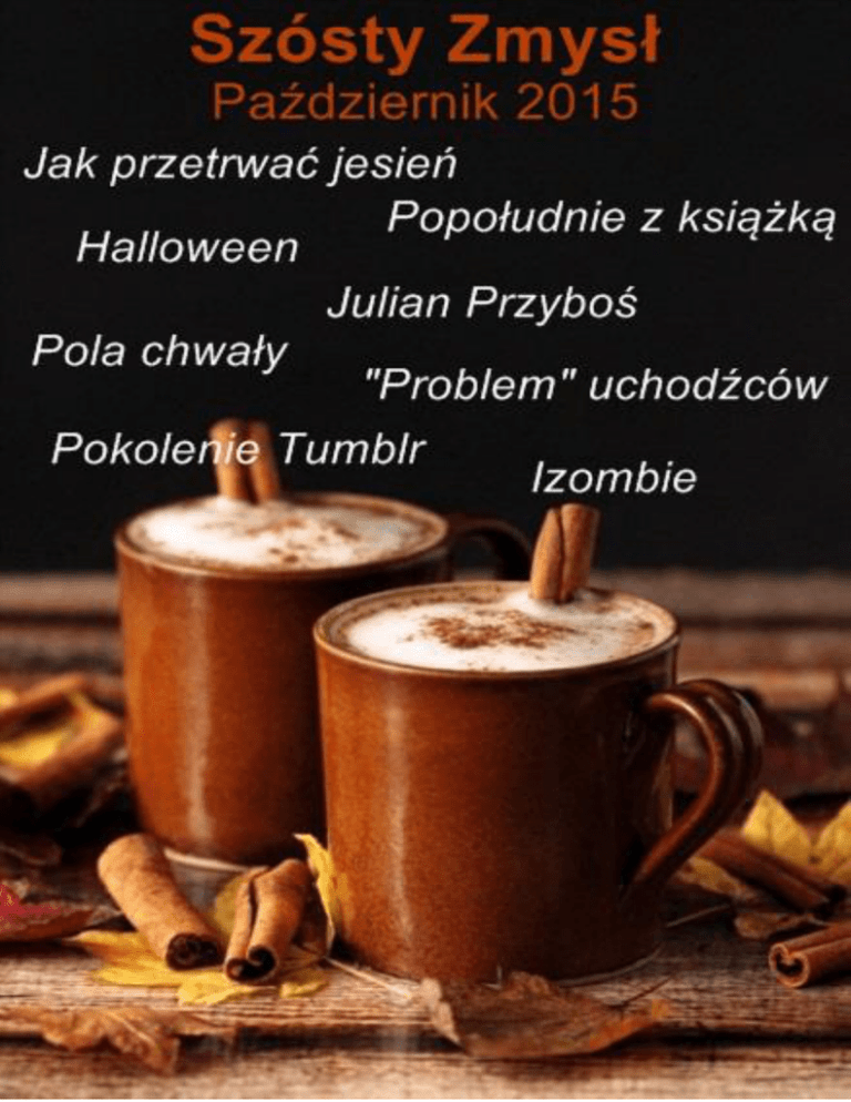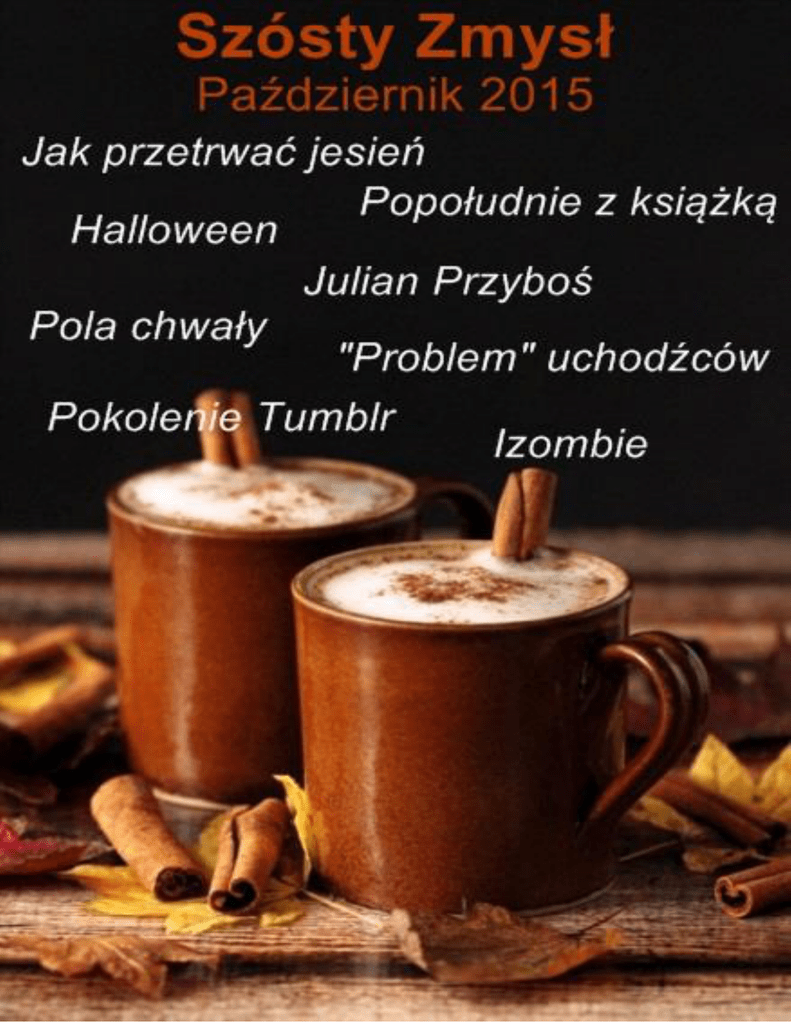 Szósty ZmysŁ SPIS TREŚCI: Jak przetrwać jesień – str. 3 Recenzja Izombie – str. 9 Popołudnie z książką – str. 14 Julian Przyboś – str. 22 Halloween – str. 23 „Problem” uchodźców – str. 27 Pokolenie Tumblr – str. 29 Pola chwały – str. 33 str. 2 Szósty ZmysŁ Jak przetrwać jesień? Słońce coraz prędzej chowa się za horyzontem, dni stają się ponure, a przejmujący chłód wdziera się pod nasze płaszcze. Kochani, jak nic nadeszła jesień! To czas, gdy nawet największe wesołki zakładają na twarz ponure maski, a wulkany tryskające do tej pory energią, wegetują całymi dniami na kanapie niczym stare koty. „A to wszystko przez paskudną jesień!”. O nie, moi drodzy czytelnicy, to zupełnie nie tak. Prawda jest taka, że złote liście nie mają nic do waszego rozleniwienia. Pragnę wam teraz przedstawić dziesięć wspaniałych sposobów na to, aby moja ukochana pora roku stała się również dla was przyjemnym okresem. 1. Raz zimno raz ciepło Jak wiemy, początki jesieni bywają ciężkie i przerażeni porannym chłodem, jesteśmy zmuszeni przez resztę dnia nosić pod pachą zimowe kurtki, w których po południu dosłownie idzie się ugotować. Jak temu zapobiec? Wystarczy założyć ciepły sweter pod lekki jesienny płaszcz, zapewniam, że to w zupełności wystarczy. str. 3 Szósty ZmysŁ 2. Czerwień, brąz i złoto Kolorowe liście ścielące brukowane ulice miasta grubym dywanem to idealna sceneria na długi spacer z dłońmi wciśniętymi w kieszenie lub oplecionymi wokół kubka z gorącą herbatą. Wirujące w powietrzu liście i chłód delikatnie szczypiący policzki to coś naprawdę wspaniałego. str. 4 Szósty ZmysŁ Coś na gorąco Gorąca czekolada, smakowa herbata czy kawa zabarwiona rozmaitymi dodatkami? Jak to mówią „Do wyboru do koloru”. Każdy znajdzie coś dla siebie w przytulnej kawiarni, z nosem przyklejonym do szyby, za która miasto tętni życiem. Idealny pomysł dla tych, którzy lubią spotkania na mieście, nie ryzykując przy tym utraty cennego ciepła. 3. Słodka nuta W Krakowie możemy znaleźć całą masę cukierni, piekarni i sklepików z różnego rodzaju słodkościami. Jak wszyscy dobrze wiemy już mała ilość cukru może skutecznie poprawić nam humor, a dodatkowe kalorie wyposażą nas w energię do walki ze spadającą temperaturą str. 5 Szósty ZmysŁ 4. Trochę ruchu Poranny jogging, wizyta na siłowni lub chwila tańca przy ulubionym kawałku są jak najbardziej wskazane. Ćwiczenia poprawiają nastój i jednocześnie pomagają utrzymaćformę. Wystarczy odrobina wysiłku, aby rozgrzać się i przygotować na kolejną dawkę chłodnego wiatru. 5. Porządki Już najwyższa pora, aby schować na strych cienkie bluzeczki i krótkie spodenki, a zrobić miejsce kolorowym swetrom, długim rękawom i wełnianym szalikom. Sprzątanie szafy to świetne zajęcie na nudne popołudnia i idealny pretekst do punktu siódmego. str. 6 Szósty ZmysŁ 6. Zakupy Zapewniam, że wasze ulubione sklepy zostały już wyposażone w tony ciepłych ubrań na jesienną pluchę. Już najwyższa pora kupić nowe buty na sezon jesienno-zimowy, kilka dodatkowych swetrów czy puchatych skarpet doskonałych na leniwe weekendy. 7. Bez światła ani rusz Dość powszechnym faktem jest to, że brak światła powoduje złe samopoczucie, a czasami nawet depresję. Aby naładować się energia słoneczna na cały dzień proponuję poranne spacery, a w czasie lekcji wybieranie miejsc przy oknach tak, aby mieć dostęp do cennych promieni. Oczywiste jest to, że nadarzą się pochmurne dni, w czasie których musimy sobie jakoś radzić. W takim przypadku dobrym pomysłem jest spędzanie czasu w dobrze naświetlonym pokoju lub (jeśli ktoś ma taka możliwość) przy trzaskających w kominku płomieniach. 8. Coś od siebie Aby pobudzić do działania szare komórki spróbuj coś namalować, napisać lub skomponować. Takie działania świetnie pochłaniają czas i dają wielka satysfakcję z naszej ciężkiej pracy. str. 7 Szósty ZmysŁ 9. Na koniec dnia Po ciężkim dniu, spędzonym na wykonywaniu wszystkich punktów z naszej wspaniałej listy, należy się odpowiednio zrelaksować. Miły wieczór z książka w ręce lub przed telewizorem to świetny plan. Do tego ciepły kocyk, trochę łakoci i coś ciepłego… ahh! Nic tylko zazdrościć! Przedstawiłam wam tylko kilka pomysłów na jesienną nudę, każdy z nich możecie rozwinąć lub dopasować do własnych upodobań. Możliwości jest nieskończenie wiele! Jesień - z jednej strony chłodna i niedostępna, a z drugiej kolorowa i zachęcająca do tak wielu wspaniałych zajęć - ma w sobie coś niesamowitego. Mam nadzieję, że otworzyłam wam oczy na cuda słotnej jesieni. ~Invi str. 8 Szósty ZmysŁ źródło zdjęć: Tumblr str. 9 Szósty ZmysŁ Nasza recenzja - iZombie Wstęp Zombie. Dla jednych fascynacja dla drugich niezrozumiały fenomen. Żywe trupy będące od wielu lat na topie zagościły na dobre w popkulturze czy to jako klasyki horroru typu Noc Żywych Trupów czy dobrze przyjęty przez widzów The Walking Dead. Czy można wnieść coś innowacyjnego do tematu umarlaków? Nowy serial iZombie amerykańskiej stacji The CW pokazuje, że tak. str. 10 Szósty ZmysŁ Zamysł iZombie oparty jest na komiksie pod tym samym tytułem wydanym przez Vertigo, będącym marką wydawniczą DC Comics, pod której szyldem wydano takie komiksy jak „V jak Vendetta” czy „Sandman”. Autorami komiksu są Chris Roberson i Micheal Allred. Twórcą serialu jest Rob Thomas mający na swoim koncie dobrze przyjętą produkcje „Veronica Mars” będąca serialem kryminalnym skierowanym do młodzieży. Pomimo wspólnego tytułu mamy tutaj raczej luźną adaptacje niż trzymanie się pierwowzoru. Znaczącym modyfikacjom poddano bohaterów i tak np. główną protagonistkę z Gwen Dylan przemianowano na Olive Moore („Live More”, jest to specjalna gra słów twórców) oraz
