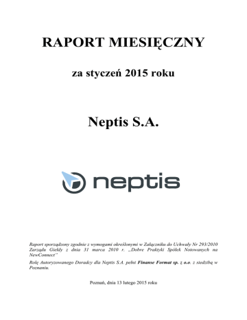 RAPORT MIESIĘCZNY za styczeń 2015 roku Neptis S.A. Raport sporządzony zgodnie z wymogami określonymi w Załączniku do Uchwały Nr 293/2010 Zarządu Giełdy z dnia 31 marca 2010 r. „Dobre Praktyki Spółek Notowanych na NewConnect” Rolę Autoryzowanego Doradcy dla Neptis S.A. pełni Finanse Format sp. z o.o. z siedzibą w Poznaniu. Poznań, dnia 13 lutego 2015 roku Raport miesięczny Neptis Spółka Akcyjna – styczeń 2015 roku 1. Informacje na temat wystąpienia tendencji i zdarzeń w otoczeniu rynkowym emitenta, które w ocenie emitenta mogą mieć w przyszłości istotne skutki dla kondycji finansowej oraz wyników finansowych emitenta. W styczniu 2015 roku, produkty Emitenta otrzymały aż 8 nominacji w prestiżowych rankingach wyróżniających największe osiągnięcia w branży technologii mobilnych: Mobile Trends Awards 2014, Mobility Trends 2014, CHIP Produkt Roku 2015- organizatorem Gali Mobility Trends jest MIT MEDIA Group wydawca wiodącego magazynu mobilnych technologii „Mobility”. Podczas uroczystości zostaną wręczone nagrody „Złoty BELL” za najlepsze produkty i usługi, a także produkty związane z branżą telekomunikacyjną i nowoczesnymi technologiami. Przyłączając się do 23. Finału WOŚP, Yanosik dołączył do grona osób wystawiających na aukcje charytatywne osobiste i z jakichś względów cenne dla siebie przedmioty. W przypadku Yanosika – wybór padł na samochód pamiętający całą historię Yanosika – pierwszy Yanosikowy patrol, który towarzyszył mu od samego początku. Wystawiony na aukcję Chrysler PT Cruiser ma wartość podwójnie kolekcjonerską - wyposażony jest w pierwszy, kolekcjonerski okaz komunikatora Yanosik. Dodatkowo Emitent zorganizował akcję dla WOŚP pod nazwą „Wrzuć piątaka”- zebrano 9300 zł. Dodatkowo zespół Yanosika, w styczniu utworzył vloga „Dzieye się”, aby społeczność Yanosika miała lepszy dostęp do kontaktu z jego twórcami. Videoblog informuje o nowościach, odpowiada na pytania i uwagi użytkowników. W dużej mierze poruszane są ważne tematy dla odbiorców. Pełni funkcję edukacyjną, wizerunkową i społecznościową. 2. Zestawienie wszystkich informacji opublikowanych przez emitenta w trybie raportu bieżącego i raportu okresowego w okresie objętym raportem. Emitent opublikował w miesiącu styczniu 2015 roku następujące raporty: a) raporty bieżące EBI 14 stycznia 2015 roku – Harmonogram publikowania raportów okresowych w 2015 roku. 14 stycznia 2015 roku – Raport miesięczny – grudzień 2014 roku. b) raporty okresowe EBI Emitent nie publikował w tym czasie raportów. c) raporty bieżące ESPI 21 stycznia 2015 roku – Zawiadomienie o transakcjach zakupu akcji Neptis S.A. przez Przewodniczącego Rady Nadzorczej. 3. Informacje na temat realizacji celów emisji, jeżeli taka realizacja, choćby w części, miała miejsce w okresie objętym raportem. Emitent w ciągu ostatnich 12 miesięcy nie przeprowadził subskrypcji akcji. str. 1 Raport miesięczny Neptis Spółka Akcyjna – styczeń 2015 roku 4. Kalendarz inwestora, obejmujący wydarzenia mające mieć miejsce w miesiącu marcu 2015 roku, które dotyczą emitenta i są istotne z punktu widzenia interesów inwestorów, w szczególności daty publikacji raportów okresowych, planowanych walnych zgromadzeń, otwarcia subskrypcji, spotkań z inwestorami lub analitykami, oraz oczekiwany termin publikacji raportu analitycznego. Do 14 marca 2015 roku – Publikacja raportu miesięcznego za miesiąc luty 2015 roku str. 2