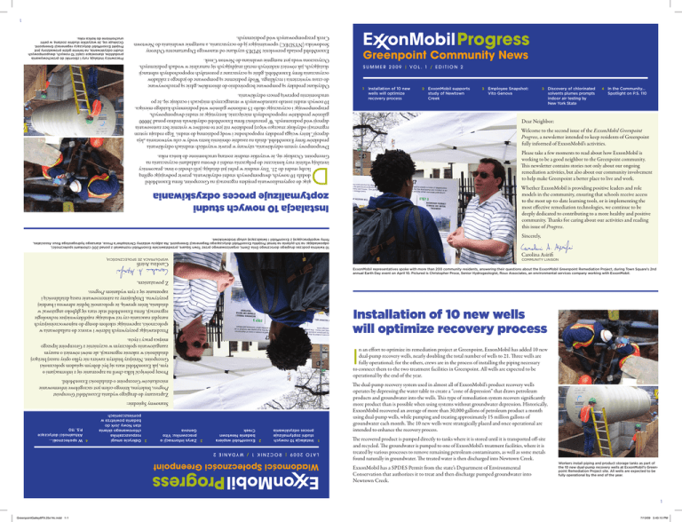 GreenpointGalley6F9.25x14c.indd 1-1 7/13/09 3:43:15 PM 1 ExxonMobil has a SPDES Permit from the state’s Department of Environmental Conservation that authorizes it to treat and then discharge pumped groundwater into Newtown Creek. The recovered product is pumped directly to tanks where it is stored until it is transported off-site and recycled. The groundwater is pumped to one of ExxonMobil’s treatment facilities, where it is treated by various processes to remove remaining petroleum contaminants, as well as some metals found naturally in groundwater. The treated water is then discharged into Newtown Creek. Workers install piping and product storage tanks as part of the 10 new dual-pump recovery wells at ExxonMobil’s Greenpoint Remediation Project site. All wells are expected to be fully operational by the end of the year. The dual-pump recovery system used in almost all of ExxonMobil’s product recovery wells operates by depressing the water table to create a “cone of depression” that draws petroleum products and groundwater into the wells. This type of remediation system recovers significantly more product than is possible when using systems without groundwater depression. Historically, ExxonMobil recovered an average of more than 30,000 gallons of petroleum product a month using dual-pump wells, while pumping and treating approximately 15 million gallons of groundwater each month. The 10 new wells were strategically placed and once operational are intended to enhance the recovery process. Wiadomości Społeczności Greenpoint L ato 2 0 0 9 | R o c z n i k 1 / W y da n i e 2 1 Instalacja 10 nowych studni zoptymalizuje proces odzyskiwania 2 ExxonMobil wspiera badanie Newtown Creek 3 Zarys informacji o pracowniku: Vito Genova 3 Odkrycie smugi rozpuszczalnika chlorowanego skłania stan Nowy Jork do badania powietrza w pomieszczeniach 4 W społecznoś ci... Aktualności dotycza˛ce P.S. 110 Szanowny Sąsiedzie: Zapraszamy do drugiego wydania ExxonMobil Greenpoint Progress, biuletynu, którego celem jest szczegółowe informowanie mieszkańców Greenpoint o działalności ExxonMobil. n an effort to optimize its remediation project at Greenpoint, ExxonMobil has added 10 new dual-pump recovery wells, nearly doubling the total number of wells to 21. Three wells are fully operational; for the others, crews are in the process of installing the piping necessary to connect them to the two treatment facilities in Greenpoint. All wells are expected to be operational by the end of the year. Proszę poświęcić kilka chwil na zapoznanie się z informacjami o tym, jak ExxonMobil stara się być dobrym sąsiadem społeczności Greenpoint. Niniejszy biuletyn zawiera nie tylko opisy naszej bieżącej działalności w zakresie regeneracji, ale mówi również o naszym zaangażowaniu społecznym w uczynienie z Greenpoint lepszego miejsca pracy i życia. I Installation of 10 new wells will optimize recovery process Przedstawiając pozytywnych liderów i wzorce do naśladowania w społeczności, zapewniając szkołom dostęp do najnowocześniejszych narzędzi nauczania czy też wdrażając najefektywniejsze technologie regeneracji, firma ExxonMobil stale stara się głęboko angażować w działania, które sprawią, że społeczność będzie zdrowsza i bardziej pozytywna. Dziękujemy za zainteresowanie naszą działalnością i zapoznanie się z tym wydaniem Progress. Z poważaniem, ExxonMobil representatives spoke with more than 200 community residents, answering their questions about the ExxonMobil Greenpoint Remediation Project, during Town Square’s 2nd annual Earth Day event on April 10. Pictured is Christopher Proce, Senior Hydrogeologist, Roux Associates, an environmental services company working with ExxonMobil. Carolina Asirifi Współpraca ze społecznościa˛ Community Liaison Carolina Asirifi 10 kwietnia podczas drugiego dorocznego Dnia Ziemi, organizowanego przez Town Square, przedstawiciele ExxonMobil rozmawiali z ponad 200 członkami społeczności, odpowiadaja˛c na ich pytania na temat Projektu ExxonMobil dotycza˛cego Regeneracji Greenpoint. Na zdje ˛ciu widzimy Christopher’a Proce, starszego hydrogeologa Roux Associates, firmy współpracuja˛cej z ExxonMobil i świadcza˛cej usługi środowiskowe. Sincerely, Whether ExxonMobil is providing positive leaders and role models in the community, ensuring that schools receive access to the most up-to-date learning tools, or is implementing the most effective remediation technologies, we continue to be deeply dedicated to contributing to a more healthy and positive community. Thanks for caring about our activities and reading this issue of Progress. Instalacja 10 nowych studni zoptymalizuje proces odzyskiwania D ążąc do zoptymalizowania projektu regeneracji na Greenpoint, firma ExxonMobil dodała 10 nowych, dwupompowych studni odzyskiwania, prawie podwajając ogólną liczbę studni do 21. Trzy studnie w pełni już działają; jeśli chodzi o inne, pracownicy instalują właśnie rury konieczne do połączenia studni z dwoma zakładami oczyszczania na Greenpoint. Oczekuje się, że wszystkie studnie zostaną uruchomione do końca roku. Please take a few moments to read about how ExxonMobil is working to be a good neighbor to the Greenpoint community. This newsletter contains stories not only about our ongoing remediation activities, but also about our community involvement to help make Greenpoint a better place to live and work. Dwupompowy system odzyskiwania, używany w prawie wszystkich studniach odzyskiwania produktów firmy ExxonMobil, działa na zasadzie obniżenia lustra wody w celu wytworzenia „leja depresji”, który wciąga produkty ropopochodne i wodę podziemną do studni. Tego rodzaju system regeneracji odzyskuje znacząco więcej produktów niż jest to możliwe w systemie bez zastosowania depresji wód podziemnych. W przeszłości firma ExxonMobil odzyskiwała średnio ponad 30000 galonów produktów ropopoch
