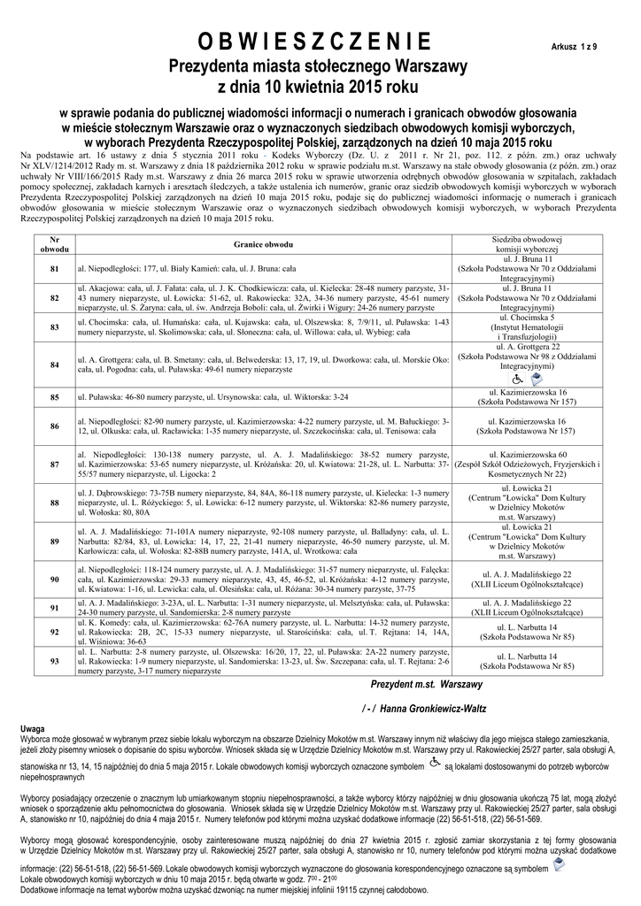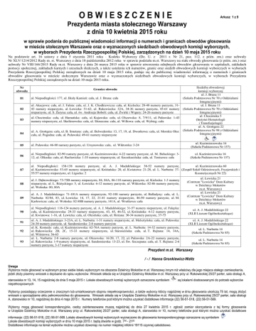 OBWIESZCZENIE Arkusz 1 z 9 Prezydenta miasta stołecznego Warszawy z dnia 10 kwietnia 2015 roku w sprawie podania do publicznej wiadomości informacji o numerach i granicach obwodów głosowania w mieście stołecznym Warszawie oraz o wyznaczonych siedzibach obwodowych komisji wyborczych, w wyborach Prezydenta Rzeczypospolitej Polskiej, zarządzonych na dzień 10 maja 2015 roku Na podstawie art. 16 ustawy z dnia 5 stycznia 2011 roku - Kodeks Wyborczy (Dz. U. z 2011 r. Nr 21, poz. 112, z późn. zm.) oraz uchwały Nr XLV/1214/2012 Rady m. st. Warszawy z dnia 18 października 2012 roku w sprawie podziału m.st. Warszawy na stałe obwody głosowania (z późn. zm.) oraz uchwały Nr VIII/166/2015 Rady m.st. Warszawy z dnia 26 marca 2015 roku w sprawie utworzenia odrębnych obwodów głosowania w szpitalach, zakładach pomocy społecznej, zakładach karnych i aresztach śledczych, a także ustalenia ich numerów, granic oraz siedzib obwodowych komisji wyborczych w wyborach Prezydenta Rzeczypospolitej Polskiej zarządzonych na dzień 10 maja 2015 roku, podaje się do publicznej wiadomości informację o numerach i granicach obwodów głosowania w mieście stołecznym Warszawie oraz o wyznaczonych siedzibach obwodowych komisji wyborczych, w wyborach Prezydenta Rzeczypospolitej Polskiej zarządzonych na dzień 10 maja 2015 roku. Nr obwodu Granice obwodu Siedziba obwodowej komisji wyborczej ul. J. Bruna 11 (Szkoła Podstawowa Nr 70 z Oddziałami Integracyjnymi) ul. J. Bruna 11 (Szkoła Podstawowa Nr 70 z Oddziałami Integracyjnymi) ul. Chocimska 5 (Instytut Hematologii i Transfuzjologii) ul. A. Grottgera 22 (Szkoła Podstawowa Nr 98 z Oddziałami Integracyjnymi) 81 al. Niepodległości: 177, ul. Biały Kamień: cała, ul. J. Bruna: cała 82 ul. Akacjowa: cała, ul. J. Fałata: cała, ul. J. K. Chodkiewicza: cała, ul. Kielecka: 28-48 numery parzyste, 3143 numery nieparzyste, ul. Łowicka: 51-62, ul. Rakowiecka: 32A, 34-36 numery parzyste, 45-61 numery nieparzyste, ul. S. Żaryna: cała, ul. św. Andrzeja Boboli: cała, ul. Żwirki i Wigury: 24-26 numery parzyste 83 ul. Chocimska: cała, ul. Humańska: cała, ul. Kujawska: cała, ul. Olszewska: 8, 7/9/11, ul. Puławska: 1-43 numery nieparzyste, ul. Skolimowska: cała, ul. Słoneczna: cała, ul. Willowa: cała, ul. Wybieg: cała 84 ul. A. Grottgera: cała, ul. B. Smetany: cała, ul. Belwederska: 13, 17, 19, ul. Dworkowa: cała, ul. Morskie Oko: cała, ul. Pogodna: cała, ul. Puławska: 49-61 numery nieparzyste 85 ul. Puławska: 46-80 numery parzyste, ul. Ursynowska: cała, ul. Wiktorska: 3-24 ul. Kazimierzowska 16 (Szkoła Podstawowa Nr 157) 86 al. Niepodległości: 82-90 numery parzyste, ul. Kazimierzowska: 4-22 numery parzyste, ul. M. Bałuckiego: 312, ul. Olkuska: cała, ul. Racławicka: 1-35 numery nieparzyste, ul. Szczekocińska: cała, ul. Tenisowa: cała ul. Kazimierzowska 16 (Szkoła Podstawowa Nr 157) 87 al. Niepodległości: 130-138 numery parzyste, ul. A. J. Madalińskiego: 38-52 numery parzyste, ul. Kazimierzowska 60 ul. Kazimierzowska: 53-65 numery nieparzyste, ul. Króżańska: 20, ul. Kwiatowa: 21-28, ul. L. Narbutta: 37- (Zespół Szkół Odzieżowych, Fryzjerskich i 55/57 numery nieparzyste, ul. Ligocka: 2 Kosmetycznych Nr 22) 88 ul. J. Dąbrowskiego: 73-75B numery nieparzyste, 84, 84A, 86-118 numery parzyste, ul. Kielecka: 1-3 numery nieparzyste, ul. L. Różyckiego: 5, ul. Łowicka: 6-12 numery parzyste, ul. Wiktorska: 82-86 numery parzyste, ul. Wołoska: 80, 80A 89 ul. A. J. Madalińskiego: 71-101A numery nieparzyste, 92-108 numery parzyste, ul. Balladyny: cała, ul. L. Narbutta: 82/84, 83, ul. Łowicka: 14, 17, 22, 21-41 numery nieparzyste, 46-50 numery parzyste, ul. M. Karłowicza: cała, ul. Wołoska: 82-88B numery parzyste, 141A, ul. Wrotkowa: cała 90 al. Niepodległości: 118-124 numery parzyste, ul. A. J. Madalińskiego: 31-57 numery nieparzyste, ul. Falęcka: cała, ul. Kazimierzowska: 29-33 numery nieparzyste, 43, 45, 46-52, ul. Króżańska: 4-12 numery parzyste, ul. Kwiatowa: 1-16, ul. Lewicka: cała, ul. Olesińska: cała, ul. Różana: 30-34 numery parzyste, 37-75 91 92 93 ul. A. J. Madalińskiego: 3-23A, ul. L. Narbutta: 1-31 numery nieparzyste, ul. Melsztyńska: cała, ul. Puławska: 24-30 numery parzyste, ul. Sandomierska: 2-8 numery parzyste ul. K. Komedy: cała, ul. Kazimierzowska: 62-76A numery parzyste, ul. L. Narbutta: 14-32 numery parzyste, ul. Rakowiecka: 2B, 2C, 15-33 numery nieparzyste, ul. Starościńska: cała, ul. T. Rejtana: 14, 14A, ul. Wiśniowa: 36-63 ul. L. Narbutta: 2-8 numery parzyste, ul. Olszewska: 16/20, 17, 22, ul. Puławska: 2A-22 numery parzyste, ul. Rakowiecka: 1-9 numery nieparzyste, ul. Sandomierska: 13-23, ul. Św. Szczepana: cała, ul. T. Rejtana: 2-6 numery parzyste, 3-17 numery nieparzyste ul. Łowicka 21 (Centrum "Łowicka" Dom Kultury w Dzielnicy Mokotów m.st. Warszawy) ul. Łowicka 21 (Centrum "Łowicka" Dom Kultury w Dzielnicy Mokotów m.st. Warszawy) ul. A. J. Madalińskiego 22 (XLII Liceum Ogólnokształcące) ul. A. J. Madalińskiego 22 (XLII Liceum Ogólnokształcące) ul. L. Narbutta 14 (Szkoła Podstawowa Nr 85) ul. L. Narbutta 14 (Szkoła Podstawowa Nr 85) Prezydent m.st. Warszawy / - / Hanna Gronkiewicz-Waltz Uwaga Wyborca może głosować w wybranym przez siebie lokalu wyborczym na obszarze Dzielnicy Mokotów m.st. Warszawy innym niż właściwy dla jego miejsca stałego zamieszkania, jeżeli złoży pisemny wniosek o dopisanie do spisu wyborców. Wniosek składa się w Urzędzie Dzielnicy Mokotów m.st. Warszawy przy ul. Rakowieckiej 25/27 parter, sala obsługi A, stanowiska nr 13, 14, 15 najpóźniej do dnia 5 maja 2015 r. Lokale obwodowych komisji wyborczych oznaczone symbolem niepełnosprawnych są lokalami dostosowanymi do potrzeb wyborców Wyborcy posiadający orzeczenie o znacznym lub umiarkowanym stopniu niepełnosprawności, a także wyborcy którzy najpóźniej w dniu głosowania ukończą 75 lat, mogą złożyć wniosek o sporządzenie aktu pełnomocnictwa 
