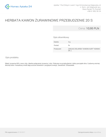 Apteka " Pod Złotym Lwem" mgr M.Konstancja Majewska, dr n. farm. Jan Majewski sp.j. Stary Rynek 75, Poznań +48 61 852 30 24 HERBATA KAWON ŻURAWINOWE PRZEBUDZENIE 20 S Cena: 10,95 PLN Opis słownikowy Dawka 3g Postać fix Producent ZAKŁAD ZIELARSKI "KAWON-HURT" NOWAK SP.J. Opis produktu Skład: żurawina-50%, owoc róży. Idealne połączenie żurawiny i róży. Polecane na przebudzenie i dobry początek dnia. Cudowny aromat, złocisty kolor i kwaskowy smak dają uczucie świeżości i przypływu energii. Zawartość: 20saszetek. Plik wygenerowano: 07-03-2017 Powered by TCPDF (www.tcpdf.org) Oprogramowanie sklepu: AptusShop