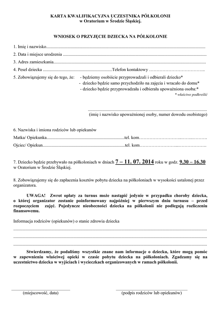 KARTA KWALIFIKACYJNA UCZESTNIKA PÓŁKOLONII w Oratorium w Środzie Śląskiej. WNIOSEK O PRZYJĘCIE DZIECKA NA PÓŁKOLONIE 1. Imię i nazwisko............................................................................................................................................... 2. Data i miejsce urodzenia ................................................................................................................................. 3. Adres zamieszkania......................................................................................................................................... 4. Pesel dziecka ..............................................................Telefon kontaktowy ……………………………….. 5. Zobowiązujemy się do tego, że: - będziemy osobiście przyprowadzali i odbierali dziecko* - dziecko będzie samo przychodziło na zajęcia i wracało do domu* - dziecko będzie przyprowadzała i odbierała upoważniona osoba:* * właściwe podkreślić ........................................................................................................... (imię i nazwisko upoważnionej osoby, numer dowodu osobistego) 6. Nazwiska i imiona rodziców lub opiekunów Matka/ Opiekunka......................................................................tel. kom………………………..……..………. Ojciec/ Opiekun..........................................................................tel. kom……………………...………………. 7. Dziecko będzie przebywało na półkoloniach w dniach 7 w Oratorium w Środzie Śląskiej. – 11. 07. 2014 roku w godz. 9.30 – 16.30 8. Zobowiązujemy się do zapłacenia kosztów pobytu dziecka na półkoloniach w wysokości ustalonej przez organizatora. UWAGA! Zwrot opłaty za turnus może nastąpić jedynie w przypadku choroby dziecka, o której organizator zostanie poinformowany najpóźniej w pierwszym dniu turnusu – przed rozpoczęciem zajęć. Pojedyncze nieobecności dziecka na półkolonii nie podlegają rozliczeniu finansowemu. Informacja rodziców (opiekunów) o stanie zdrowia dziecka .............................................................................................................................................................................. .............................................................................................................................................................................. .............................................................................................................................................................................. Stwierdzamy, że podaliśmy wszystkie znane nam informacje o dziecku, które mogą pomóc w zapewnieniu właściwej opieki w czasie pobytu dziecka na półkoloniach. Zgadzamy się na uczestnictwo dziecka w wyjściach i wycieczkach organizowanych w ramach półkolonii. (miejscowość, data) (podpis rodziców lub opiekunów)
