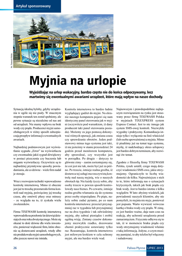 fot. Tixewash Polska Artykuł sponsorowany Zapraszamy na nowo otwartą myjnię przy ulicy Działkowej 31 w Warszawie Myjnia na urlopie Wyjeżdżając na urlop wakacyjny, bardzo często nie do końca odpoczywamy, lecz martwimy się ewentualnymi awariami urządzeń, które mają wpływ na nasze dochody. Sytuacją idealną byłoby, gdyby urządzenia w ogóle się nie psuły. W znacznym stopniu warunek ten został spełniony, ale pewne sytuacje są niezależne od nas ani od urządzeń. Nie mamy wpływu na brak wody czy prądu. Producenci myjni samoobsługowych w różny sposób zabezpieczają przepływ informacji o ewentualnych awariach. Najbardziej podstawowym jest wyświetlanie sygnału „Error” na wyświetlaczu czy ewentualnie jakiś sygnał dźwiękowy w postaci piszczenia czy buczenia lub miganie wyświetlaczy. Oczywiście są to najbardziej prymitywne sposoby powiadamiania, ale co dziwne – wiele firm nadal je stosuje. Wraz z rozwojem techniki wprowadzono kontrolę internetową. Mimo iż obecnie jest już to troszkę przestarzała forma kontroli nad myjnią, poświęcimy jej troszkę czasu, aby omówić plusy oraz minusy – ze względu na to, iż zyskała wielu zwolenników. Firma TIXEWASH kontrolę internetową wprowadziła na przełomie lat dziewięćdziesiątych oraz roku dwutysięcznego. Może się okazać to dość dziwne dla wielu inwestorów, ponieważ większość firm, które obecnie są dostawcami urządzeń, wtedy albo nie produkowała myjni samoobsługowych, albo jeszcze nawet nie istniała. 26 Kontrola internetowa to bardzo ładnie wyglądający gadżet do myjni. Na ekranie naszego komputera pojawi się nam identyczny panel sterowania jak w myjni (oczywiście pod warunkiem, iż dany producent taki panel sterowania posiada). Możemy za jego pomocą dokonywać różnych operacji, jak zmiana czasu czy sprawdzanie obrotów. Jeden podstawowy minus tego systemu jest taki, iż nie jesteśmy w stanie przesiedzieć 24 godzin przed monitorem komputera, aby sprawdzać, czy wszystko jest w porządku. Po drugie – dotyczy to głównie zimy – zanim zorientujemy się, że coś jest nie tak, może być już za późno. Po trzecie, istnieje realna groźba, iż dostawca tej usługi ma rzeczywistą kontrolę nad naszą myjnią, wie o naszych obrotach itp. Nie każdy życzy sobie, aby osoby trzecie w pewien sposób kontrolowały nasz biznes. Po czwarte, istnieje realna groźba włamania się do systemu przez osoby niepożądane. Po piąte, należy sobie zadać pytanie, po co nam kontrola internetowa: przecież przynajmniej raz w tygodniu lub przynajmniej raz na dwa tygodnie i tak odwiedzimy myjnię, aby zabrać pieniądze i zrobić ogólną wizję. Zmiany czasów dokonujemy niezwykle rzadko, dozowanie chemii praktycznie ustawiamy tylko raz. Reasumując, kontrola internetowa jest milowym krokiem w celu ochrony myjni, ale ma bardzo wiele wad. Najnowszym i prawdopodobnie najlepszym rozwiązaniem na rynku jest stosowany przez firmę TIXEWASH Polska w myjniach TIXEXPRESS system Express Contact. Jest to nic innego jak system SMS-owej kontroli. Niezwykle wygodny i praktyczny. Komunikacja istnieje tylko i wyłącznie na linii właściciel (lub osoba upoważniona) a myjnia. Mimo iż pisaliśmy już na temat tego systemu, myślę, iż nadchodzący okres urlopowy jest bardzo dobrym terminem, aby rozwinąć ów temat. Zgodnie z filozofią firmy TIXEWASH Polska, rynek ustalił, czego mają dotyczyć wiadomości SMS-owe, jakie otrzymujemy. Ograniczyło to liczbę wiadomości do kilku. Najważniejsze z nich to te, które informują nas o sytuacjach krytycznych, takich jak brak prądu czy brak wody. Jest to bardzo istotne z kilku względów. W lato: abyśmy wiedzieli, jak powiadomić naszych klientów, aby nie pomyśleli, że myjnia nie myje, ponieważ jest popsuta. Warto wywiesić wówczas kartkę o braku wody czy prądu. W zimę, co jest bardzo ważne, daje nam czas na reakcję, aby uchronić urządzenia przed zamarznięciem. Fizycznie odbywa się to tak, iż w momencie braku prądu czy wody otrzymujemy wiadomość właśnie z taką informacją. Jedyne, o czym musimy pamiętać, to aby telefon był włączony i naładowany. Paliwa Płynne lipIEC 2013 Artykuł sponsorowany Drugą bardzo ważną sprawą, jest to, iż SMS-em zostajemy powiadomieni również o stanie konta na daną chwilę. Odbywa się to w dwojaki sposób. Pierwszym podstawowym sposobem jest ustalenie na daną godzinę raportu kasowego, który wysyła nam myjnia. Mówiąc wprost, np. o godzinie 22.00 dostajemy raport, jakie mieliśmy w tym dniu obroty. Drugim sposobem jest poznanie obrotów na żądanie, co oznacza, iż w każdej chwili możemy „zapytać myjnię” za pośrednictwem wiadomości SMS, o ilość pieniędzy w danej chwili. Fizycznie wygląda to tak, iż wpisujemy komunikat z pytaniem i wysyłamy go przez SMS, a za chwilę otrzymujemy odpowiedź, ile mamy pieniędzy w danej chwili. Może to być pomocne w wielu sytuacjach, np. będąc na wczasach, chcemy wiedzieć, czy ludzie myją u nas auta. Wysyłamy jedno zapytanie rano o stan kasy, a dzięki raportowi kasowemu wiemy, czy myjnia pracuje dla nas, czy nie. Podobnie jest z powiadomieniami o sytuacjach krytycznych, możemy bardzo szybko zareagować, jeśli coś nie działa. Bardzo ważne jest również to, że jeśli nie chcemy mieć wiadomości dotyczących biznesu, ponieważ przebywamy na wakacjach, możemy to wyłączyć. Firma TIXEWASH Polska, zgodnie z wspomnianą wcześniej polityką, dopasowuje swoje urządzenia do potrzeb klientów, a nie do potrzeb marketingowych. Dzięki temu klienci, którzy zakupili urządzenia TIXEWASH, czują się w pełni usatysfakcjonowani. Dobra i skuteczna myjnia samoobsługowa to klucz do biznesu. Jeśli myjnia nie spełnia swojej roli w jakimkolwiek znaczeniu (np. nie posiada narzędzi, które pozwalają właścicielowi sprawować nad nią kontrolę), staje się przysłowiową „kulą u nogi”. Podsumowując, należy wspomnieć, iż