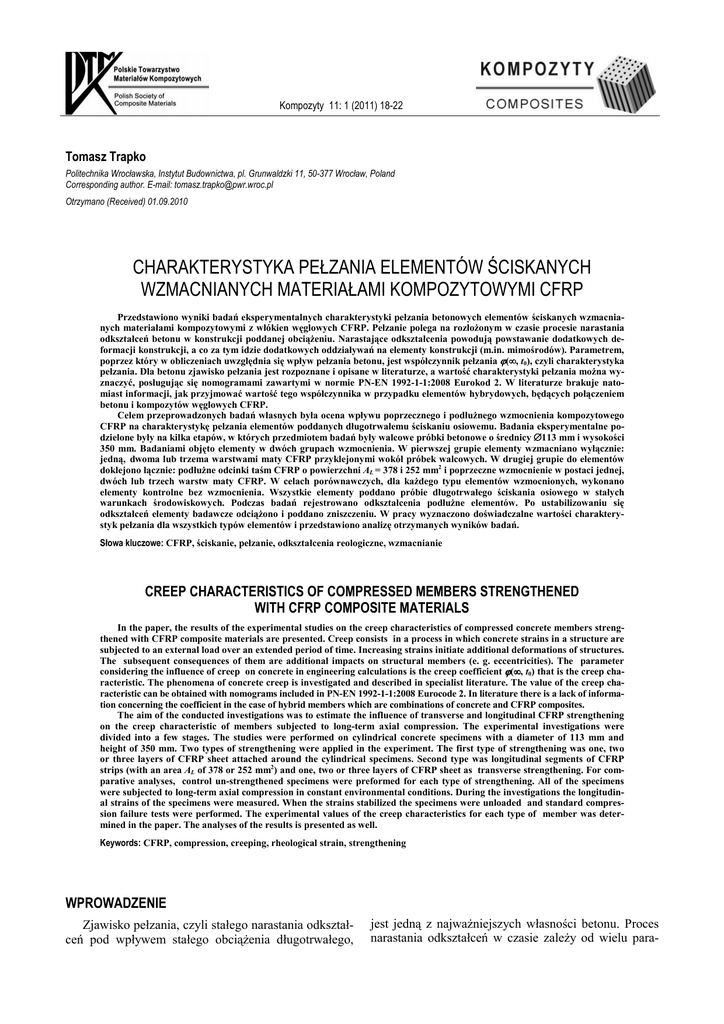 Kompozyty 11: 1 (2011) 18-22 Tomasz Trapko Politechnika Wrocławska, Instytut Budownictwa, pl. Grunwaldzki 11, 50-377 Wrocław, Poland Corresponding author. E-mail: [email protected] Otrzymano (Received) 01.09.2010 CHARAKTERYSTYKA PEŁZANIA ELEMENTÓW ŚCISKANYCH WZMACNIANYCH MATERIAŁAMI KOMPOZYTOWYMI CFRP Przedstawiono wyniki badań eksperymentalnych charakterystyki pełzania betonowych elementów ściskanych wzmacnianych materiałami kompozytowymi z włókien węglowych CFRP. Pełzanie polega na rozłoŜonym w czasie procesie narastania odkształceń betonu w konstrukcji poddanej obciąŜeniu. Narastające odkształcenia powodują powstawanie dodatkowych deformacji konstrukcji, a co za tym idzie dodatkowych oddziaływań na elementy konstrukcji (m.in. mimośrodów). Parametrem, poprzez który w obliczeniach uwzględnia się wpływ pełzania betonu, jest współczynnik pełzania ϕ(∞ ∞, t0), czyli charakterystyka pełzania. Dla betonu zjawisko pełzania jest rozpoznane i opisane w literaturze, a wartość charakterystyki pełzania moŜna wyznaczyć, posługując się nomogramami zawartymi w normie PN-EN 1992-1-1:2008 Eurokod 2. W literaturze brakuje natomiast informacji, jak przyjmować wartość tego współczynnika w przypadku elementów hybrydowych, będących połączeniem betonu i kompozytów węglowych CFRP. Celem przeprowadzonych badań własnych była ocena wpływu poprzecznego i podłuŜnego wzmocnienia kompozytowego CFRP na charakterystykę pełzania elementów poddanych długotrwałemu ściskaniu osiowemu. Badania eksperymentalne podzielone były na kilka etapów, w których przedmiotem badań były walcowe próbki betonowe o średnicy ∅113 mm i wysokości 350 mm. Badaniami objęto elementy w dwóch grupach wzmocnienia. W pierwszej grupie elementy wzmacniano wyłącznie: jedną, dwoma lub trzema warstwami maty CFRP przyklejonymi wokół próbek walcowych. W drugiej grupie do elementów doklejono łącznie: podłuŜne odcinki taśm CFRP o powierzchni AL = 378 i 252 mm2 i poprzeczne wzmocnienie w postaci jednej, dwóch lub trzech warstw maty CFRP. W celach porównawczych, dla kaŜdego typu elementów wzmocnionych, wykonano elementy kontrolne bez wzmocnienia. Wszystkie elementy poddano próbie długotrwałego ściskania osiowego w stałych warunkach środowiskowych. Podczas badań rejestrowano odkształcenia podłuŜne elementów. Po ustabilizowaniu się odkształceń elementy badawcze odciąŜono i poddano zniszczeniu. W pracy wyznaczono doświadczalne wartości charakterystyk pełzania dla wszystkich typów elementów i przedstawiono analizę otrzymanych wyników badań. Słowa kluczowe: CFRP, ściskanie, pełzanie, odkształcenia reologiczne, wzmacnianie CREEP CHARACTERISTICS OF COMPRESSED MEMBERS STRENGTHENED WITH CFRP COMPOSITE MATERIALS In the paper, the results of the experimental studies on the creep characteristics of compressed concrete members strengthened with CFRP composite materials are presented. Creep consists in a process in which concrete strains in a structure are subjected to an external load over an extended period of time. Increasing strains initiate additional deformations of structures. The subsequent consequences of them are additional impacts on structural members (e. g. eccentricities). The parameter considering the influence of creep on concrete in engineering calculations is the creep coefficient ϕ(∞ ∞, t0) that is the creep characteristic. The phenomena of concrete creep is investigated and described in specialist literature. The value of the creep characteristic can be obtained with nomograms included in PN-EN 1992-1-1:2008 Eurocode 2. In literature there is a lack of information concerning the coefficient in the case of hybrid members which are combinations of concrete and CFRP composites. The aim of the conducted investigations was to estimate the influence of transverse and longitudinal CFRP strengthening on the creep characteristic of members subjected to long-term axial compression. The experimental investigations were divided into a few stages. The studies were performed on cylindrical concrete specimens with a diameter of 113 mm and height of 350 mm. Two types of strengthening were applied in the experiment. The first type of strengthening was one, two or three layers of CFRP sheet attached around the cylindrical specimens. Second type was longitudinal segments of CFRP strips (with an area AL of 378 or 252 mm2) and one, two or three layers of CFRP sheet as transverse strengthening. For comparative analyses, control un-strengthened specimens were preformed for each type of strengthening. All of the specimens were subjected to long-term axial compression in constant environmental conditions. During the investigations the longitudinal strains of the specimens were measured. When the strains stabilized the specimens were unloaded and standard compression failure tests were performed. The experimental values of the creep characteristics for each type of member was determined in the paper. The analyses of the results is presented as well. Keywords: CFRP, compression, creeping, rheological strain, strengthening WPROWADZENIE Zjawisko pełzania, czyli stałego narastania odkształceń pod wpływem stałego obciąŜenia długotrwałego, jest jedną z najwaŜniejszych własności betonu. Proces narastania odkształceń w czasie zaleŜy od wielu para- Charakterystyka pełzania elementów ściskanych wzmacnianych materiałami kompozytowymi CFRP metrów, takich jak: skład mieszanki betonowej i właściwości jej składników, sposobu ułoŜenia i pielęgnacji betonu, wilgotności środowiska, poziomu obciąŜenia. Pełzanie ma istotne znaczenia przy projektowaniu elementów konstrukcyjnych z betonu. Wpływa na deformacje tych elementów oraz na końcową wartość modułu spręŜystości betonu, co uwzględniono w normie [1], wprowadzając tzw. efektywny moduł spręŜystości Ec,eff. Przy stałym poziomie napręŜeń w betonie moduł ten mo
