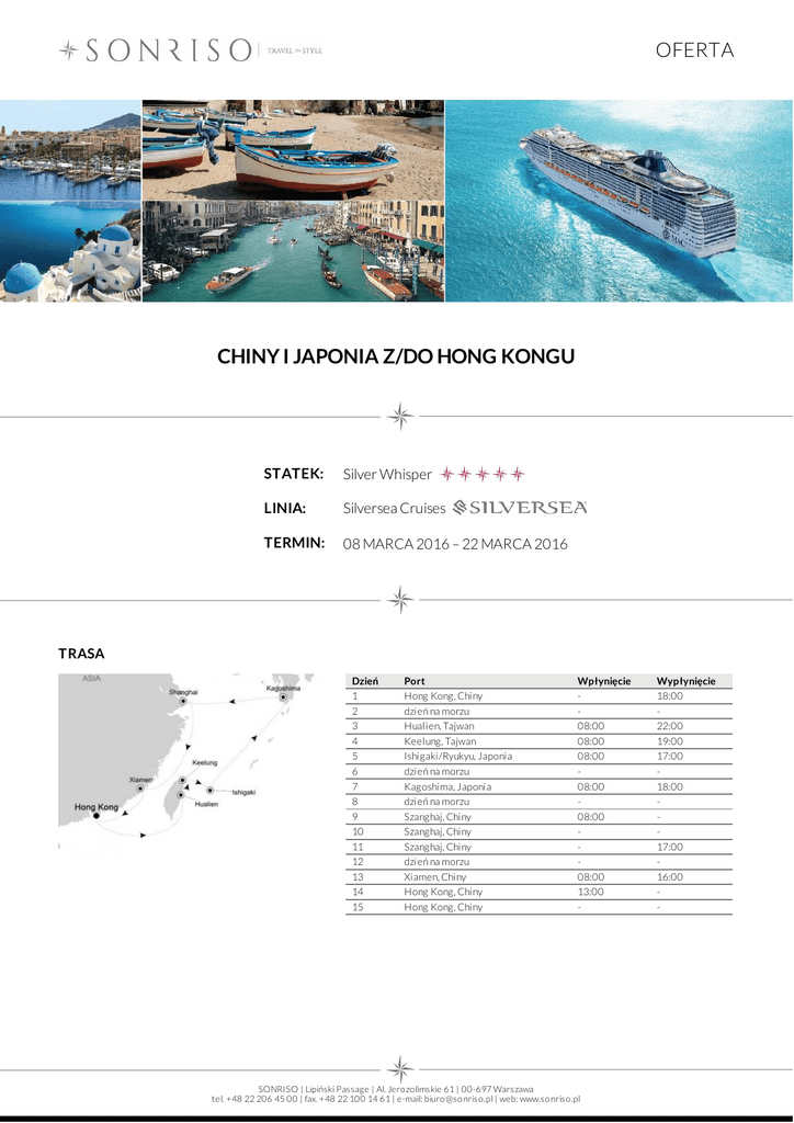 OFERTA CHINY I JAPONIA Z/DO HONG KONGU STATEK: Silver Whisper LINIA: Silversea Cruises TERMIN: 08 MARCA 2016 – 22 MARCA 2016 TRASA Dzień 1 2 3 4 5 6 7 8 9 10 11 12 13 14 15 Port Hong Kong, Chiny dzień na morzu Hualien, Tajwan Keelung, Tajwan Ishigaki/Ryukyu, Japonia dzień na morzu Kagoshima, Japonia dzień na morzu Szanghaj, Chiny Szanghaj, Chiny Szanghaj, Chiny dzień na morzu Xiamen, Chiny Hong Kong, Chiny Hong Kong, Chiny Wpłynięcie 08:00 08:00 08:00 08:00 08:00 08:00 13:00 - SONRISO | Lipiński Passage | Al. Jero zo limskie 61 | 00-697 Warszawa tel. +48 22 206 45 00 | fax. +48 22 100 14 61 | e-mail: biuro @so nriso .pl | web: www.so nriso .pl Wypłynięcie 18:00 22:00 19:00 17:00 18:00 17:00 16:00 - OFERTA CENA Typ kabiny Cena z osobę Vista Suite od 5 350 EUR Terrace Suite od 5 850 EUR Veranda Suite od 6 850 EUR Medallion Suite od 10 750 EUR CENA ZAWIERA DOTATKOWE OPŁATY zakwaterowanie w 2 - os apartamencie wybranej kategorii pełne wyżywienie: 3 posiłki, przekąski między posiłakmi, bufet o północy open bar: wybrane wina i szampany, alkohole premium, różnorodne kawy i herbaty, wodę mineralną butelkowaną, napoje bezalkoholowe oraz soki dostępne w barach i restauracjach korzystanie z mini baru w apartamencie serwis bagażowy podczas wejścia i zejścia ze statku obsługa kamerdynerska 24 godzinny serwis kabinowy korzystanie z urządzeń sportowo - rekreacyjnych dostępnych na pokładzie (baseny, jacuzzi, boiska sportowe, itp.) udział we wszystkich imprezach organizowanych na pokładzie (przedstawienia, pokazy, aukcje, animacje i inne) opłatę serwisową (napiwki) dla obsługi statku transfer pomiędzy portem a miastem (uzależniony od lokalnych przepisów) obowiązkowe opłaty portowe dojazd/przelot do portu rozpoczęcia i zakończenia rejsu transfery (lotnisko - port - lotnisko) ewentualne noclegi przed lub po rejsie wycieczki fakultatywne korzystanie z usług typu: SPA, salon piękności, pralnia itp. wydatki osobiste tj. zakupy w butikach, internet, kasyno itp. obowiązkowe ubezpieczenie turystyczne koszt wymaganych wiz ewentualna opłata paliwowa (linia w momencie wzrotu cen ropy zastrzega sobie prawo do dodania oplaty paliwowej do każdej rezerwacji) Na życzenie świadczymy dodatkowo usługi: rezerwacje hotelowe na całym świecie rezerwacje biletów lotniczych, trasferów oraz parkingu w porcie rezerwacje wycieczek fakultatywnych i innych atrakcji SONRISO | Lipiński Passage | Al. Jero zo limskie 61 | 00-697 Warszawa tel. +48 22 206 45 00 | fax. +48 22 100 14 61 | e-mail: biuro @so nriso .pl | web: www.so nriso .pl