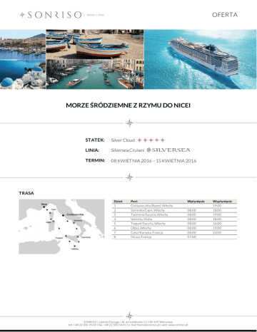 OFERTA MORZE ŚRÓDZIEMNE Z RZYMU DO NICEI STATEK: Silver Cloud LINIA: Silversea Cruises TERMIN: 08 KWIETNIA 2016 – 15 KWIETNIA 2016 TRASA Dzień 1 2 3 4 5 6 7 8 Port Civitavecchia (Rzym), Włochy Sorrento/Capri, Włochy Taormina/Sycylia, Włochy Valletta, Malta Trapani/Sycylia, Włochy Olbia, Włochy Calvi/Korsyka, Francja Nicea, Francja Wpłynięcie 08:00 08:00 08:00 08:00 08:00 08:00 07:00 SONRISO | Lipiński Passage | Al. Jero zo limskie 61 | 00-697 Warszawa tel. +48 22 206 45 00 | fax. +48 22 100 14 61 | e-mail: biuro @so nriso .pl | web: www.so nriso .pl Wypłynięcie 19:00 18:00 19:00 18:00 16:00 19:00 23:00 - OFERTA CENA Typ kabiny Cena z osobę Vista Suite od 2 650 EUR Veranda Suite od 3 350 EUR CENA ZAWIERA DOTATKOWE OPŁATY zakwaterowanie w 2 - os apartamencie wybranej kategorii pełne wyżywienie: 3 posiłki, przekąski między posiłakmi, bufet o północy open bar: wybrane wina i szampany, alkohole premium, różnorodne kawy i herbaty, wodę mineralną butelkowaną, napoje bezalkoholowe oraz soki dostępne w barach i restauracjach korzystanie z mini baru w apartamencie serwis bagażowy podczas wejścia i zejścia ze statku obsługa kamerdynerska 24 godzinny serwis kabinowy korzystanie z urządzeń sportowo - rekreacyjnych dostępnych na pokładzie (baseny, jacuzzi, boiska sportowe, itp.) udział we wszystkich imprezach organizowanych na pokładzie (przedstawienia, pokazy, aukcje, animacje i inne) opłatę serwisową (napiwki) dla obsługi statku transfer pomiędzy portem a miastem (uzależniony od lokalnych przepisów) obowiązkowe opłaty portowe dojazd/przelot do portu rozpoczęcia i zakończenia rejsu transfery (lotnisko - port - lotnisko) ewentualne noclegi przed lub po rejsie wycieczki fakultatywne korzystanie z usług typu: SPA, salon piękności, pralnia itp. wydatki osobiste tj. zakupy w butikach, internet, kasyno itp. obowiązkowe ubezpieczenie turystyczne koszt wymaganych wiz ewentualna opłata paliwowa (linia w momencie wzrotu cen ropy zastrzega sobie prawo do dodania oplaty paliwowej do każdej rezerwacji) Na życzenie świadczymy dodatkowo usługi: rezerwacje hotelowe na całym świecie rezerwacje biletów lotniczych, trasferów oraz parkingu w porcie rezerwacje wycieczek fakultatywnych i innych atrakcji SONRISO | Lipiński Passage | Al. Jero zo limskie 61 | 00-697 Warszawa tel. +48 22 206 45 00 | fax. +48 22 100 14 61 | e-mail: biuro @so nriso .pl | web: www.so nriso .pl