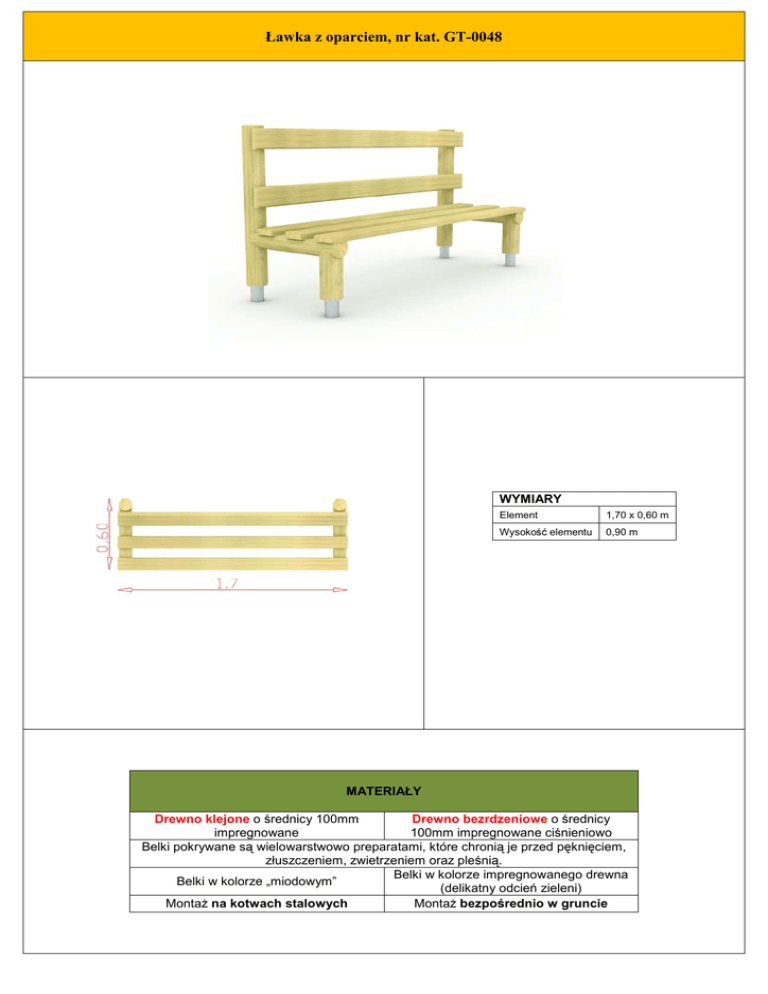 Ławka z oparciem, nr kat. GT-0048 WYMIARY Element 1,70 x 0,60 m Wysokość elementu 0,90 m MATERIAŁY Drewno klejone o średnicy 100mm Drewno bezrdzeniowe o średnicy impregnowane 100mm impregnowane ciśnieniowo Belki pokrywane są wielowarstwowo preparatami, które chronią je przed pęknięciem, złuszczeniem, zwietrzeniem oraz pleśnią. Belki w kolorze impregnowanego drewna Belki w kolorze „miodowym” (delikatny odcień zieleni) Montaż na kotwach stalowych Montaż bezpośrednio w gruncie