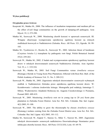Wykaz publikacji Oryginalne prace twórcze Kacprzak M., Mańka M., 2000. The influence of incubation temperature and medium pH on the effect of soil fungi communities on the growth of damping-off pathogens. Acta Mycol. 35, 2, 275-290. Mańka M., Szewczyk W., 2000. Monitoring chorób korzeni w uprawach sosnowych. III. Wstępne obserwacje występowania opieńkowej zgnilizny korzeni na róŜnych siedliskach borowych w Nadleśnictwie Zielonka. Rocz. AR Pozn. 321, Ogrodn. 30: 99103. Mańka M., Tyszkiewicz Z., Reszko K., Szewczyk W., 2002. Infection threat of hornbeam (Carpinus betulus L.) transplants by pathogenic root fungi. Polish Botanical Journal 47(2): 259-263. Szewczyk W., Mańka M., 2002. Z badań nad występowaniem opieńkowej zgnilizny korzeni drzew w młodych drzewostanach sosnowych Nadleśnictwa Zielonka. Acta Agrobot. Vol. 55, z. 1: 319-324. Szewczyk W., Mańka M., 2003. Soil Fungi Communities versus Armillaria ostoyae (Romagn.) Herink in Young Scots Pine Plantations Affected with Root Rot. Bull. of the Polish Academy of Sciences Vol. 51. No. 3: 209-212. Szewczyk W., Mańka M., 2003. ZagroŜenie młodych drzewostanów sosnowych wybranych siedlisk w Nadleśnictwie Zielonka przez opieńkową zgniliznę korzeni drzew. W: Kształtowanie i ochrona środowiska leśnego. Monografia pod redakcją Antoniego T. Milera. Wydawnictwo Akademii Rolniczej im. Augusta Cieszkowskiego w Poznaniu, Poznań 2003: 409-419. Szewczyk W., 2005. Monitoring Armillaria root rot in young (up to 20 yrs) Scots pine plantation in Zielonka Forest District. Acta Sci. Pol. Silv. Colendar. Rat. Ind. Lignar. 4(2) 2005, 91-100. Szewczyk W., 2005. The ability to grow the rhizomorphs by chosen Armillaria ostoyae (Romang.) isolates coming from the Zielonka Forest District area. Acta Sci. Pol. Silv. Colendar. Rat. Ind. Lignar. 4(2) 2005, 101-112. Mańka M., Szewczyk W., Kapral T., Starzec G., Miler T., Nawrot M., 2005. ZagroŜenie młodych drzewostanów sosnowych nadleśnictwa Doswiadzcalnego Siemianice przez infekcyjne choroby korzeni. Rocz. AR Pozn. CCCLXXI, Leśn. 43: 69-78. 2 Szewczyk W., 2006. Suitability of test tree method in assessment of threat to pine stands posed by Armillaria spp. Acta Sci. Pol., Silv. Colendar. Rat. Ind. Lignar. 5(2), 103-107. Szewczyk W., 2007. Endangerment of fir stands by root infection diseases beyond fir natural occurrence reach. Acta Sci. Pol., Silv. Colendar. Rat. Ind. Lignar. 6(1), 79-83. Szewczyk W., 2007. Occurrence of Heterobasidion annosum (fr.) Bref. In the roots of blown trees in Scots pine stands growing on post-agricultural soil of experimental forest district Zielonka.. Acta Sci. Pol., Silv. Colendar. Rat. Ind. Lignar. 6(3), 89-95. Szewczyk W., 2007. Soil Fungi Communities from young Scots pine plantations affected with root rot in Zielonka Experimental Forest District. Acta Mycol. 42 (2), 210-214. Prace konferencyjne Mańka M., Szewczyk W., 2002. Monitoring root rots in young Scots pine plantations (up to 20 years). W: Root and Butt Rots of Forest Trees, 10th International Conference on Root and Butt Rots, Proceedings of the IUFRO Working Party 7.02.01. Quebec City, Canada, September 16-22, 2001. Ed. G. Laflamme, J.A. Bérubé, G. Bussiéres. Laurentian Forestry Centre, Information Report, Natural Resources Canada, Canadian Forest Service: 383-387. Szewczyk W., Mańka M., 2005. Monitoring of root diseases in young (up to 20 years) Scots pine plantations in Zielonka Forest District. W:Root and Butt Rots of Forest Trees, 11 th International Conference on Root and Butt Rots, Proceedings of the IUFRO Working Party 7.02.01 Poznań and BiałowieŜa, Poland, August 16 – 22, 2004. Ed. M. Mańka and P. Łakomy. The August Cieszkowski Agricultural University Poznań, Poland 2005: 316-320. Oszako T., Olejarski I., Szewczyk W., 2005. Initiation of processes of transformation from post-agricultural to forest soil as a way to limit damage caused by Heterobasidion annosum. W:Root and Butt Rots of Forest Trees, 11 th International Conference on Root and Butt Rots, Proceedings of the IUFRO Working Party 7.02.01 Poznań and BiałowieŜa, Poland, August 16 – 22, 2004. Ed. M. Mańka and P. Łakomy. The August Cieszkowski Agricultural University Poznań, Poland 2005: 449-459. Szewczyk W., Lechtański Sz., 2007. Root deformation in young Scots pine stands theatened by root diseases. W: Root and butt rots of forest trees. 12th International Conference on Root and Butt Rots. IUFRO Working Party 7.02.01. 12th-19th August 2007 Berkeley, California - Medford, Oregon (USA). Conference proceedings. Eds. M. Garbelotto, P. Gonthier. University of California, Berkeley, USA: 147-151. 3 Mańka M., Szewczyk W., Wójcik A., 2008. Root diseases in Forest District Wołów Scots pine stands (up to 20 years) ten years after the 1997 flood. W: Root and butt rots of forest trees. 12th International Conference on Root and Butt Rots. IUFRO Working Party 7.02.01. 12th-19th August 2007 Berkeley, California - Medford, Oregon (USA). Conference proceedings. Eds. M. Garbelotto, P. Gonthier. University of California, Berkeley, USA: 147-151. Abstrakty z konferencji międzynarodowych Mańka M., Jańczyk J., Szewczyk W., Reszko K., 1999. Monitonng root diseases in young Scots pine (Pinus sylvestis L.) plantations. XIV International Plant Protection Congress (IPPC). Plant Protection Towards the Third Millenium Where Chemistry Meets Ecology. Jerusalem, Israel, July 25-30,1999. ABSTRACTS: 162. Mańka M., Szewczyk W., 1999. Preliminary results of root diseases monitoring in Scots pine plantations of Zielonka Forest District, on different coniferous forest sites. W: Scientific Symposium „Biodiversity in European Plant Pathology at the turn of the centuries" accompanying the X General Assembly of the PPS Members, Poznań 7-9.09.1999. Abstracts. Polish Phytopathological Society (PPS), Department of Phytopathology, August Cieszkowski University of Agriculture in Poznań. Poznań 1999: 94 Mańka M., Szewczyk W., 2001. Monitoring of