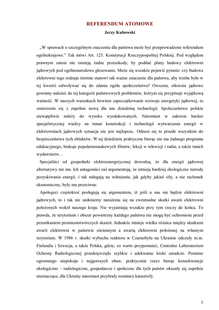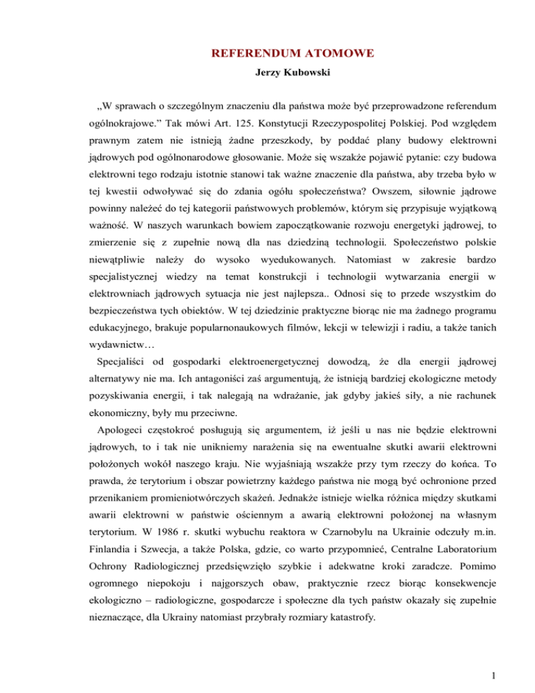 REFERENDUM ATOMOWE Jerzy Kubowski „W sprawach o szczególnym znaczeniu dla państwa może być przeprowadzone referendum ogólnokrajowe.” Tak mówi Art. 125. Konstytucji Rzeczypospolitej Polskiej. Pod względem prawnym zatem nie istnieją żadne przeszkody, by poddać plany budowy elektrowni jądrowych pod ogólnonarodowe głosowanie. Może się wszakże pojawić pytanie: czy budowa elektrowni tego rodzaju istotnie stanowi tak ważne znaczenie dla państwa, aby trzeba było w tej kwestii odwoływać się do zdania ogółu społeczeństwa? Owszem, siłownie jądrowe powinny należeć do tej kategorii państwowych problemów, którym się przypisuje wyjątkową ważność. W naszych warunkach bowiem zapoczątkowanie rozwoju energetyki jądrowej, to zmierzenie się z zupełnie nową dla nas dziedziną technologii. Społeczeństwo polskie niewątpliwie należy do wysoko wyedukowanych. Natomiast w zakresie bardzo specjalistycznej wiedzy na temat konstrukcji i technologii wytwarzania energii w elektrowniach jądrowych sytuacja nie jest najlepsza.. Odnosi się to przede wszystkim do bezpieczeństwa tych obiektów. W tej dziedzinie praktyczne biorąc nie ma żadnego programu edukacyjnego, brakuje popularnonaukowych filmów, lekcji w telewizji i radiu, a także tanich wydawnictw… Specjaliści od gospodarki elektroenergetycznej dowodzą, że dla energii jądrowej alternatywy nie ma. Ich antagoniści zaś argumentują, że istnieją bardziej ekologiczne metody pozyskiwania energii, i tak nalegają na wdrażanie, jak gdyby jakieś siły, a nie rachunek ekonomiczny, były mu przeciwne. Apologeci częstokroć posługują się argumentem, iż jeśli u nas nie będzie elektrowni jądrowych, to i tak nie unikniemy narażenia się na ewentualne skutki awarii elektrowni położonych wokół naszego kraju. Nie wyjaśniają wszakże przy tym rzeczy do końca. To prawda, że terytorium i obszar powietrzny każdego państwa nie mogą być ochronione przed przenikaniem promieniotwórczych skażeń. Jednakże istnieje wielka różnica między skutkami awarii elektrowni w państwie ościennym a awarią elektrowni położonej na własnym terytorium. W 1986 r. skutki wybuchu reaktora w Czarnobylu na Ukrainie odczuły m.in. Finlandia i Szwecja, a także Polska, gdzie, co warto przypomnieć, Centralne Laboratorium Ochrony Radiologicznej przedsięwzięło szybkie i adekwatne kroki zaradcze. Pomimo ogromnego niepokoju i najgorszych obaw, praktycznie rzecz biorąc konsekwencje ekologiczno – radiologiczne, gospodarcze i społeczne dla tych państw okazały się zupełnie nieznaczące, dla Ukrainy natomiast przybrały rozmiary katastrofy. 1 Doświadczamy obecnie ciężkiej awarii jądrowej w Japonii. Nie powstała ani z winy tzw. czynnika ludzkiego, ani błędu konstrukcyjnego, lecz wskutek niszczących sił natury; jej skala jest ogromna. Trzeba przyznać, iż nie miałaby tych rozmiarów, gdyby elektrownia nie była typu jądrowego. Elektrownia jądrowa posiada dwie niejako inherentne wady: produkuje pluton i jest narażona na awarię ze stopieniem się paliwa. Pierwsza, bezpośredniego wpływu na bezpieczeństwo nie ma. Natomiast druga stanowi wielką troskę producentów i wyzwanie dla konstruktorów reaktorów. Wyrazem tego są niebagatelne wydatki na urządzenia zabezpieczające w rozmiarze ok. 25 % kosztów inwestycji. Prawdopodobieństwo uszkodzenia rdzenia reaktora jest bardzo małe. Na przykład amerykańska Komisja ds. Ustawodawstwa Jądrowego wymaga, by częstość uszkodzeń reaktora wynosiła 1 na 10000 lat. Ponadto obowiązuje tam zasada, że skażenia powstałe wskutek awarii ze stopieniem się paliwa muszą się zawierać w granicach obiektu jądrowego, bez konieczności ewakuacji zamieszkałej wokół ludności. W celu spełnienia tych wymagań, w amerykańskich reaktorach III generacji stosuje się specjalny system chłodzenia stopionej masy paliwa (tzw. corium) wewnątrz zbiornika reaktora. W rozwiązaniach francuskich i rosyjskich natomiast pod reaktorem konstruuje się urządzenia (zbiorniki retencyjne) do akumulacji i schładzania corium. Ponadto nad reaktorami buduje się gazoszczelne obudowy bezpieczeństwa. Te kapitałochłonne środki służące niedopuszczeniu do awaryjnego uwolnienia się skażeń poza granice elektrowni wskazują, że producenci reaktorów możliwości stopienia się rdzenia nie wykluczają. Niezależnie od zabezpieczeń konstrukcyjnych, licząc się z ewentualnością powstania promieniotwórczych skażeń, wokół elektrowni jądrowej obowiązkowo tworzy się strefy bezpieczeństwa o rozmiarach zależnych od norm przyjętych w danym państwie. Wskutek wieloletnich zaniedbań w kształceniu inżynierów w zakresie energetyki jądrowej, kraj nasz w zasadzie jest pozbawiony własnej autorytatywnej kadry specjalistów, kompetentnej do zanalizowania projektu elektrowni pod względem bezpieczeństwa, a po jej wybudowaniu - do sprawowania nadzoru nad eksploatacją.. Do podjęcia decyzji o budowie, wyborze typu reaktora i ocenie jego bezpieczeństwa opinia własnych ekspertów jest absolutnie nieodzowna. Naprawienie powstałego stanu wymaga kilkuletnich wysiłków. Minister Hanna Trojanowska, pełnomocnik rządu ds. energetyki jądrowej, twierdzi, że wybudowanie elektrowni do 2020 r. to dla nas "imperatyw moralny”1. Nie ekonomiczny, lecz – moralny. Czy tego rodzaju kategoryczny nakaz, wywodzący się z etyki Immanuela Kanta, może 1 Gazeta Wyborcza z dn. 02.03.2011 (http://wyborcza.biz/biznes/1,101562,9186763,Kto_bedzie_budowal_elektrownie_jadrowe_.html) 2 zastąpić inżynierski racjonalizm myślenia o planach budowy energetyki jądrowej? Czy to oznacza, że elektrownię się zbuduje za wszelką cenę, nie zważając na koszty i ewentualny społeczny sprzeciw? Referenda na temat energii jądrowej przeprowadzane były w różnych krajach. Szwecja W marcu 1980 r., wkrótce po awarii amerykańskiej elektrowni Three Mile Island ze stopieniem się paliwa, władze Szwecji o