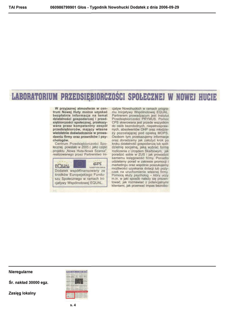 TAI Press 060986799901 Głos - Tygodnik Nowohucki Dodatek z dnia 2006-09-29 LABORATORIUM PRZEDSIĘBIORCZOŚCI SPOŁECZNE! W NOWEI HUCIE W przyjaznej atmosferze w centrum Nowej Huty można uzyskać bezpłatnie informacje na temat działalności gospodarczej i przedsiębiorczości społecznej, przekazywane przez kompetentny zespół przedsiębiorców, mający własne wieloletnie doświadczenie w prowadzeniu firmy oraz prawników i psychologów. Centrum Przedsiębiorczości Społecznej powstało w 2005 r. jako część projektu „Nowa Huta-Nowa Szansa", realizowanego przez Partnerstwo Ini- FOUAL ^^ Dodatek współfinansowany ze środków Europejskiego Funduszu Społecznego w ramach Inicjatywy Wspólnotowej EO.UAL Nieregularne Śr. nakład 30000 egz. Zasięg lokalny s. 4 cjatyw Nowohuckich w ramach programu Inicjatywy Wspólnotowej EO.UAL. Partnerem prowadzącym jest Instytut Przedsiębiorczości PRYMUS. Pomoc CPS skierowana jest przede wszystkim do osób bezrobotnych, niepełnosprawnych, absolwentów OHP oraz młodzieży pozostającej pod opieką MOPS. Osobom tym przekazujemy informacje oraz doradzamy jak założyć krok po kroku działalność gospodarczą lub spółdzielnię socjalną, jaką wybrać formę rozliczenia z Urzędem Skarbowym, jak poradzić sobie w ZUS i jak prowadzić samemu księgowość firmy. Ponadto udzielamy porad w zakresie promocji i marketingu oraz wspólnie poszukujemy możliwości uzyskania dotacji lub pożyczek na uruchomienie własnej firmy. Pomocą służy psycholog - który uczy m.in. w jaki sposób należy się prezentować, jak rozmawiać z potencjalnymi klientami, jak przerwać impas bezrobo- TAI Press 060986799902 Głos - Tygodnik Nowohucki Dodatek z dnia 2006-09-29 cia i odnaleźć się na otwartym rynku pracy. Informujemy naszych klientów o możliwościach, jakie daje zaangażowanie się w tworzenie spółdzielni socjalnych, nawiązujemy kontakty z już istniejącymi spółdzielniami oraz wspieramy osoby, które decydują się na otwarcie tego typu działalności. W CPS można skorzystać z komputera z dostępem do Intemetu, napisać CV czy list motywacyjny. Gdy osoby mają trudność w poszukiwaniu informacji w Intemecie - pomocą służą pracownicy CPS. Zadaniem CPS w projekcie jest opieka nad beneficjentami ostatecznymi programu, zatrudnionymi w utworzonych w projekcie Manufakturach Integracyjnych - laboratoriach przedsiębiorczości m.in. poprzez pomoc w rekrutacji pracowników oraz organizację indywidualnych konsultacji i szkoleń z zakresu przedsiębior- Nieregularne czości. Dotychczas w szkoleniach organizowanych przez CPS udział wzięło 50 osób. W okresie od kwietnia do sierpnia zorganizowano pierwszy cykl zajęć pt. „Jak założyć własną firmę", gdzie przedsiębiorcy poprzez wykłady i ćwiczenia starali się przybliżyć kursantom praktyczną wiedzę na temat zarządzania i prowadzenia własnej firmy. Kolejna edycja szkolenia planowana jest na drugą połowę października 2006 r. (o szczegóły proszę pytać pod numerem telefonu: 012425 03 88) Pracownicy Manufaktur Integracyjnych uczestniczą w organizowanym przez CPS szkoleniu z zakresu „Business English"; w czasie zajęć w formie speaking, reading, case study, uczestnicy poznają zasady organizacji firmy, prezentacji produktów czy procesu rekrutacji pracownika. Ponadto pracownicy CPS starają się aktywnie uczestniczyć i włączać w ini- l Hi|i|i»|:|i:il!ł1i|l'Mi:[.»Btlllil]M|l^llKI|.|l«.l..ll Śr. nakład 30000 egz. Zasięg lokalny s. 4 cjatywy lokalne NH. W sierpniu br. zorganizowaliśmy spotkanie otwarte dla społeczności lokalnej pn. „Zakładamy stowarzyszenie". Natomiast w najbliższy piąstek, 29 września będziemy udzielali informacji i porad podczas Pierwszych Ogólnopolskich Spotkań Ekonomii Społecznej, na stoisku zorganizowanym przez Partnerstwo Inicjatyw Nowohuckich. Dla potrzeb programu CPS współpracuje z Grodzkim Urzędem Pracy, Miejskim Ośrodkiem Pomocy Społecznej, Instytutem Spraw Publicznych Uniwersytetu Jagiellońskiego, Małopolską Szkołą Administracji Publicznej Akademii Ekonomicznej, Ośrodkiem Szkolenia i Wychowania OHP, „Głosem - Tygodnikiem Nowohuckim", Stowarzyszeniem „U Siemachy" i Stowarzyszeniem Pomocy Socjalnej „Gaudium et Spes". Opracowanie Anna Wilk